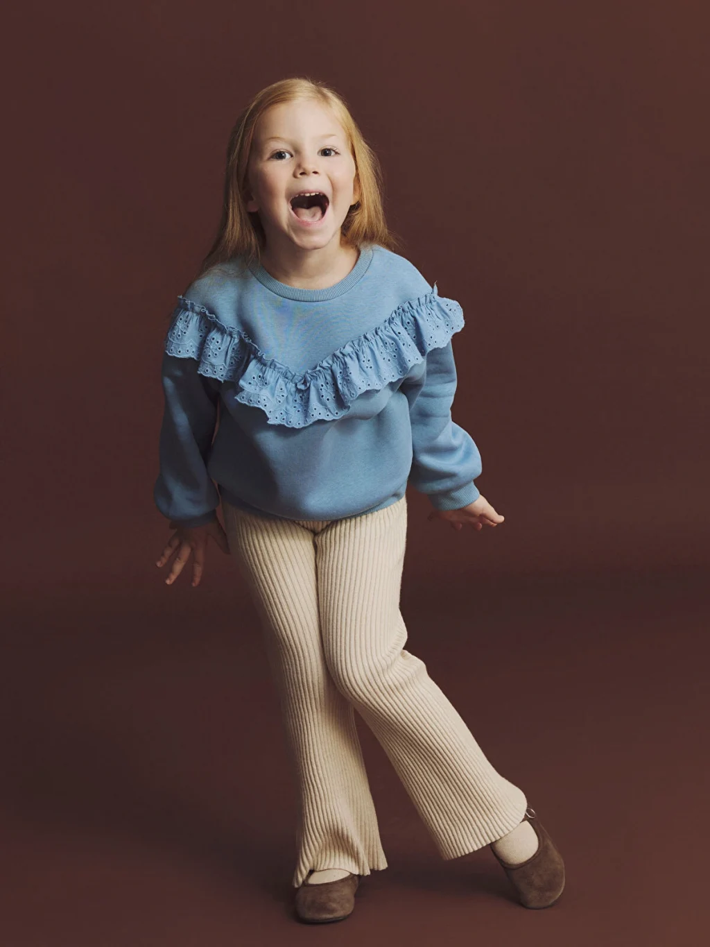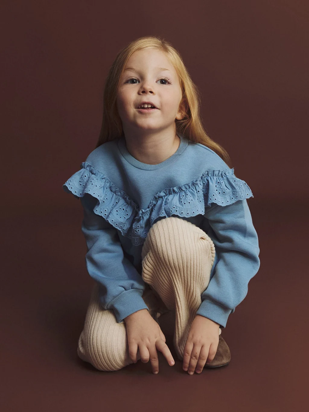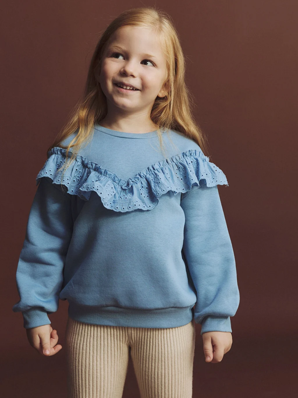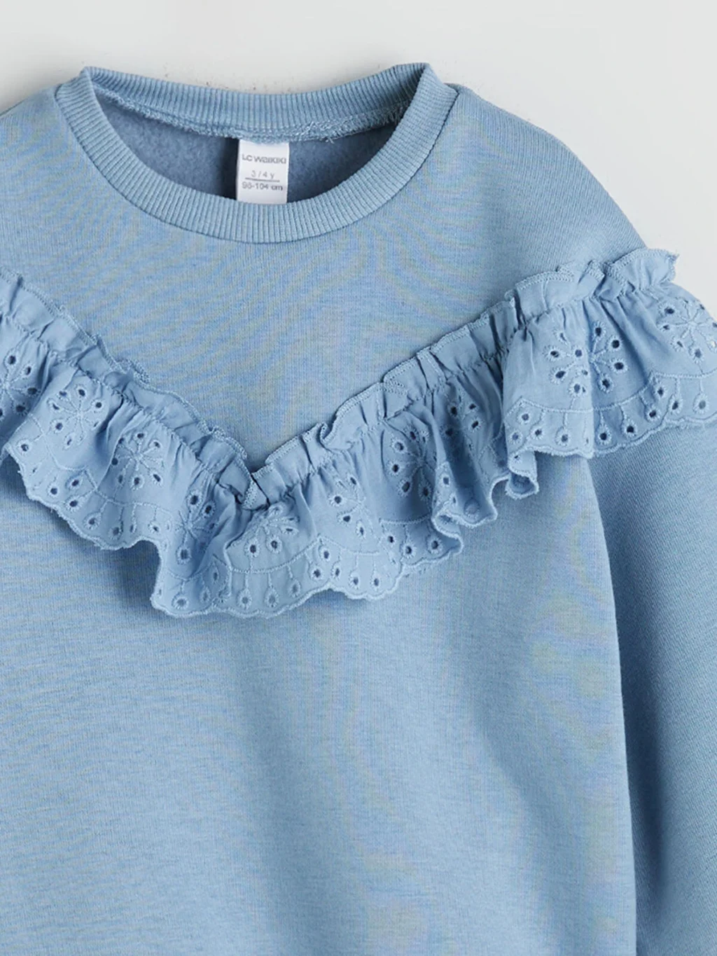 Bisiklet yaka ve uzun kollu kız çocuk sweatshirt. Göğüs kısmında V şeklinde fisto kumaştan fırfır detayı bulunur. Kol manşetleri ve etek ucu ribanalıdır.