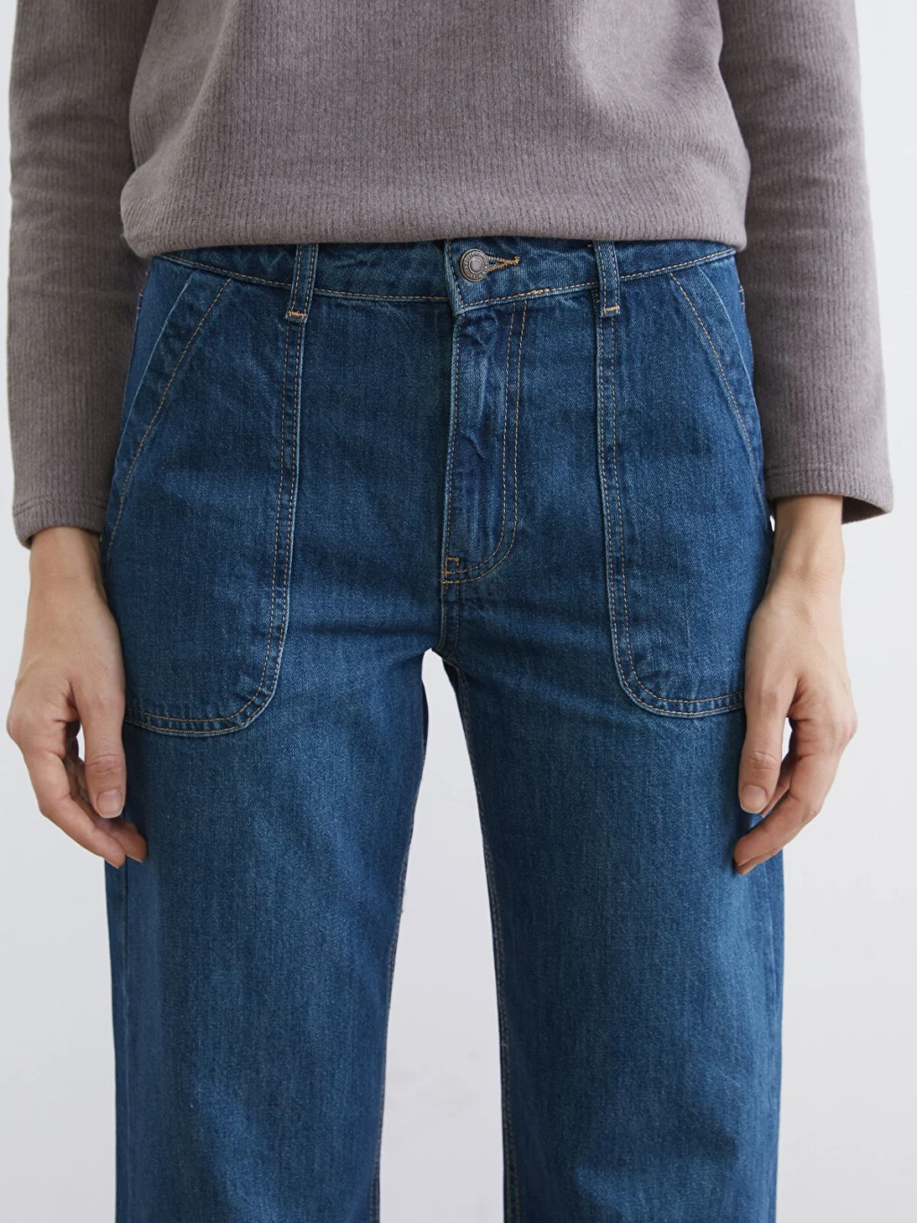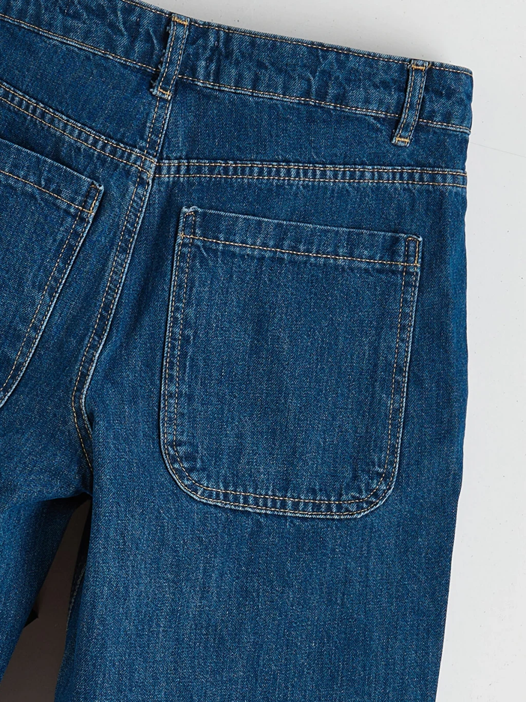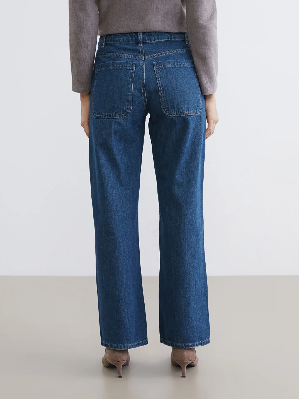 Yüksek bel, bol kesimli kadın jean pantolon, %100 pamuklu denim kumaştan üretilmiştir. Önü yama cepli, fermuar ve düğme kapamalıdır.