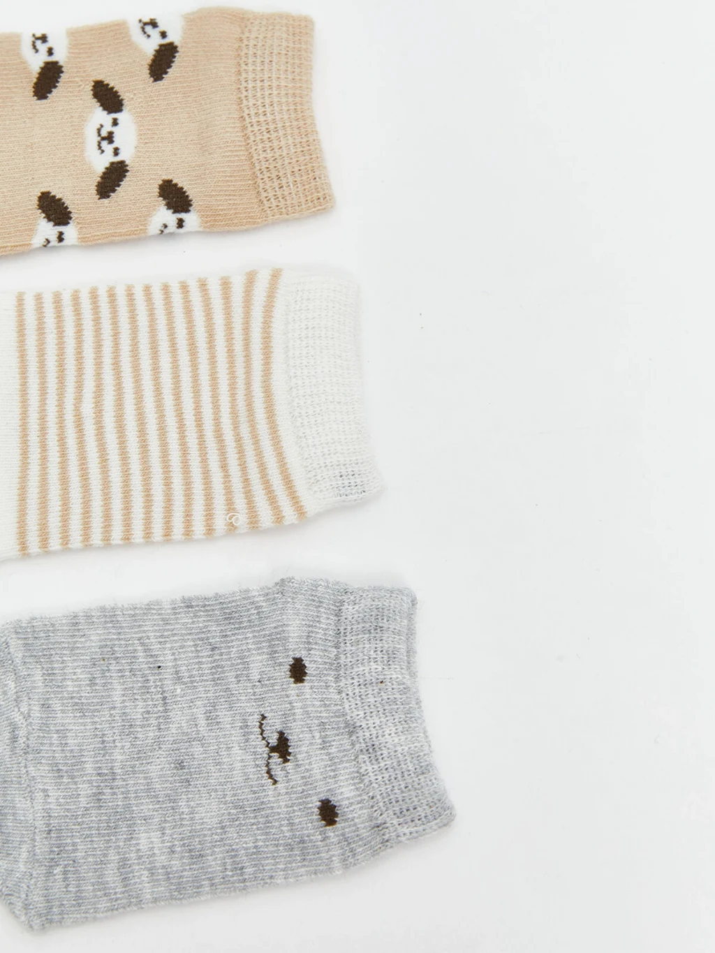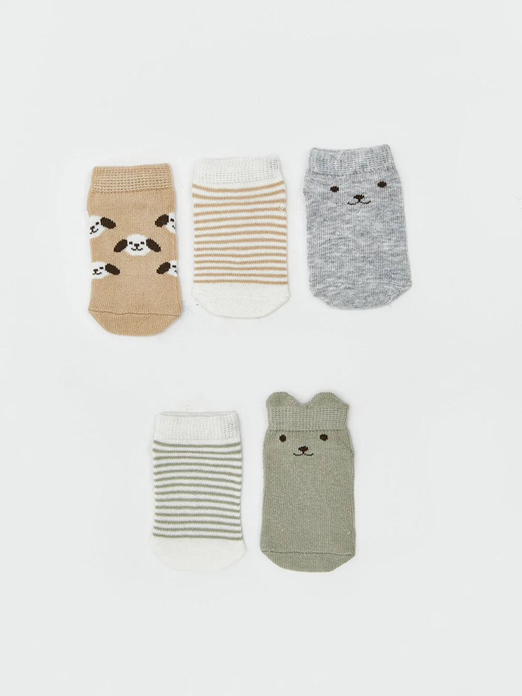Hayvan figürlü, çizgili ve desenli tasarımlardan oluşan erkek bebek patik çorap seti, bazı modellerde bulunan kulak detayına sahiptir.