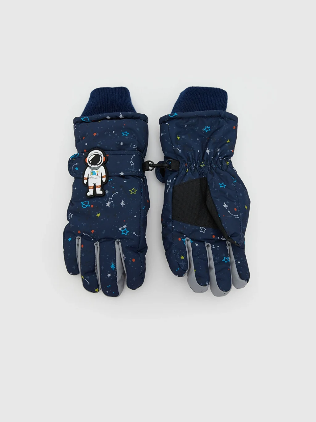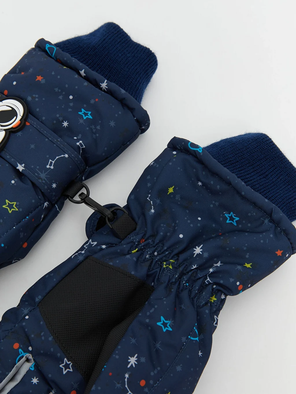 Desenli erkek çocuk eldiven, bilekleri ribanalıdır. Üzerinde astronot figürü ve yanında birleştirme klipsi bulunur.