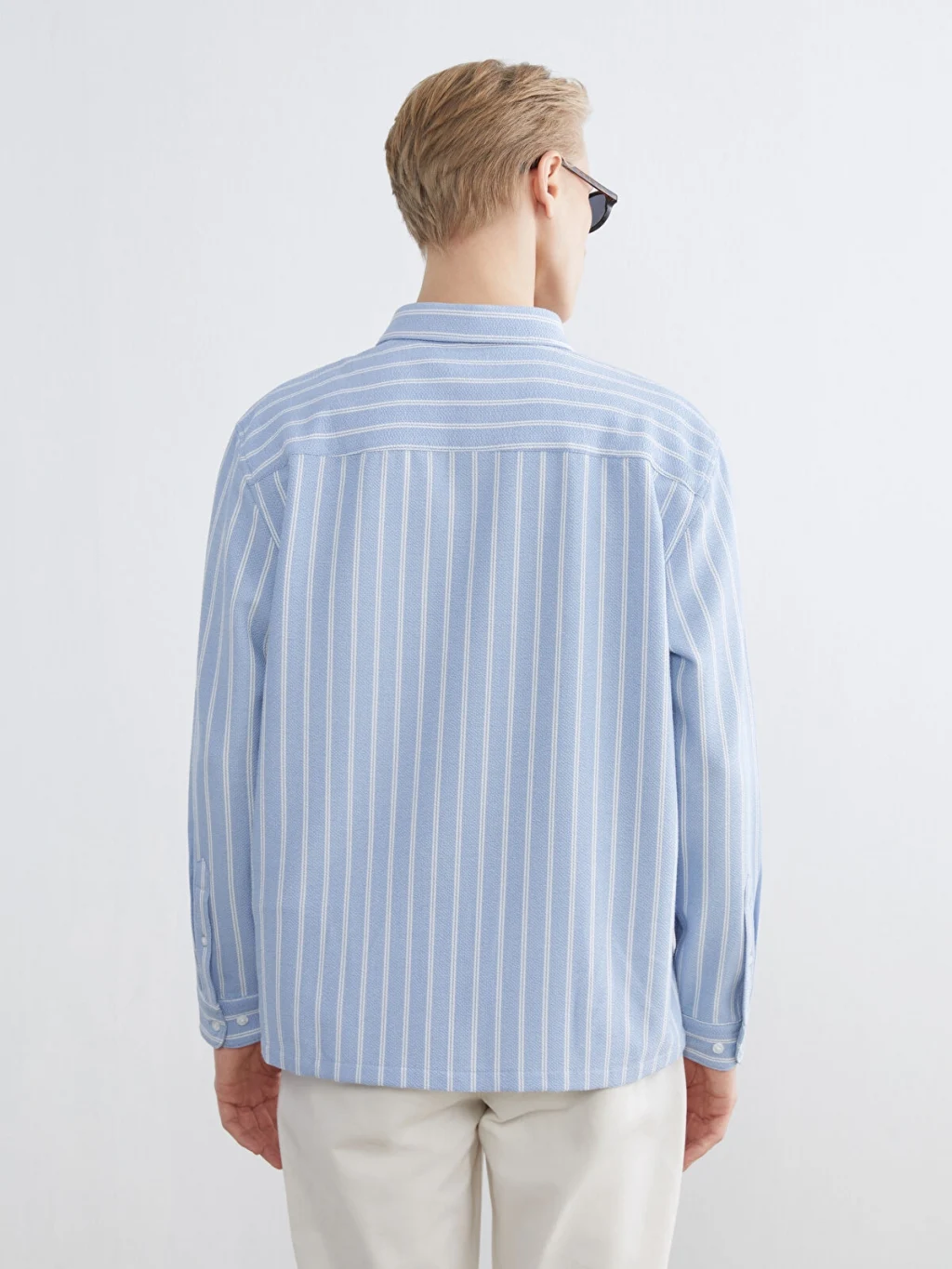 Armürlü kumaştan üretilmiş, çizgili desenli erkek gömlek. Uzun kollu ve önden düğme kapamalıdır.