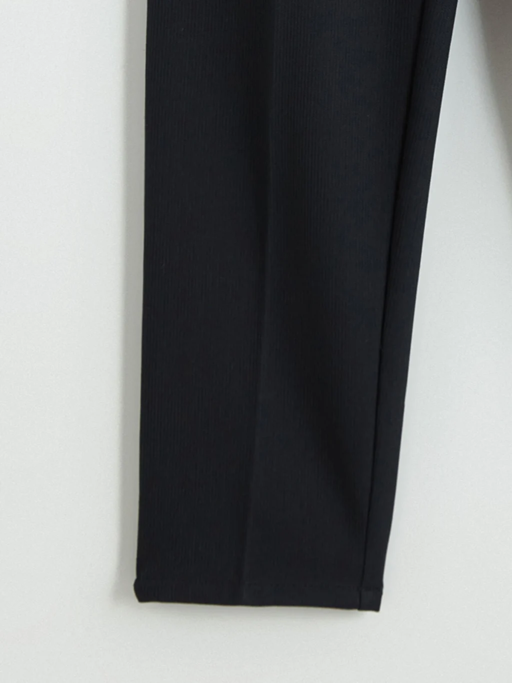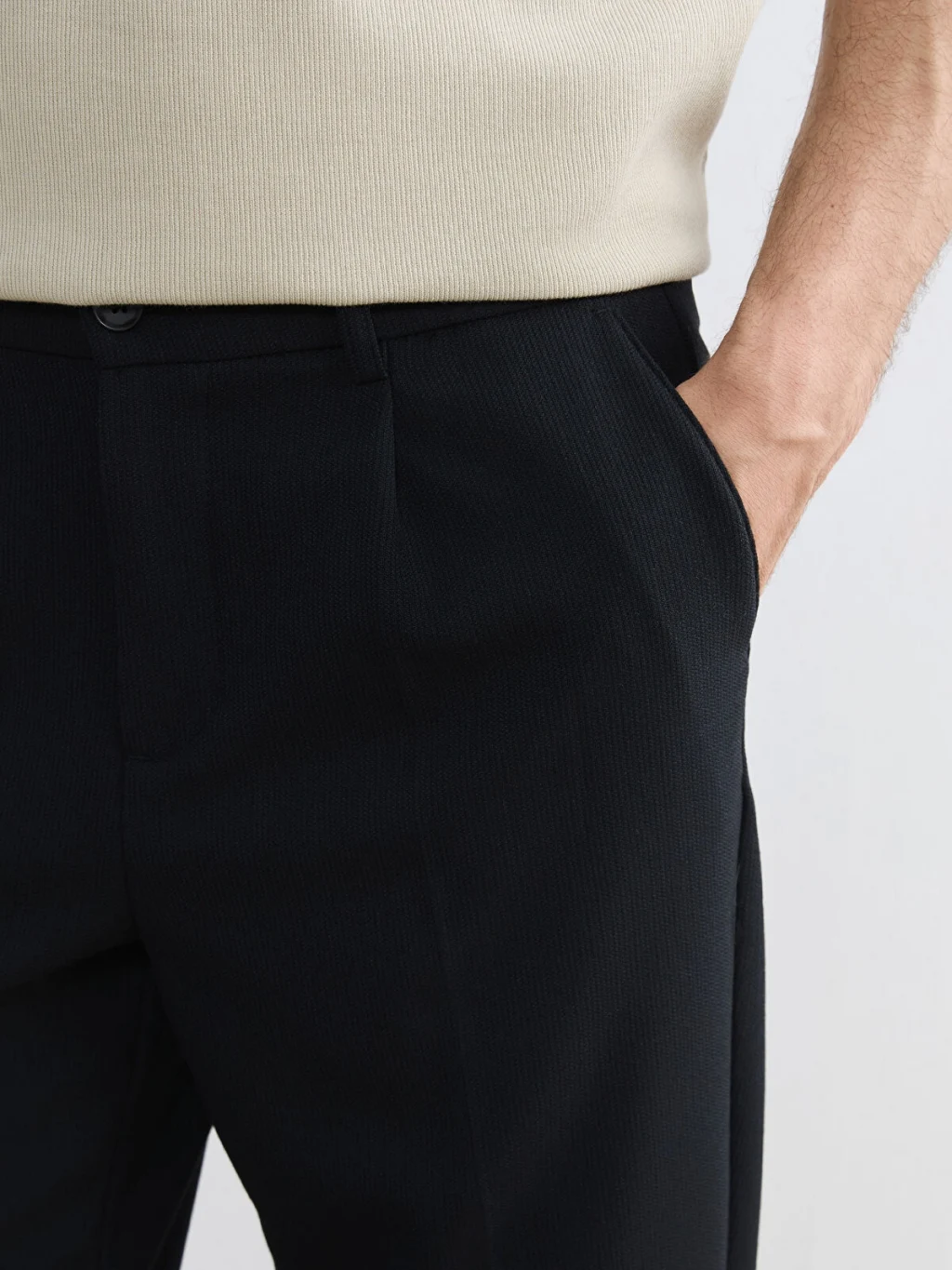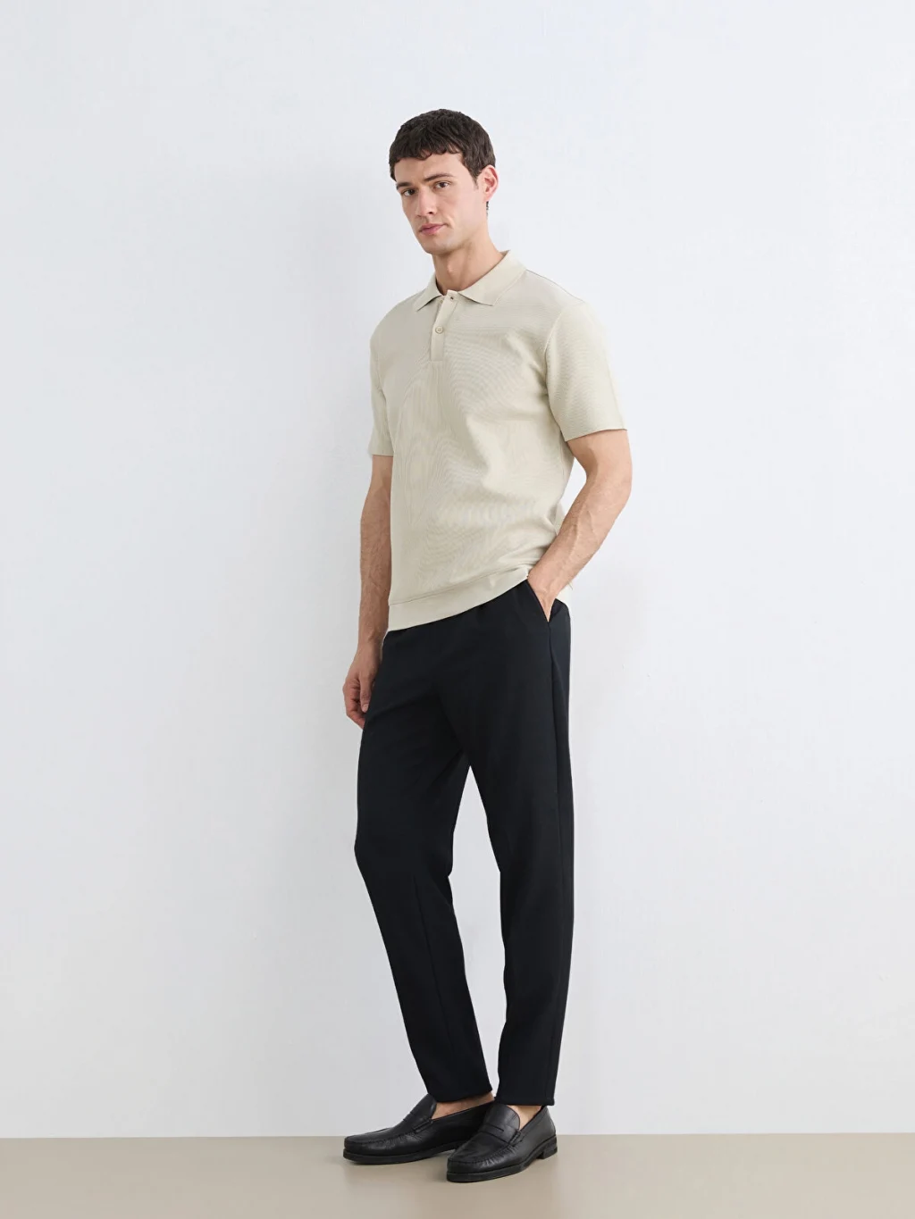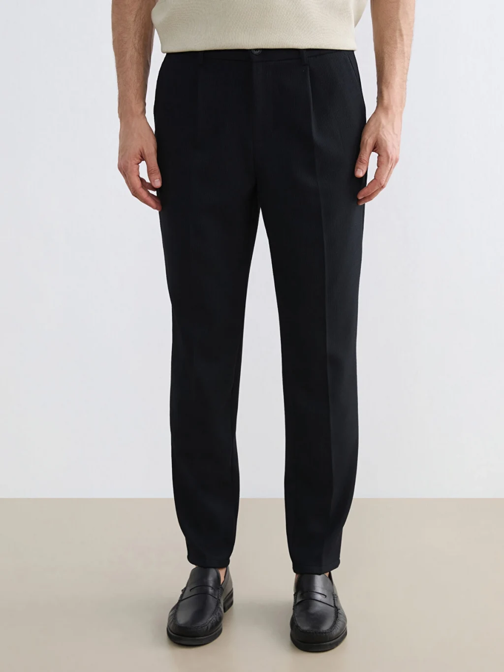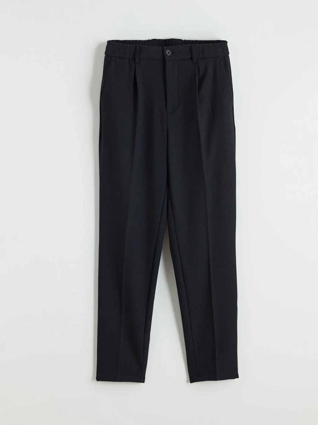 Standart kalıp erkek pantolon, beli kısmen lastikli ve düğme kapamalıdır. Cepli tasarıma sahiptir ve önü pililidir.