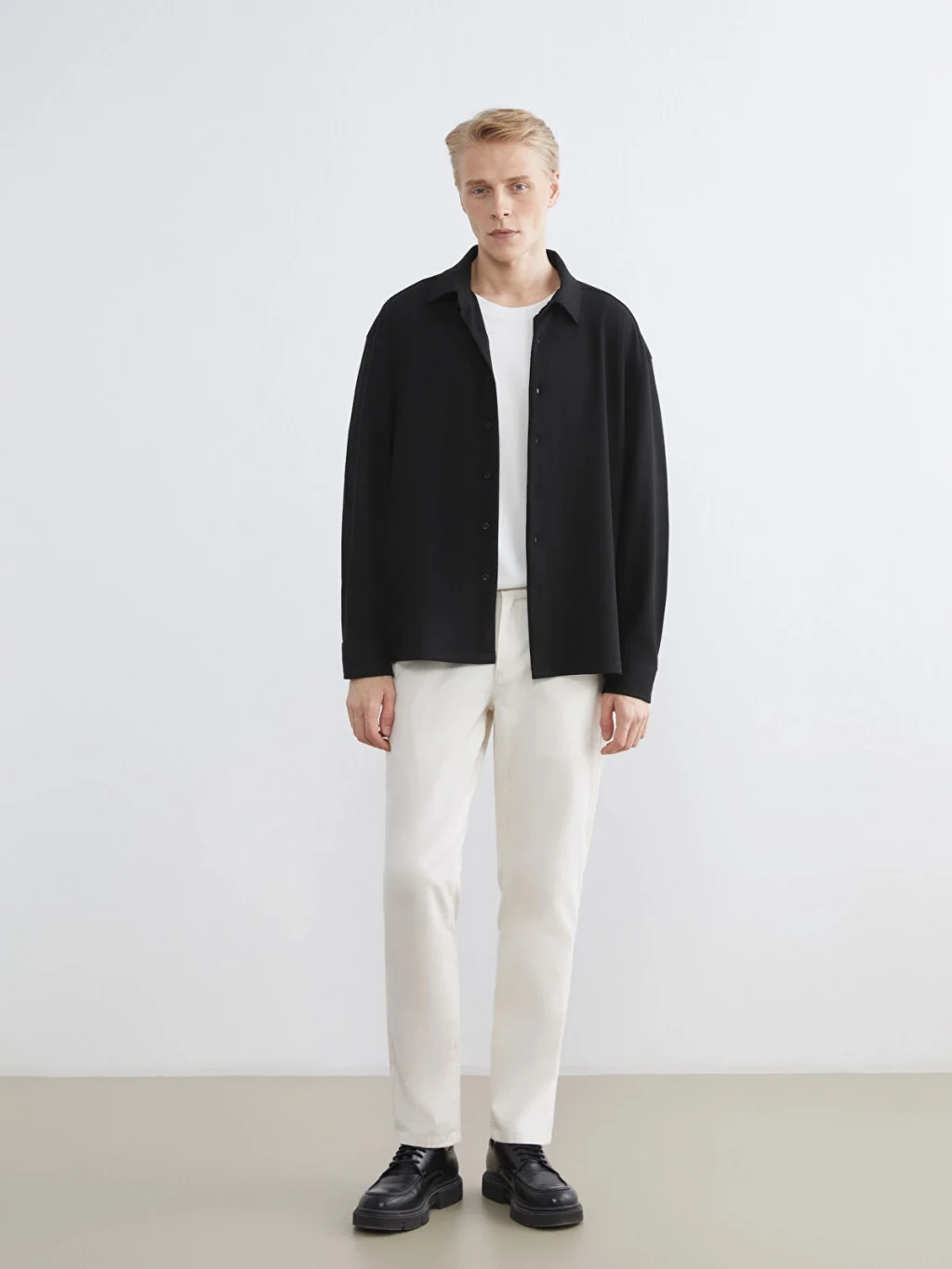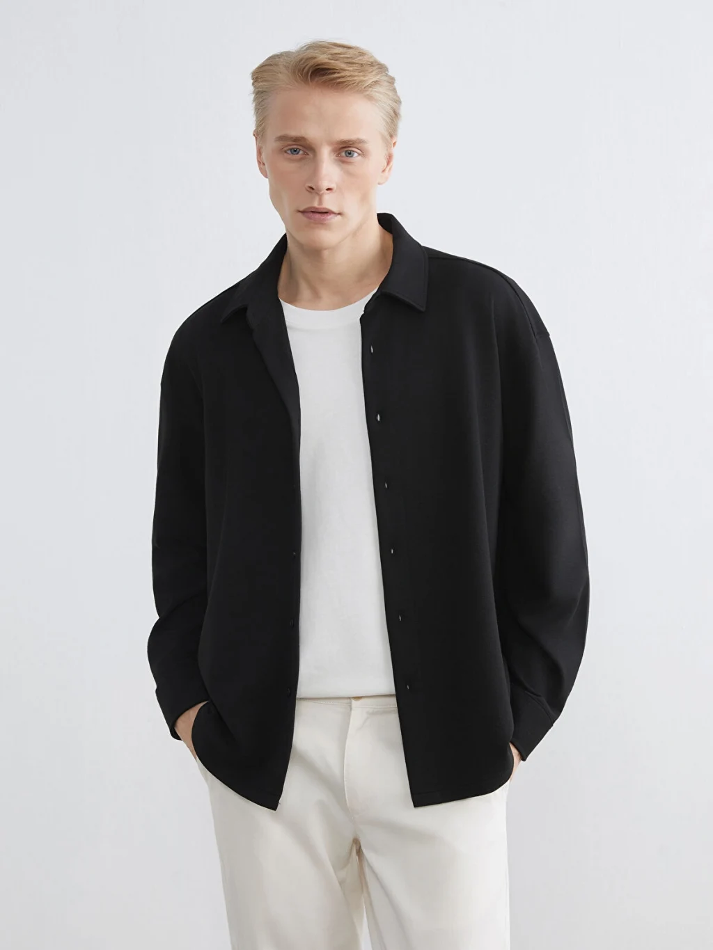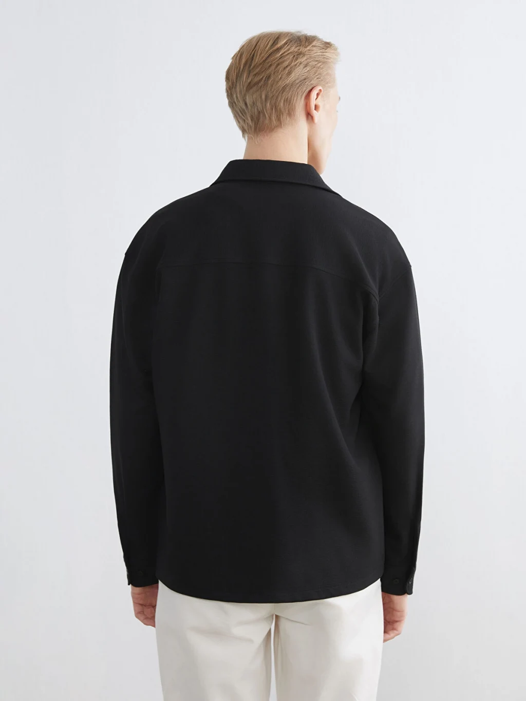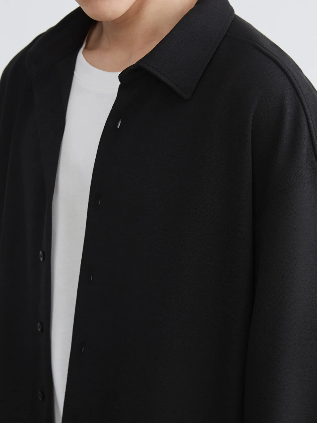 Gömlek yakalı ve uzun kollu erkek gömlek, düz kumaştan üretilmiştir. Önden düğme kapamalıdır.
