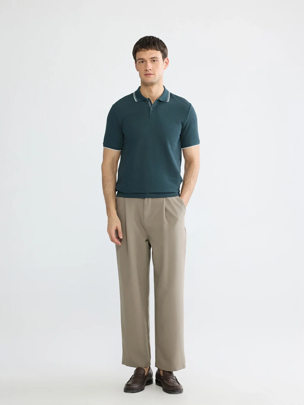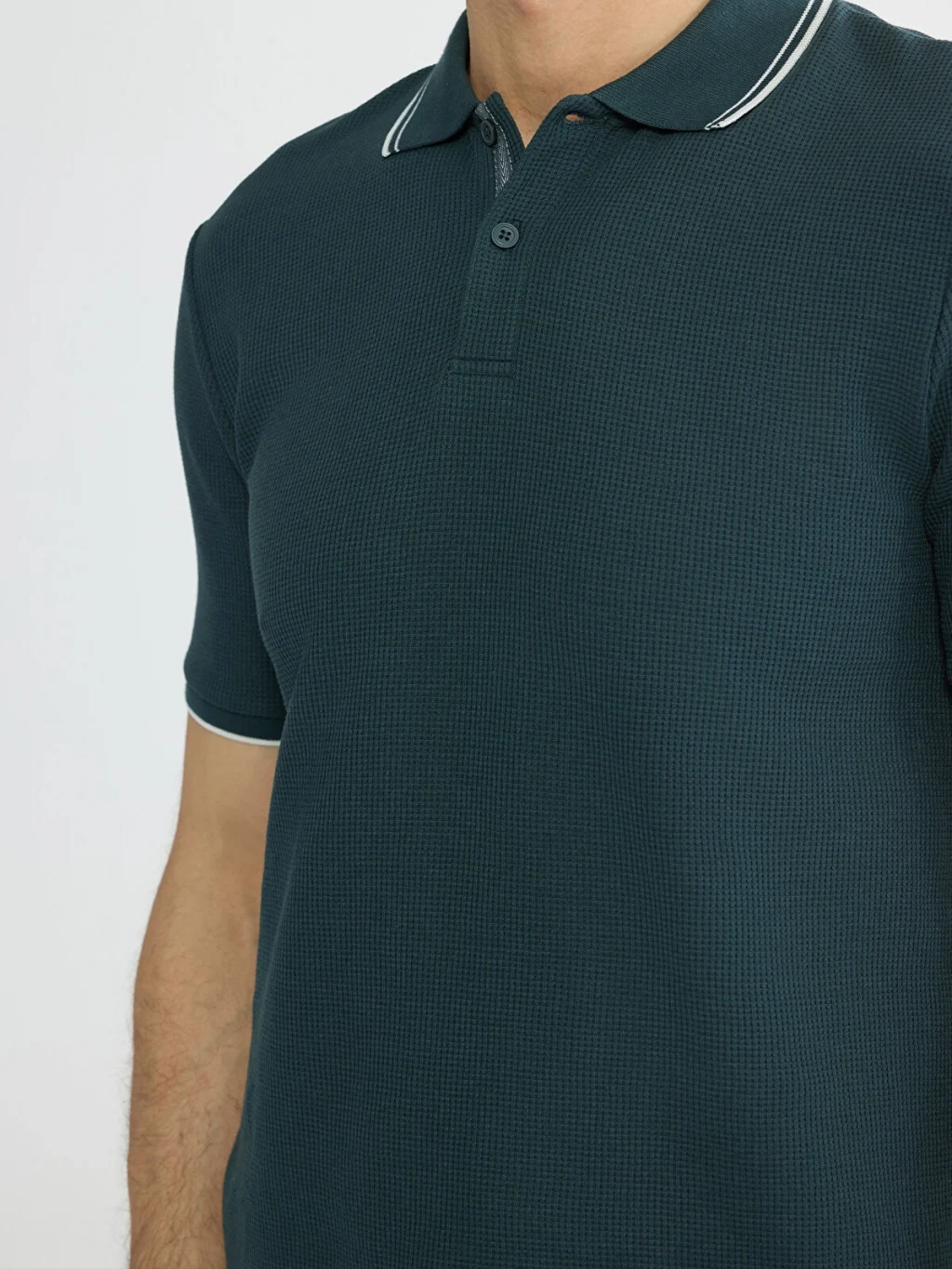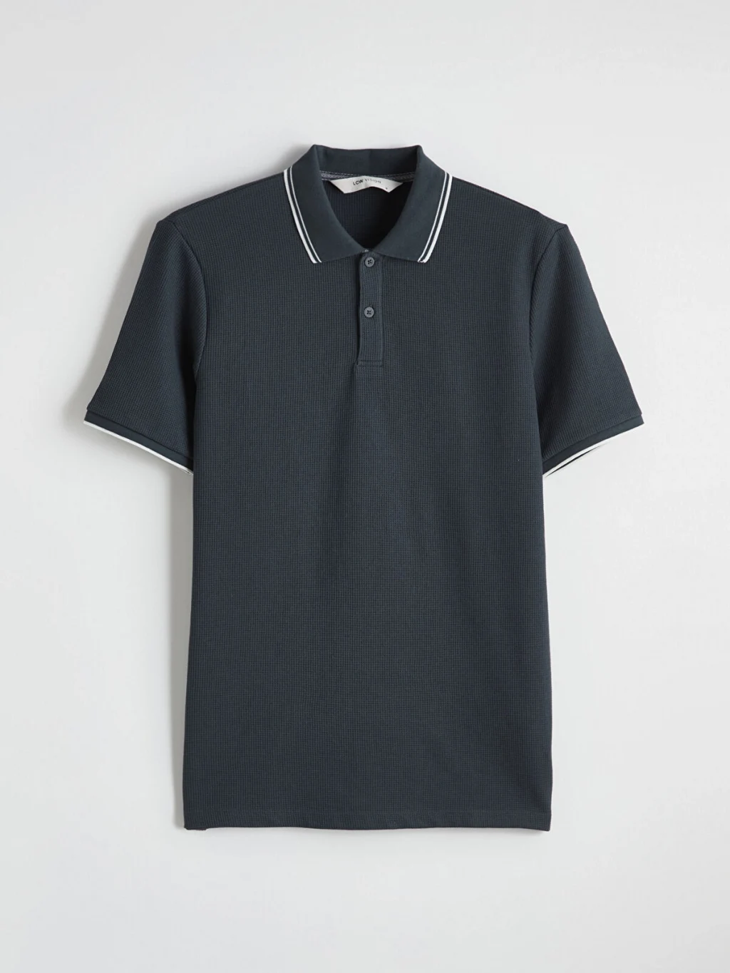 Standart kalıp, polo yakalı erkek tişört, waffle kumaştan üretilmiştir. Kısa kollu ve düğme kapamalıdır.