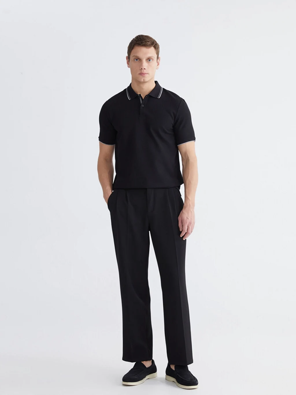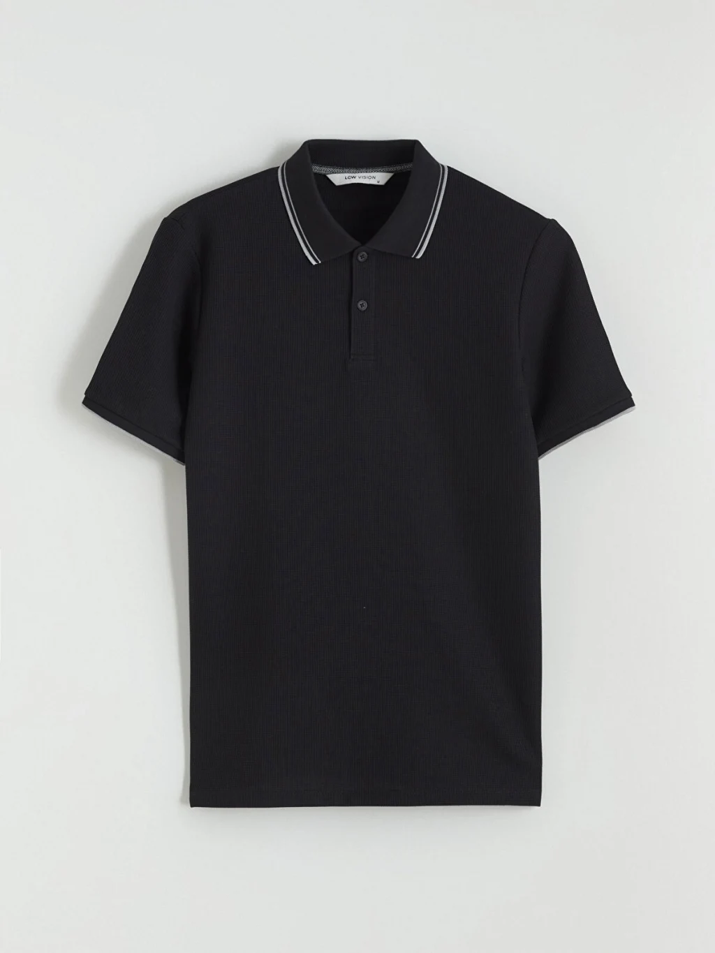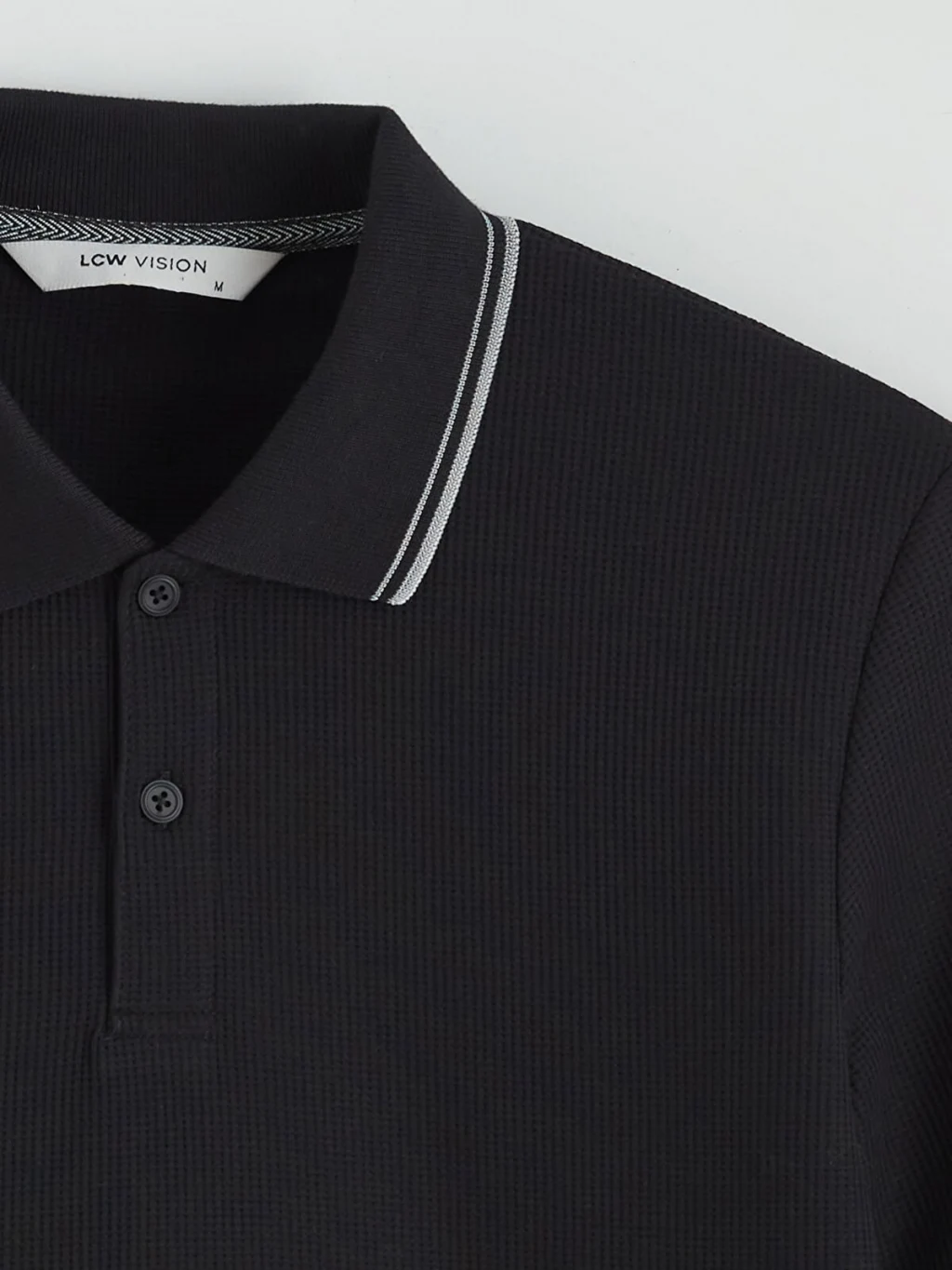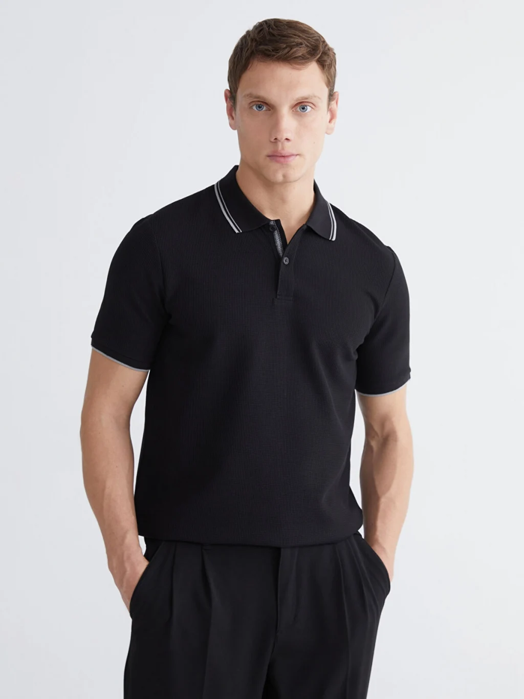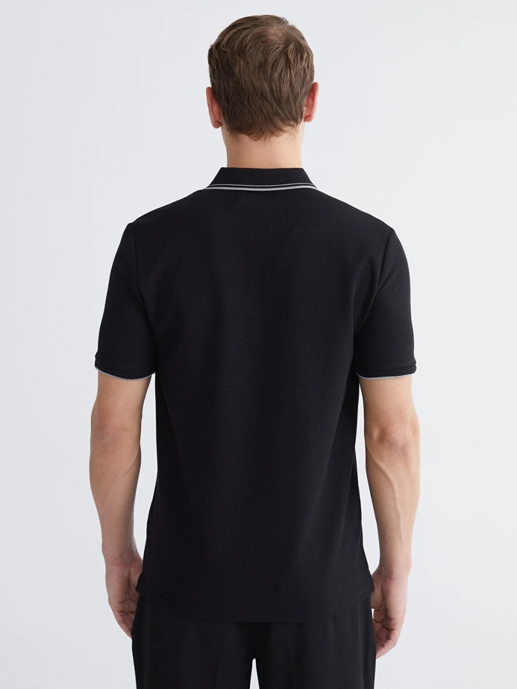 Standart kalıp, polo yakalı erkek tişört, waffle kumaştan üretilmiştir. Kısa kollu ve düğme kapamalıdır.