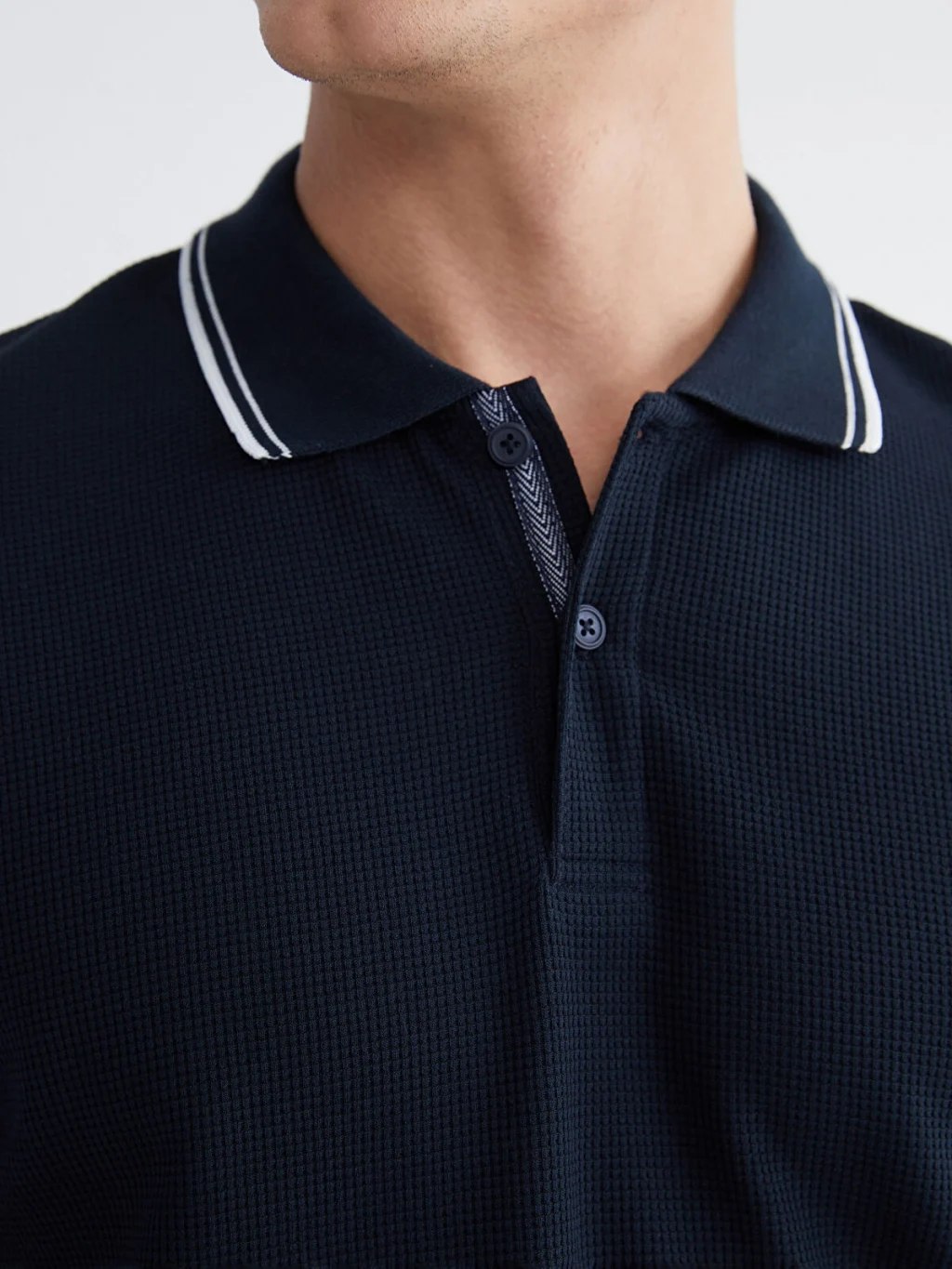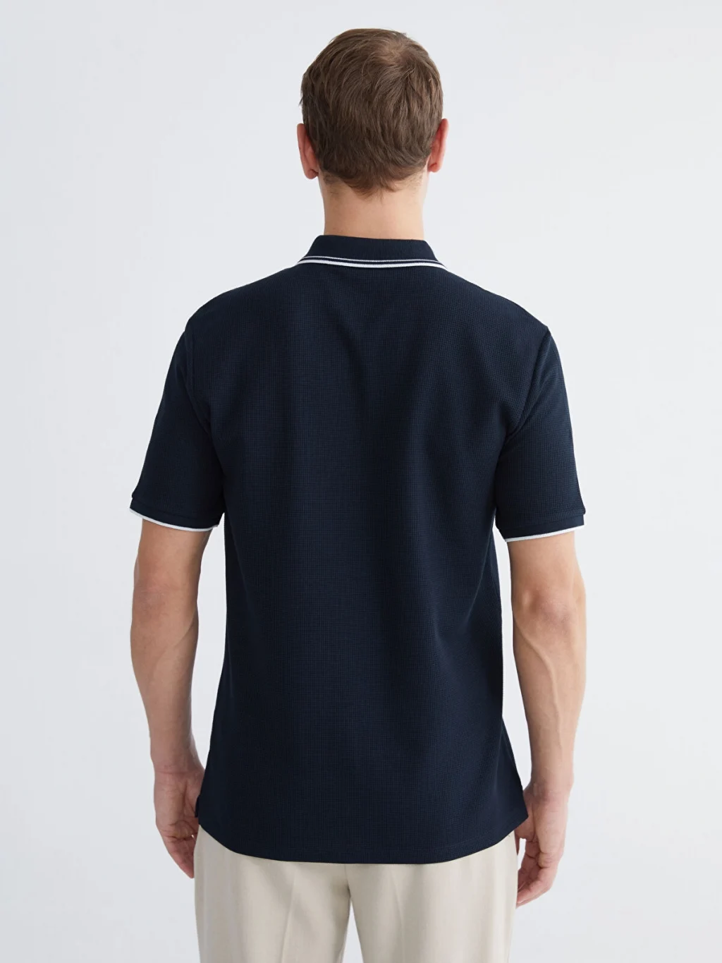 Standart kalıp, polo yakalı erkek tişört, waffle kumaştan üretilmiştir. Kısa kollu ve düğme kapamalıdır.