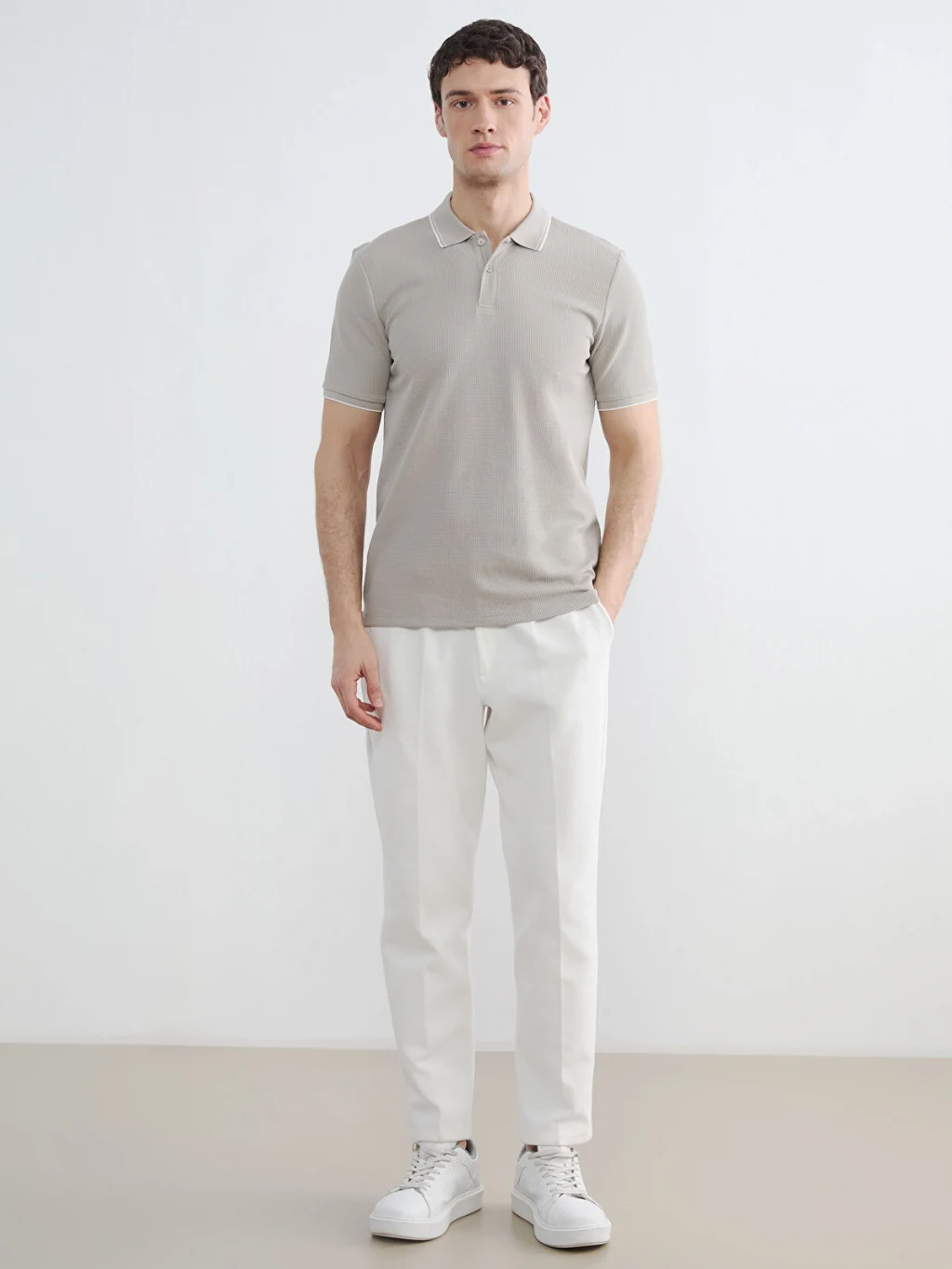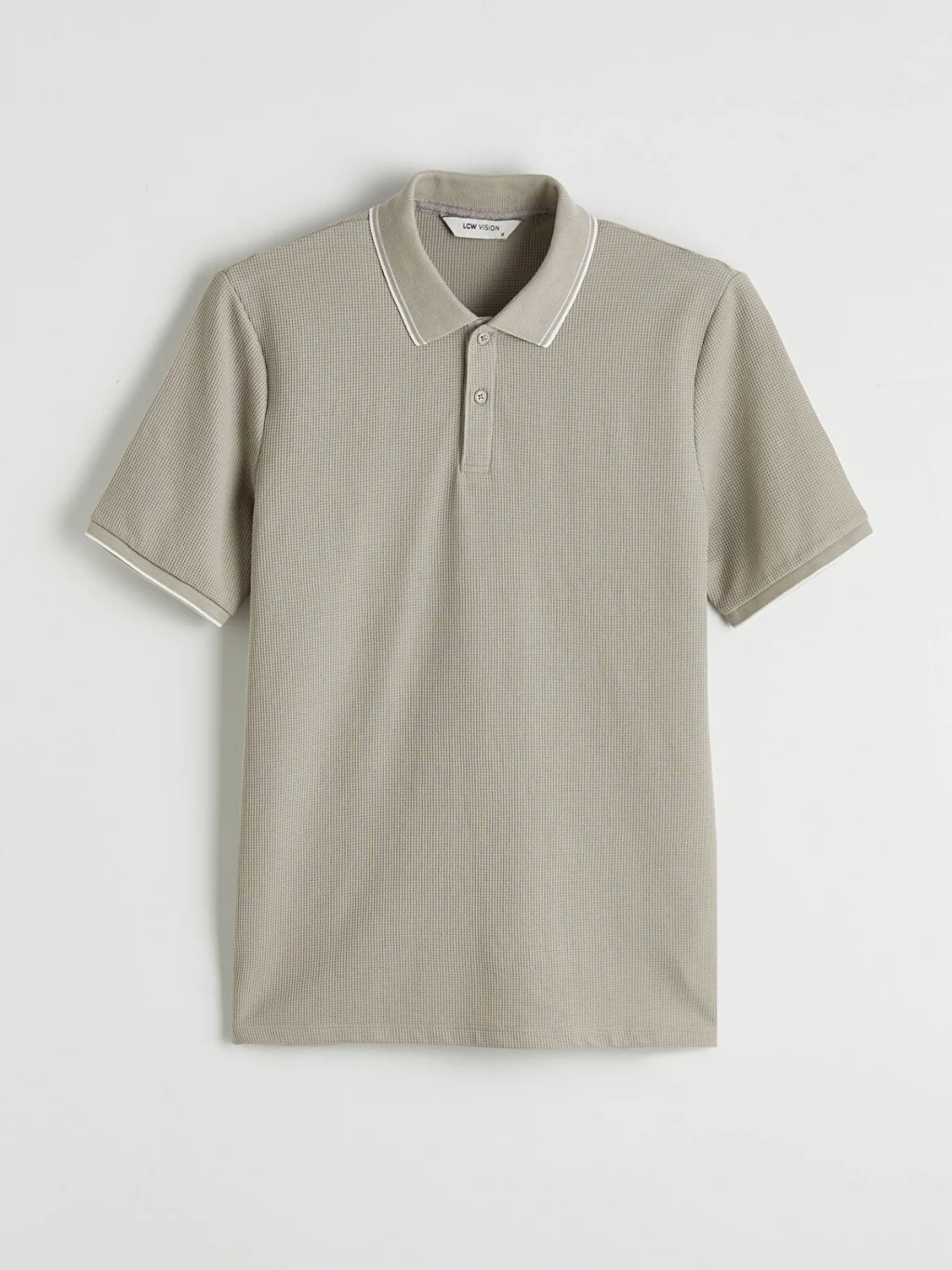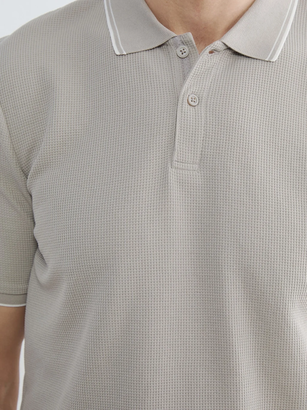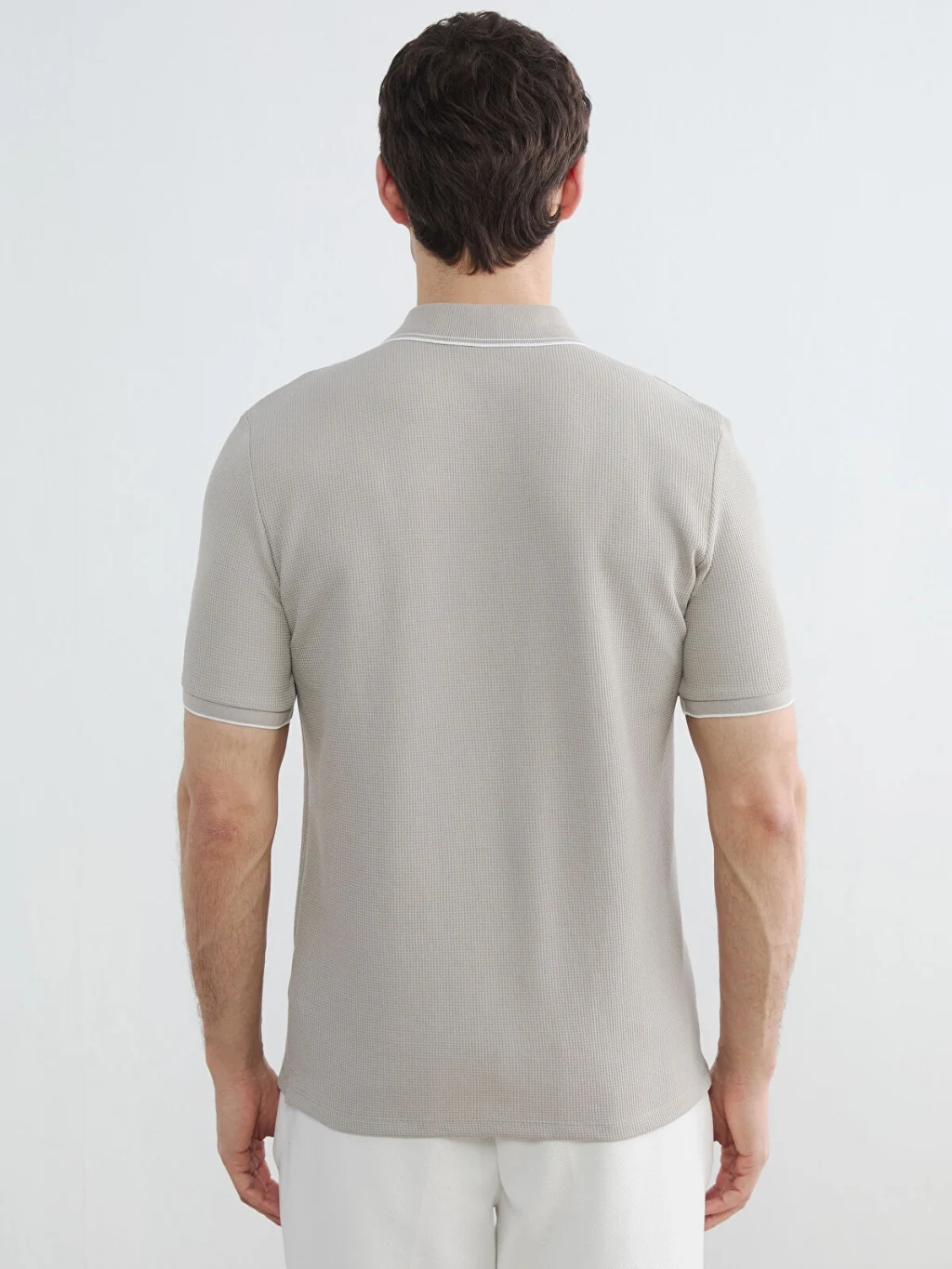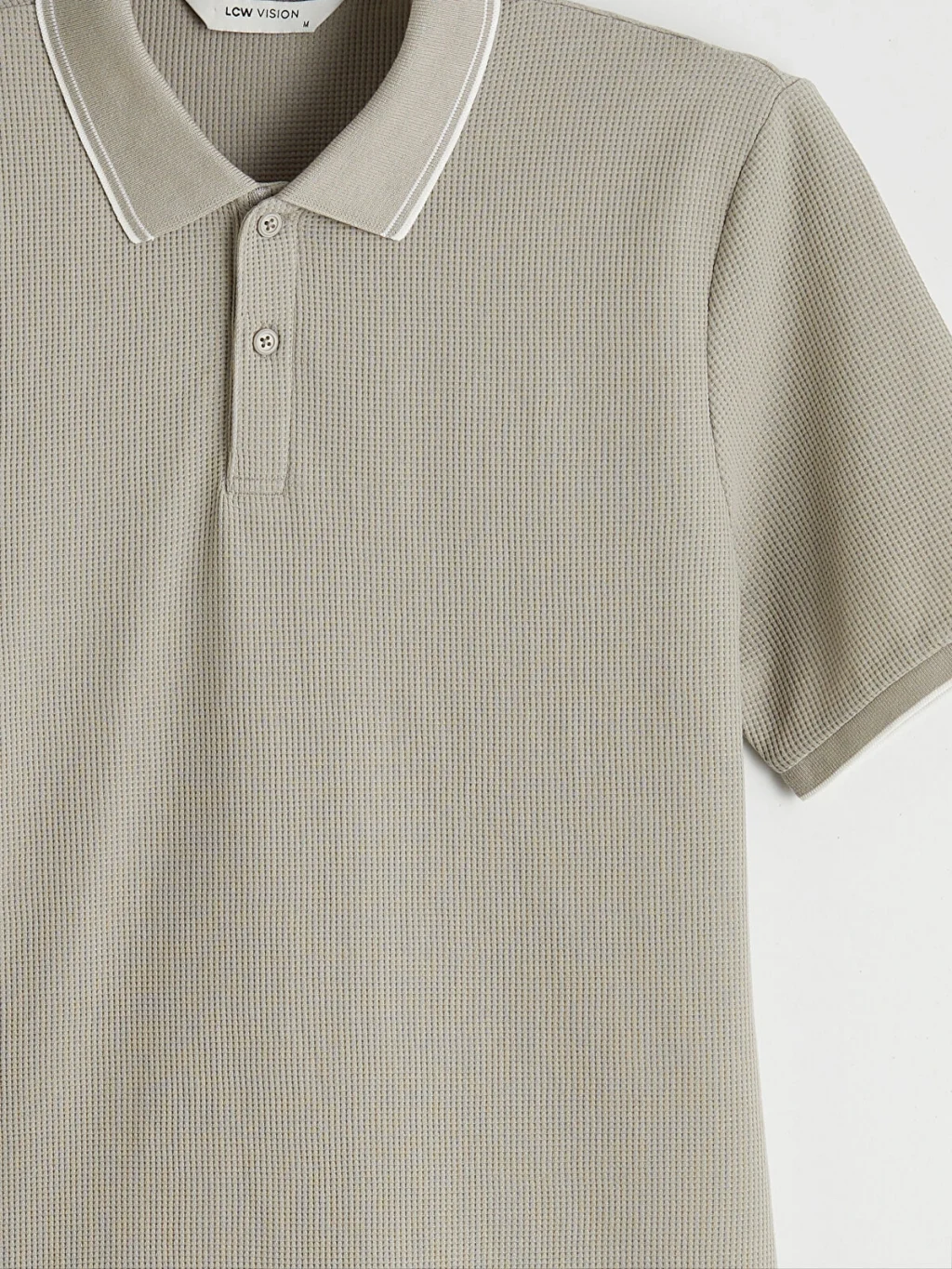 Standart kalıp, polo yakalı erkek tişört, waffle kumaştan üretilmiştir. Kısa kollu ve düğme kapamalıdır.