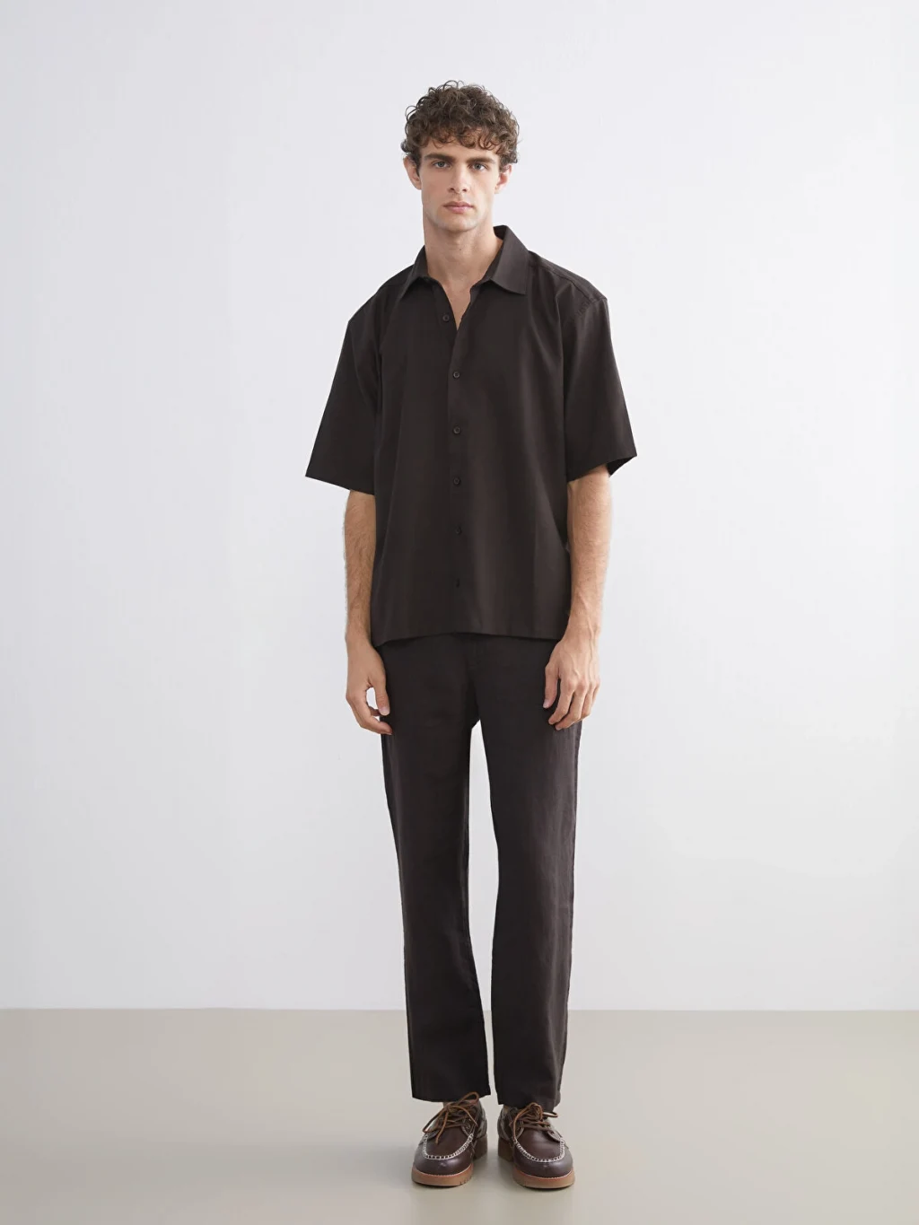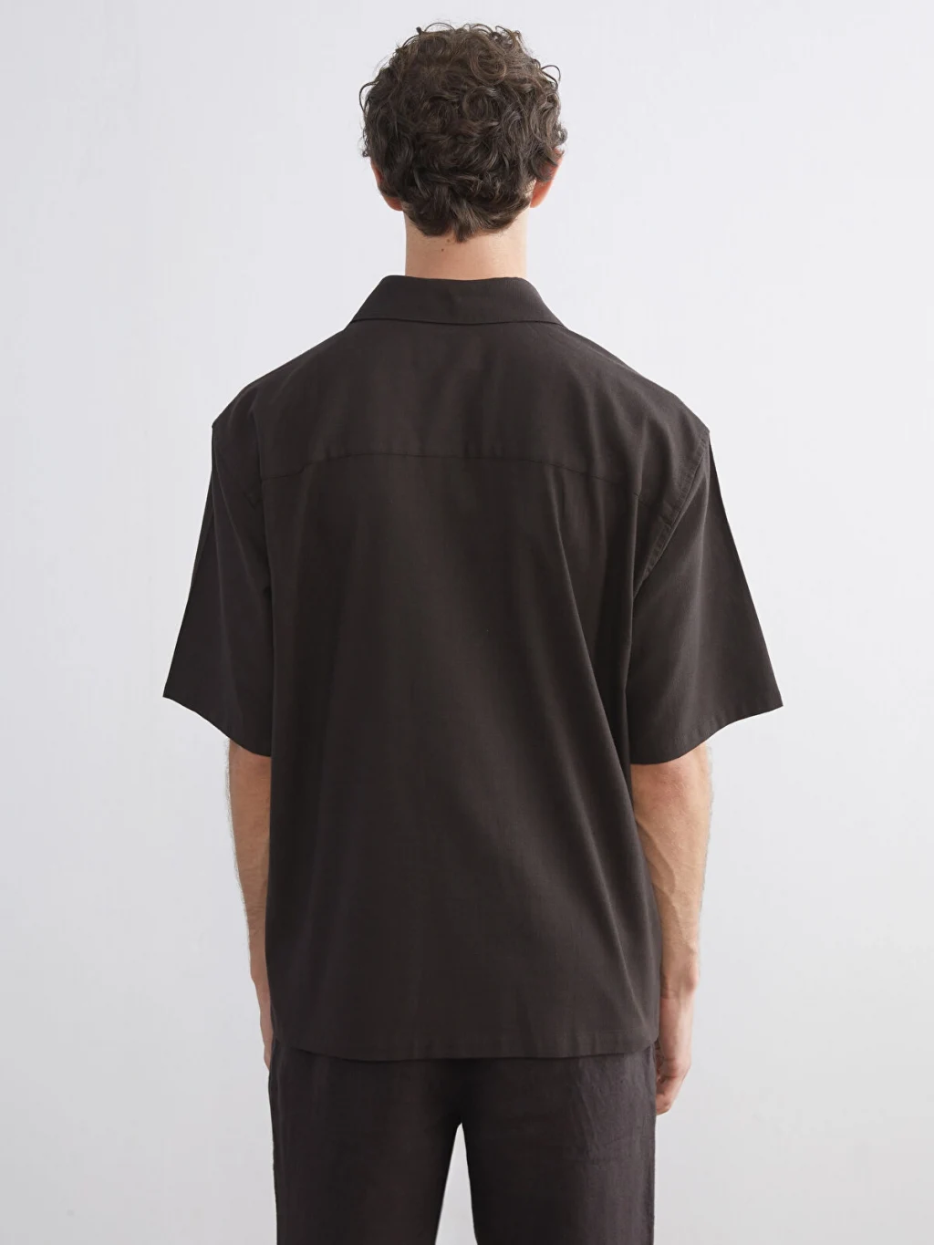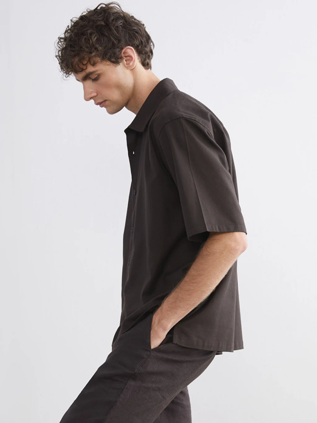 Gömlek yakalı, kısa kollu erkek gömlek, %100 pamuklu kumaştan üretilmiştir ve önden düğme kapamalıdır.