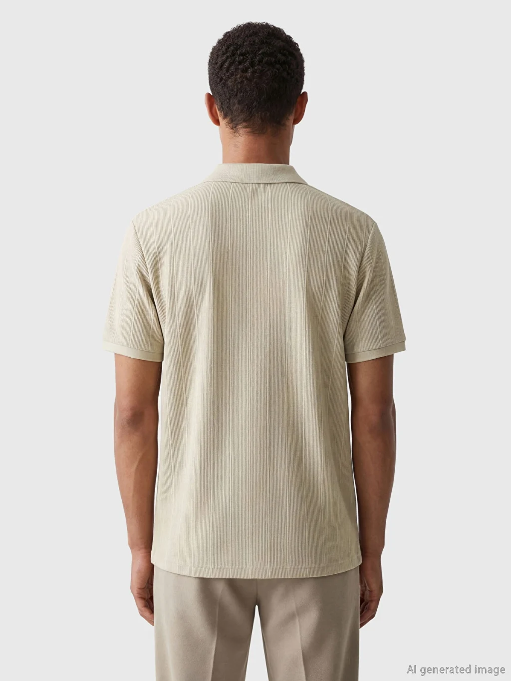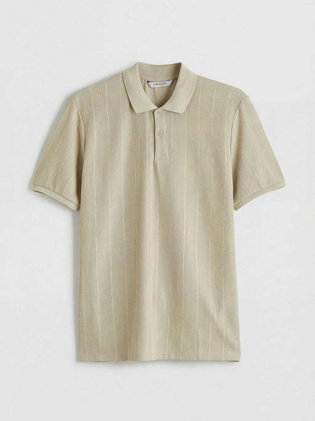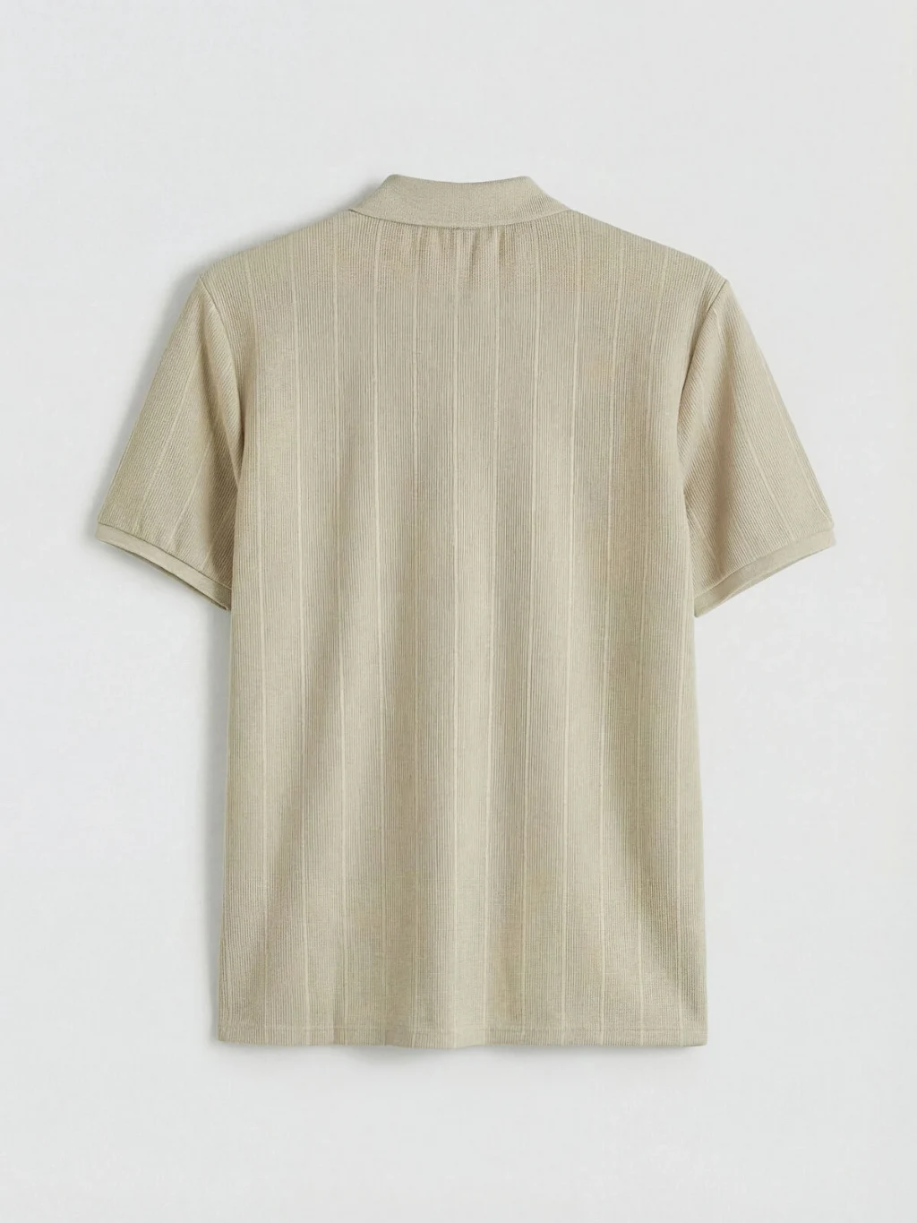 Standart kalıp, polo yakalı erkek tişört, kısa kollu ve dikey çizgili desenlidir. Önü düğme kapamalıdı