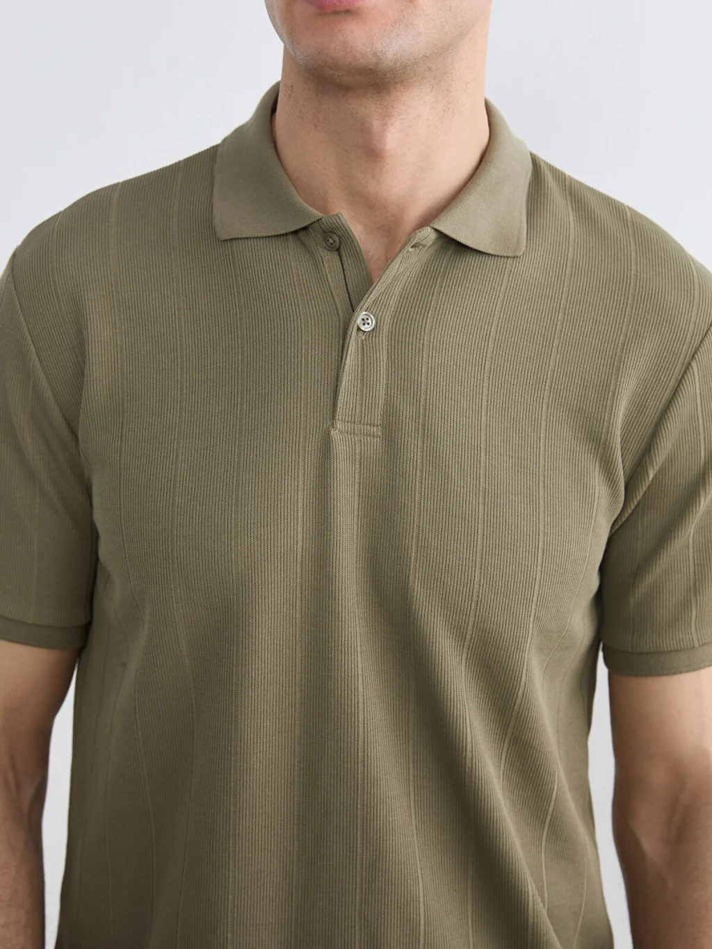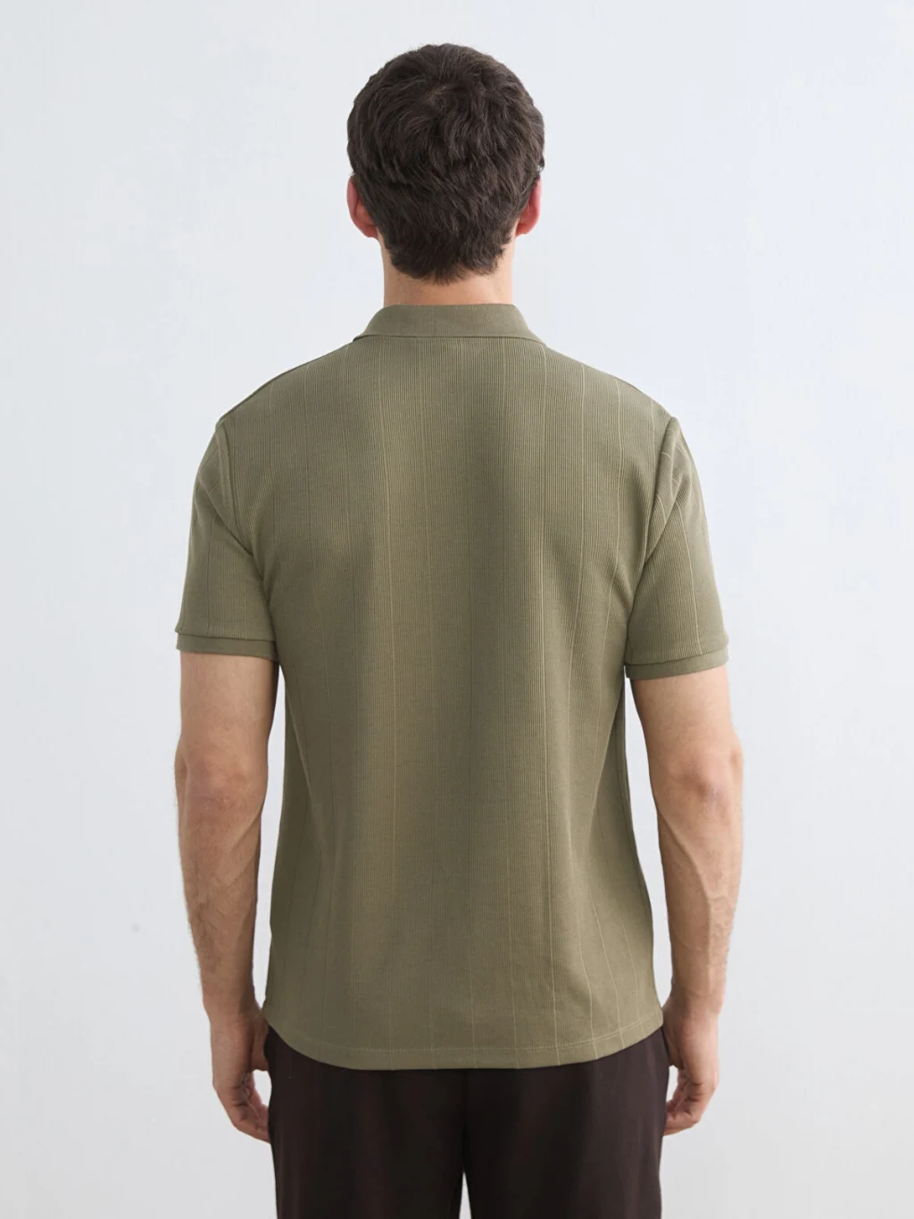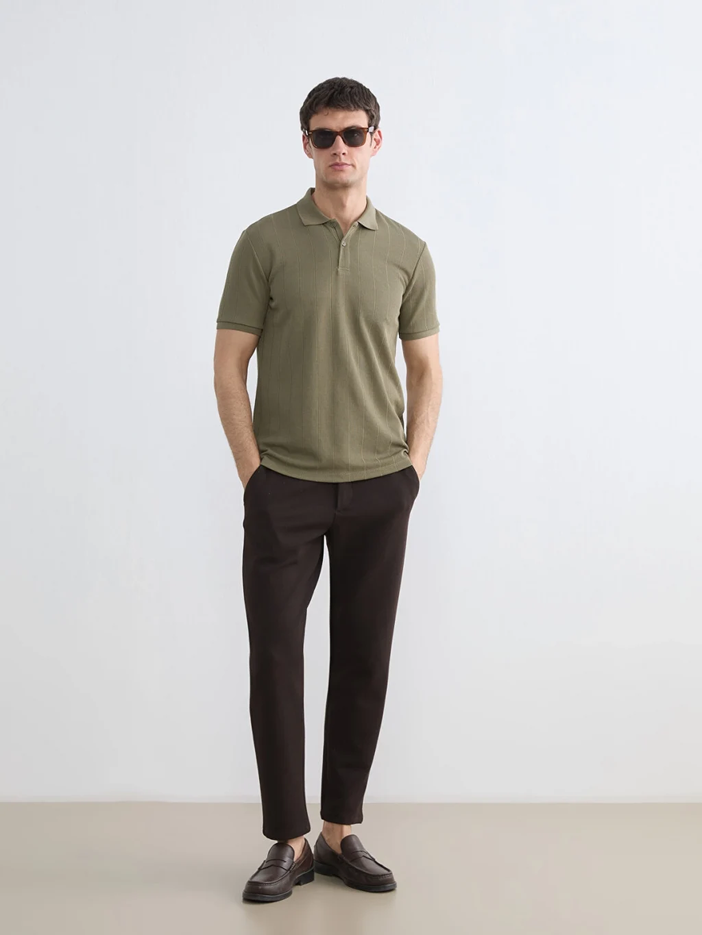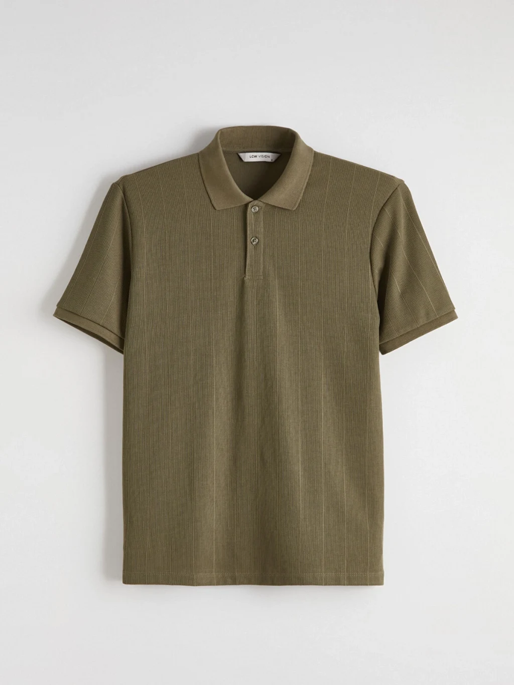 Standart kalıp, polo yakalı erkek tişört, kısa kollu ve dikey çizgili desenlidir. Önü düğme kapamalıdı