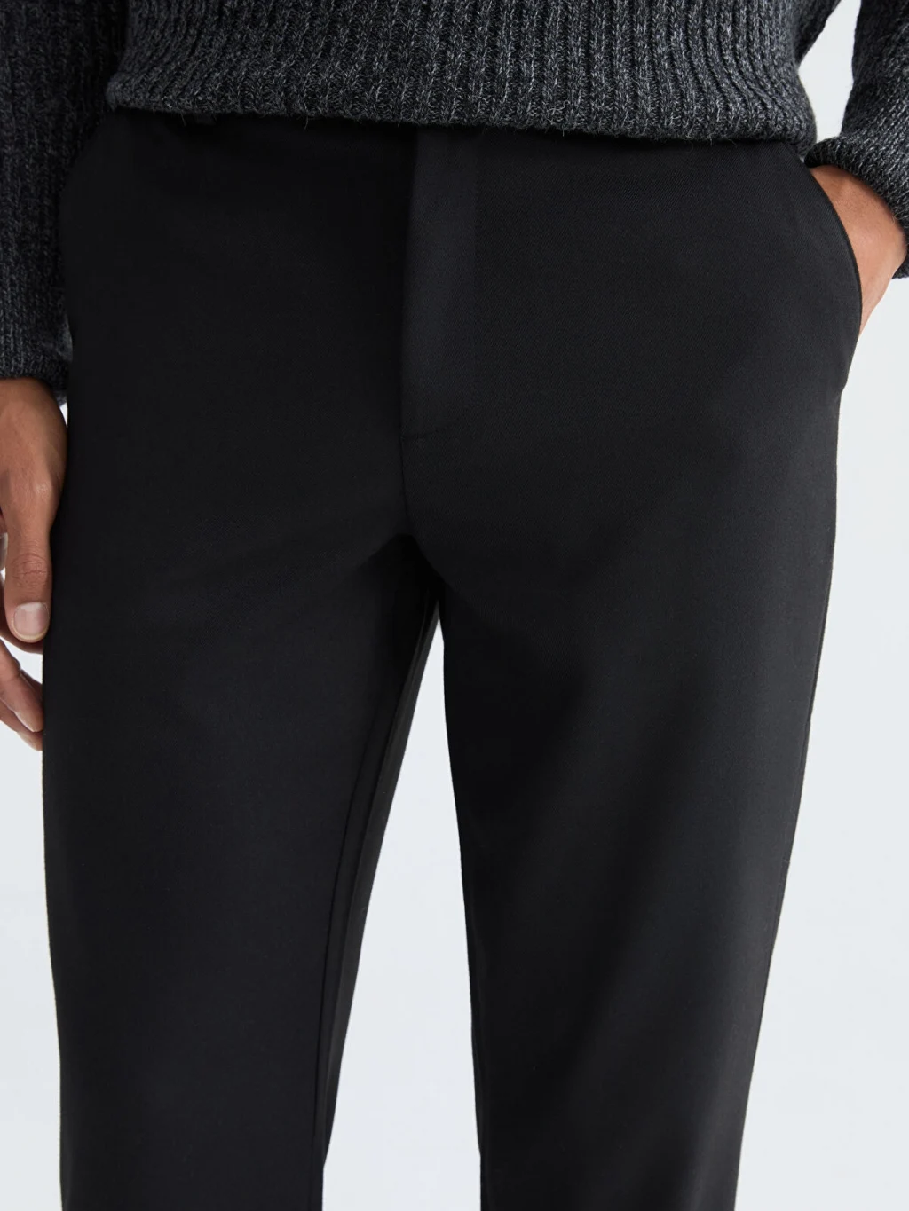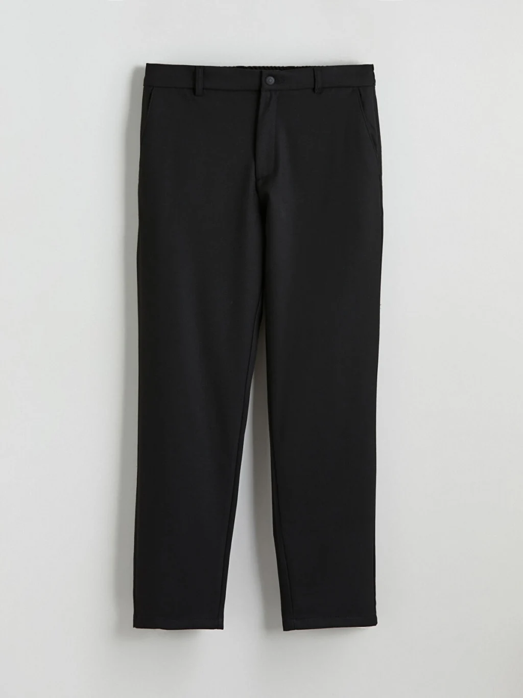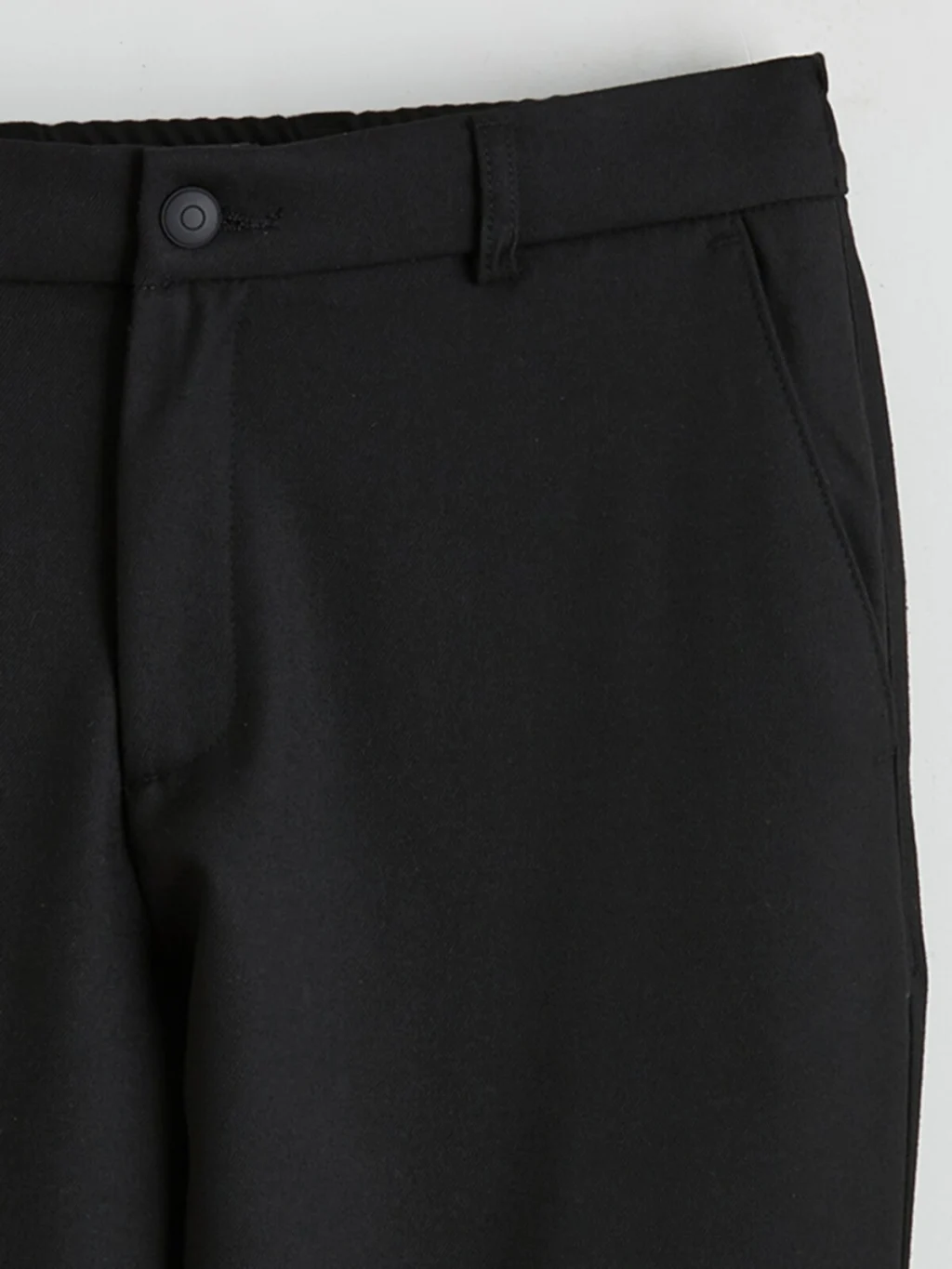 Beli lastikli ve düğme kapamalı erkek pantolon, kemer köprülerine ve yan ceplere sahiptir. Düz ve desensiz kumaştan üretilmiştir.