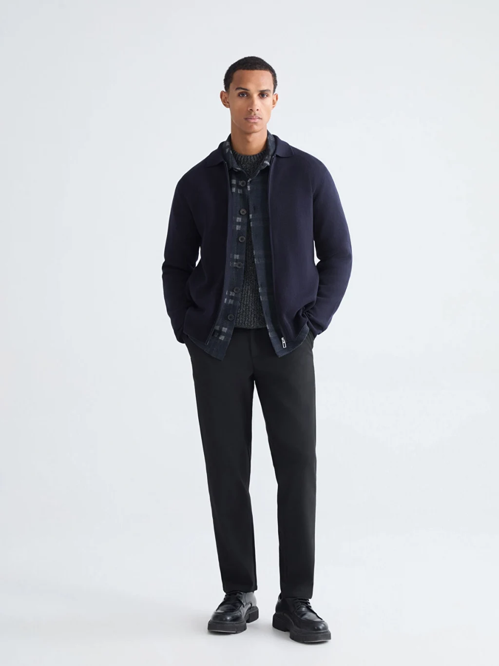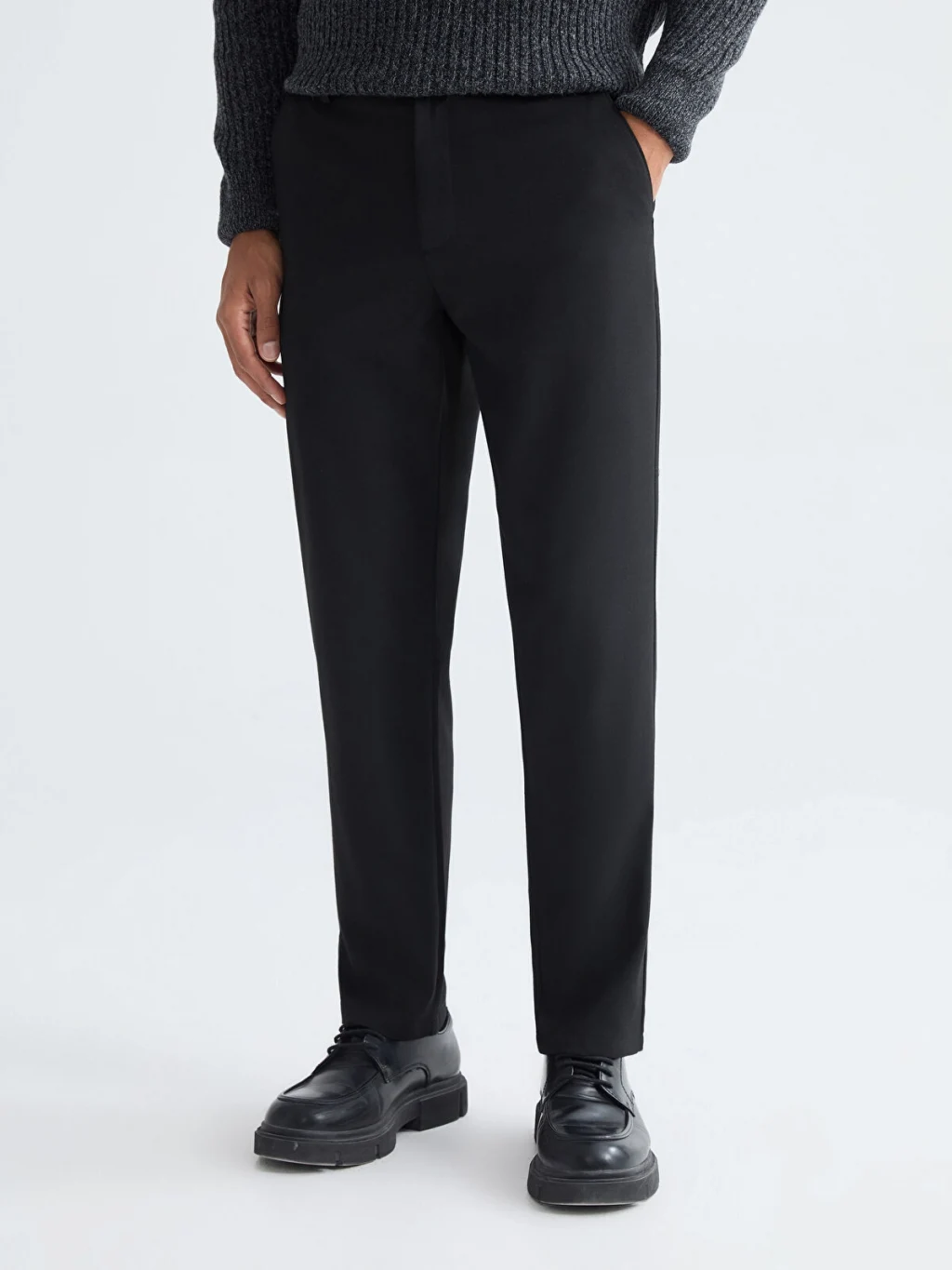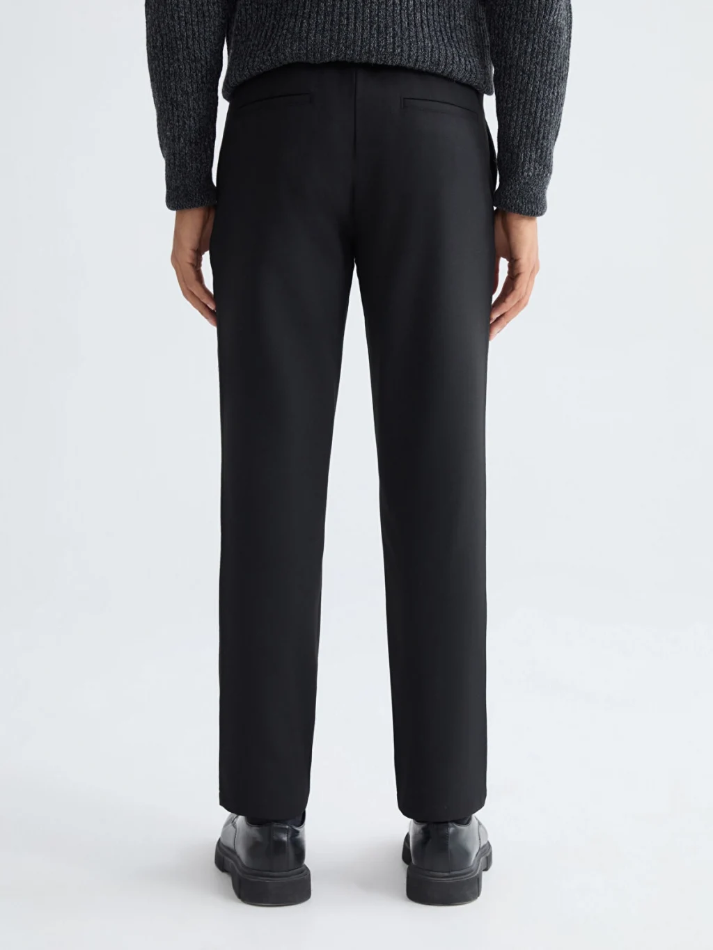 Beli lastikli ve düğme kapamalı erkek pantolon, kemer köprülerine ve yan ceplere sahiptir. Düz ve desensiz kumaştan üretilmiştir.