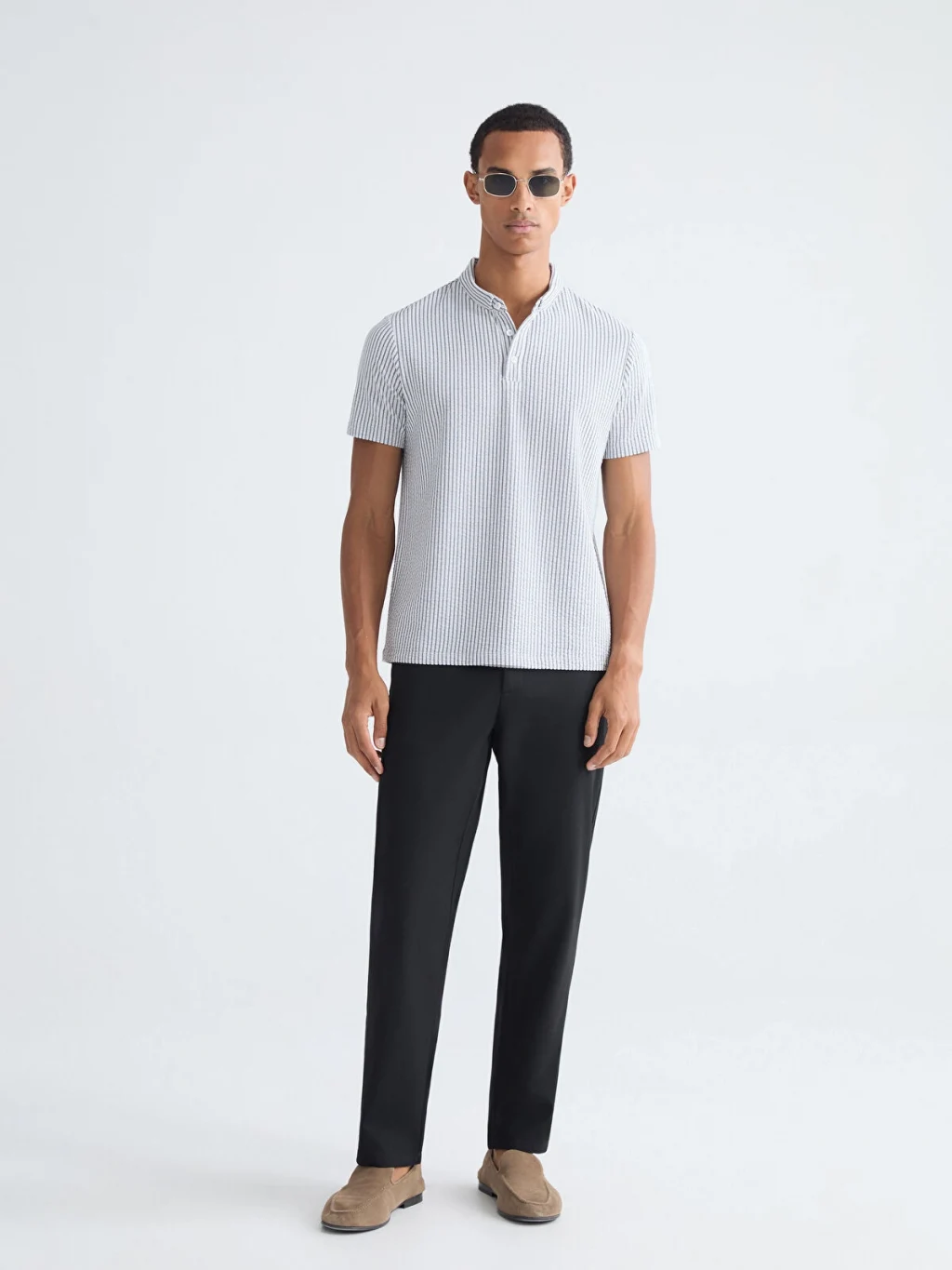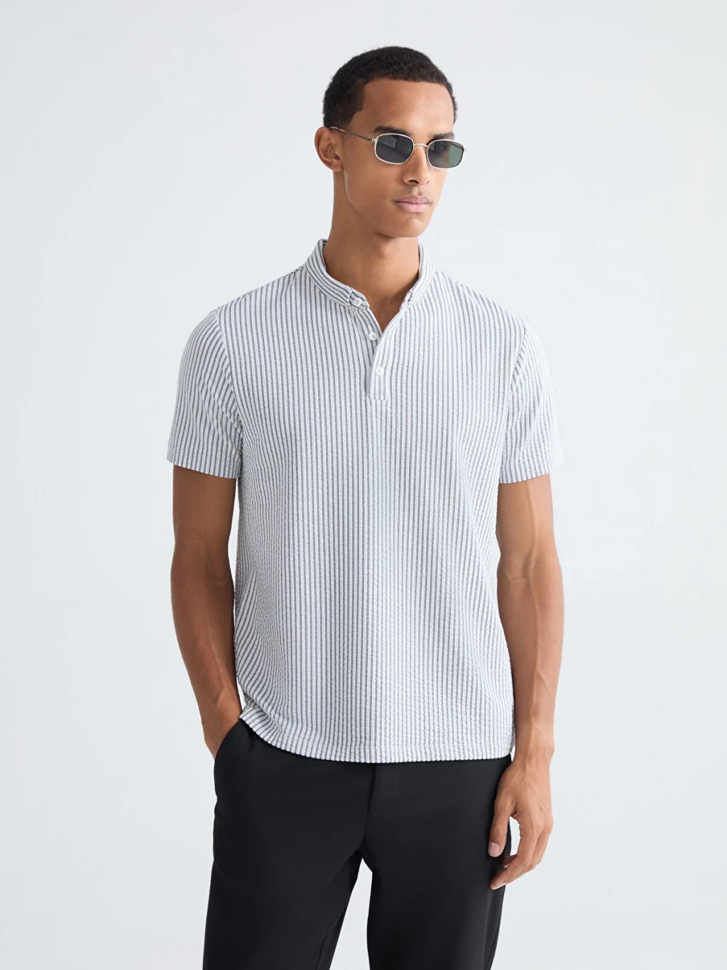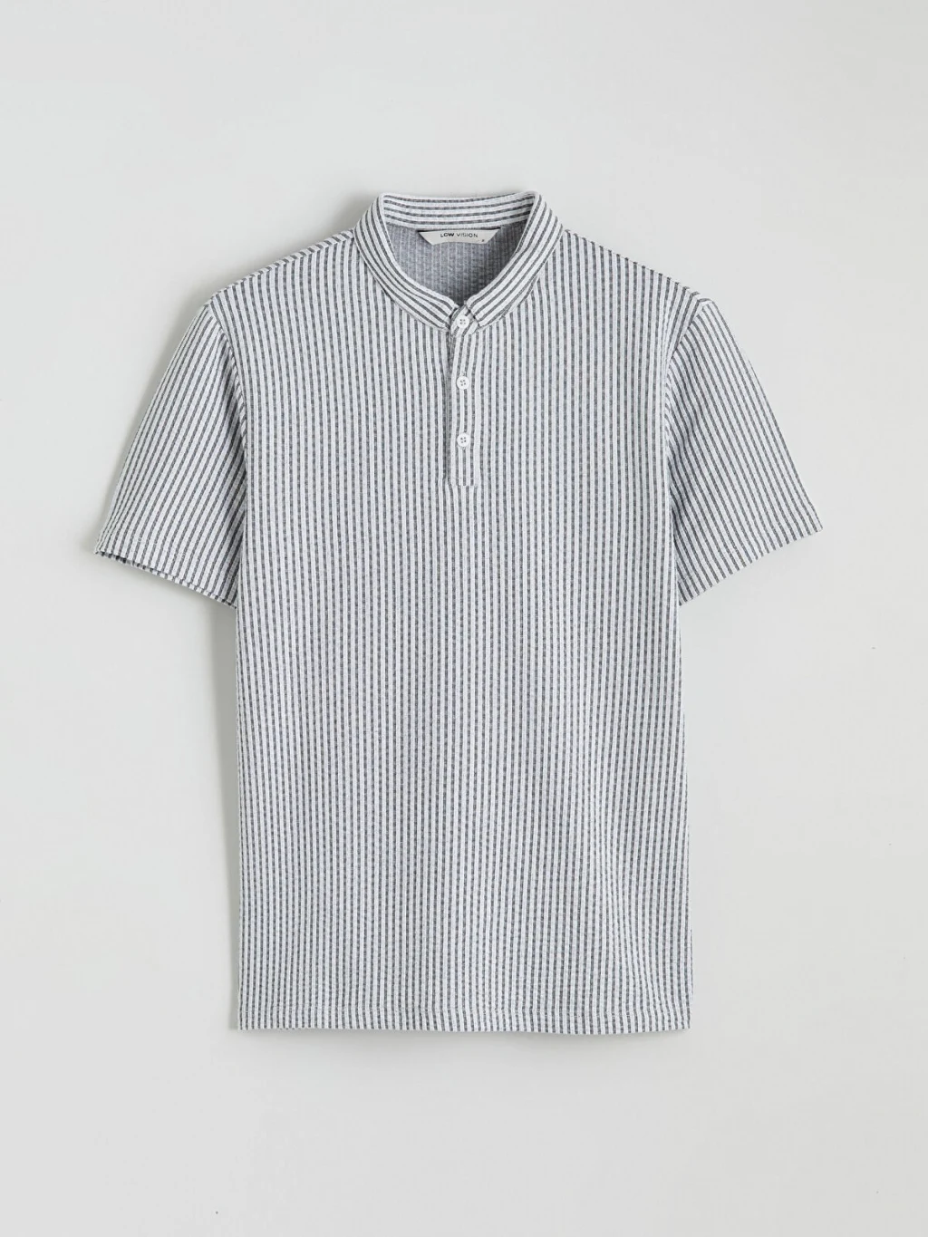 Hakim yaka, kısa kollu erkek tişört, dikey çizgili desene sahiptir ve yaka kısmı düğme kapamalıdır.