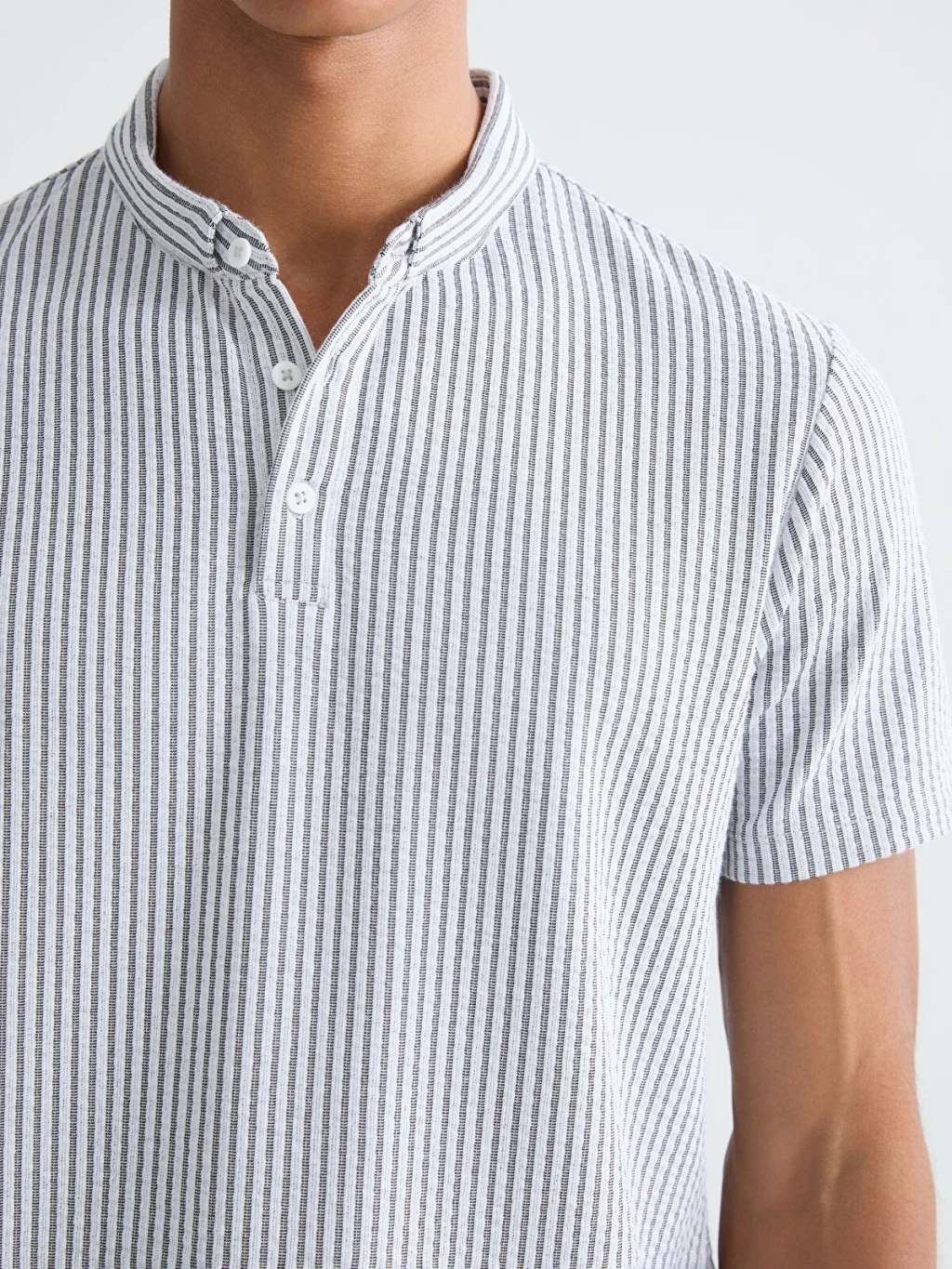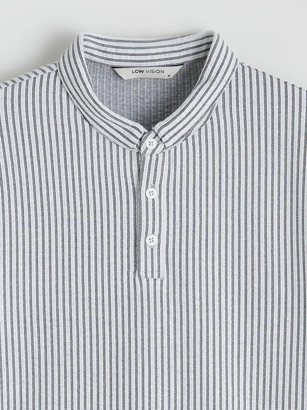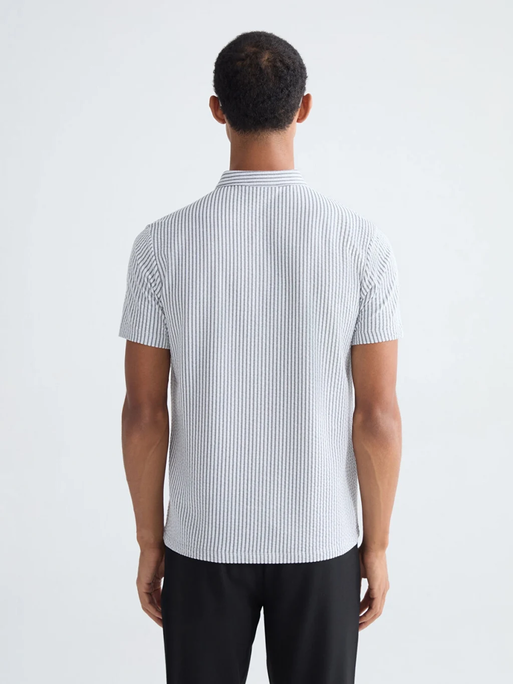 Hakim yaka, kısa kollu erkek tişört, dikey çizgili desene sahiptir ve yaka kısmı düğme kapamalıdır.