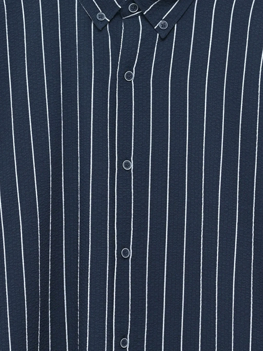 Dikey çizgili, uzun kollu erkek gömlek, krinkle kumaştan üretilmiştir. Yaka uçları düğmeli gömlek yakalıdır ve önden düğme kapamalıdır.