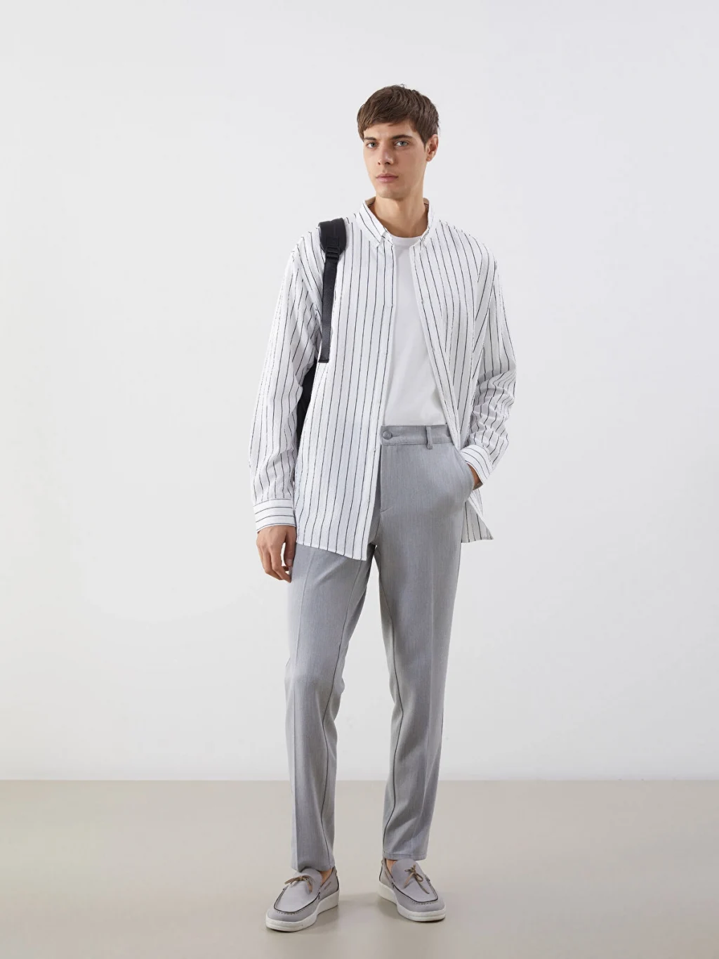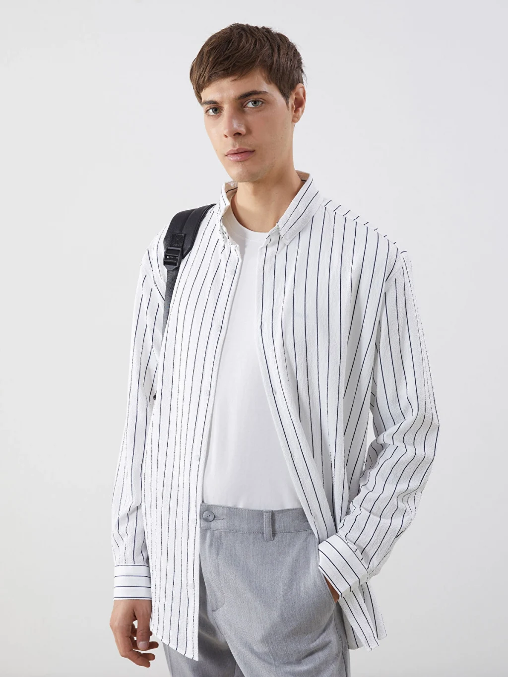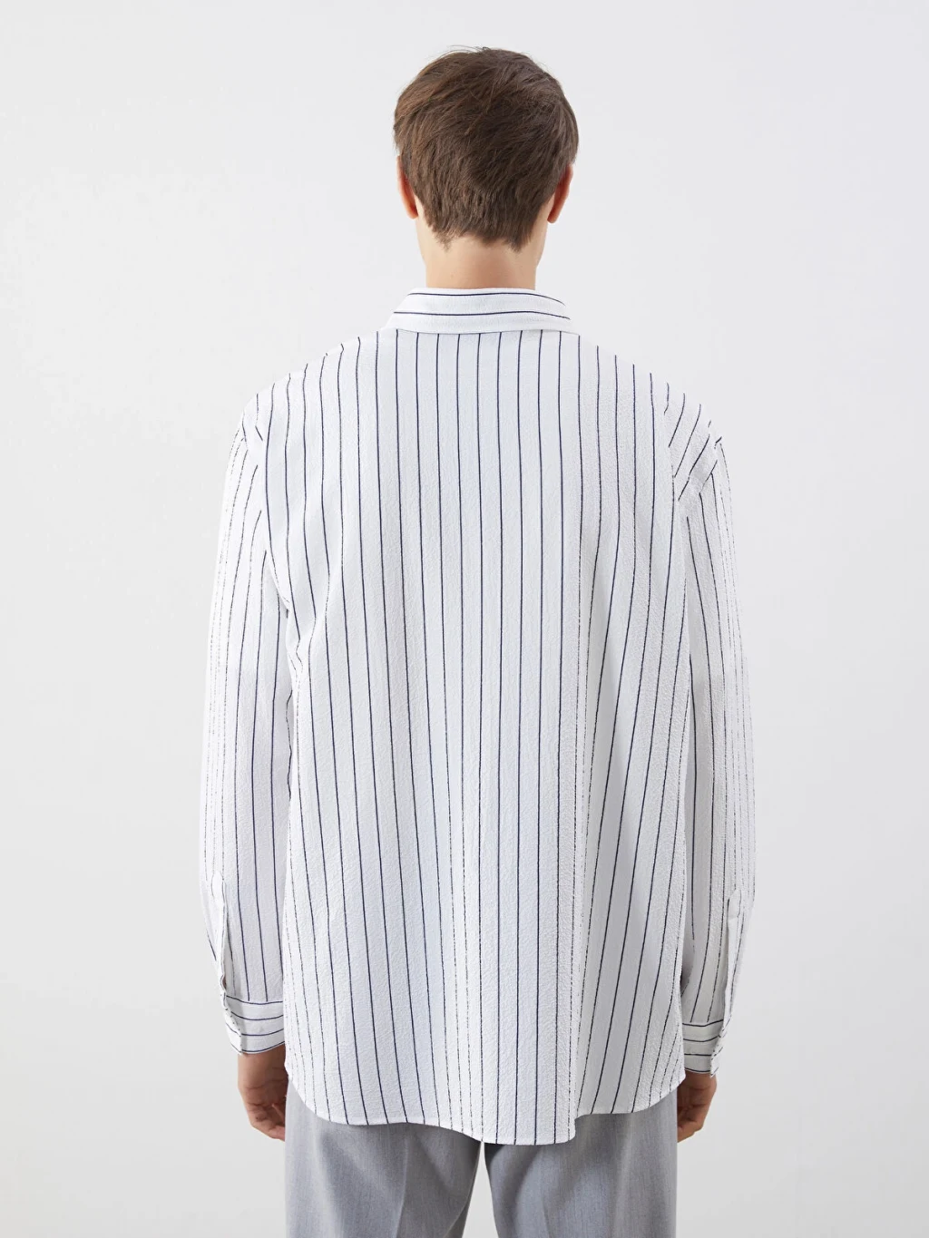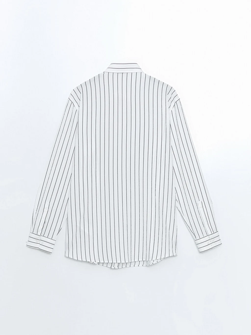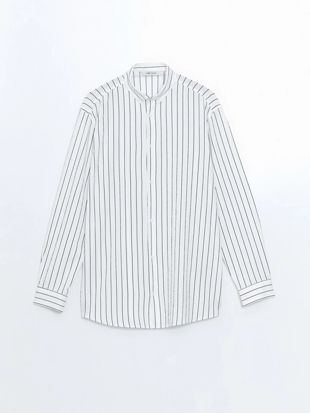 Hakim yakalı, uzun kollu erkek gömlek, çizgili desenli armürlü kumaştan üretilmiştir ve önden düğme kapamalıdır.