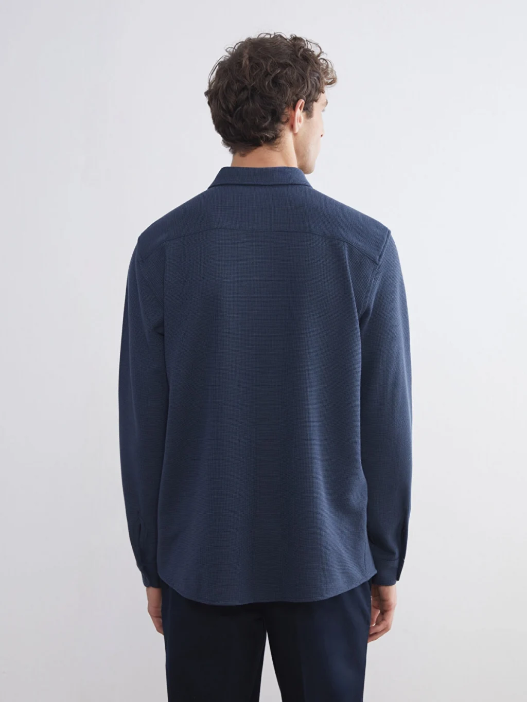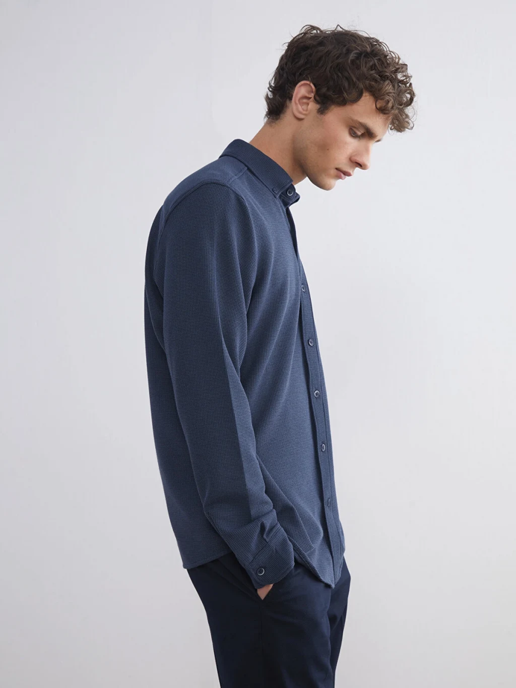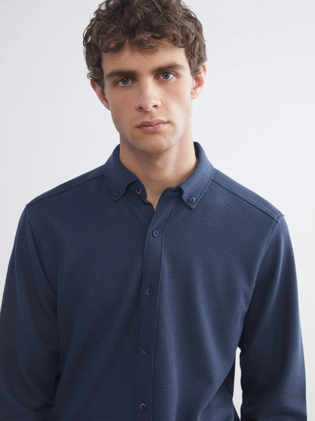 Düğmeli yakalı ve uzun kollu erkek gömlek, dokulu kumaştan üretilmiştir. Önden düğme kapamalıdır ve manşetleri düğmelidir.