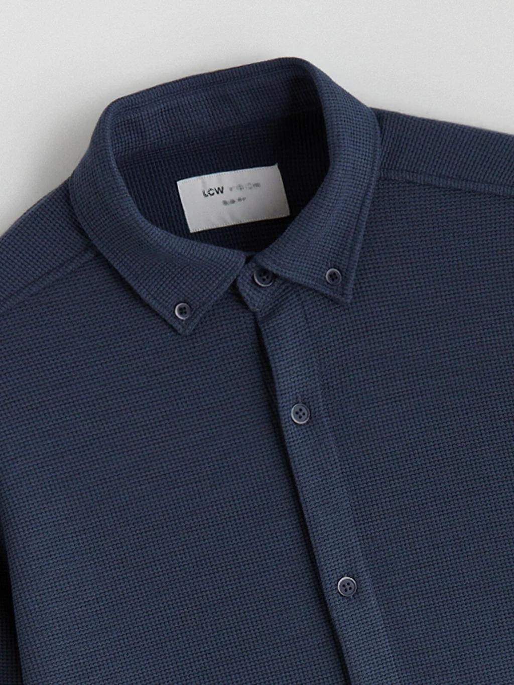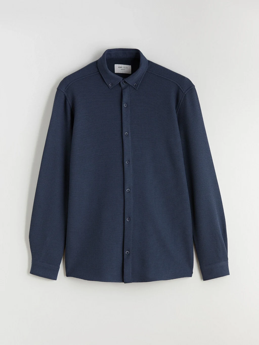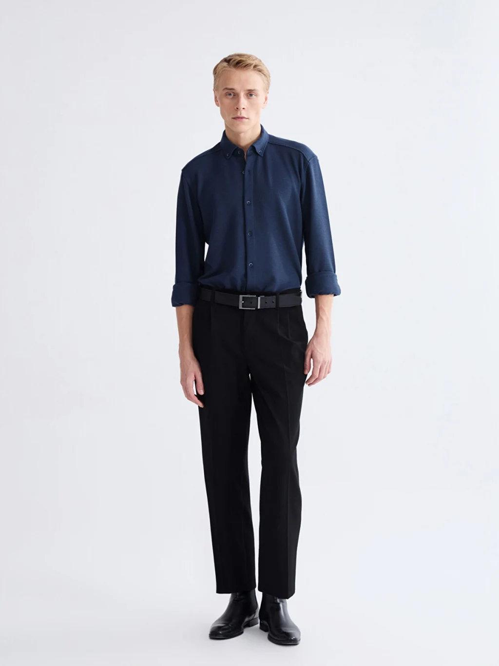 Uzun kollu ve düğmeli gömlek yakalı erkek gömlek, önden düğme kapamalıdır ve kavisli etek ucuna sahiptir.