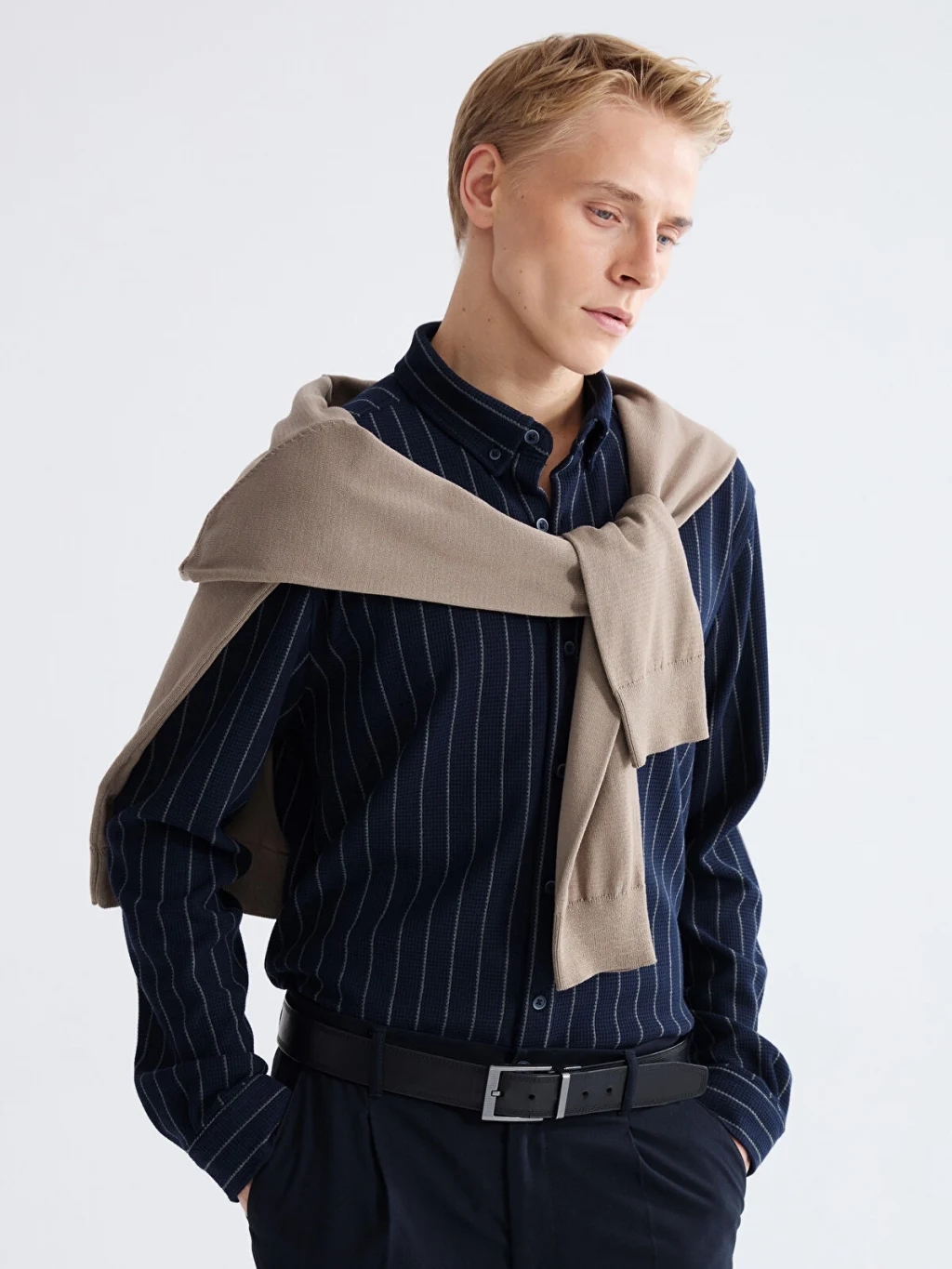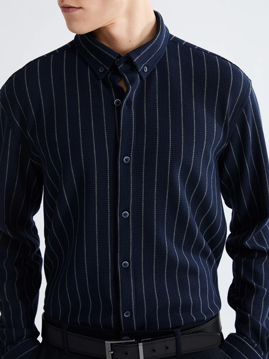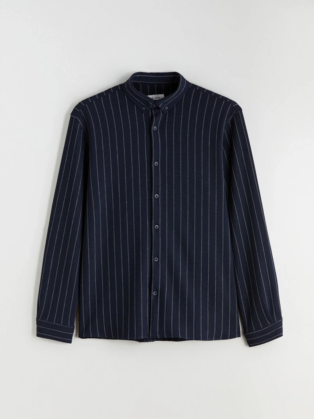 Dikey çizgili, uzun kollu erkek gömlek. Yaka uçları düğmeli önden düğme kapamalı tasarıma sahiptir.