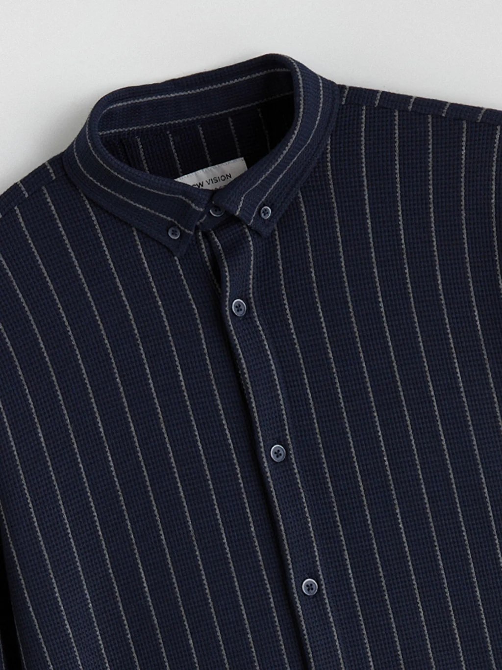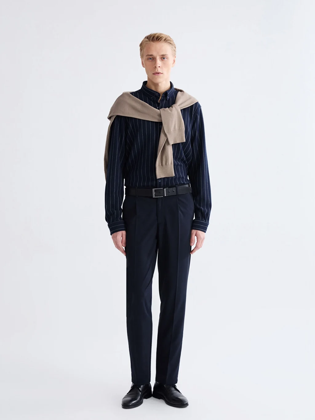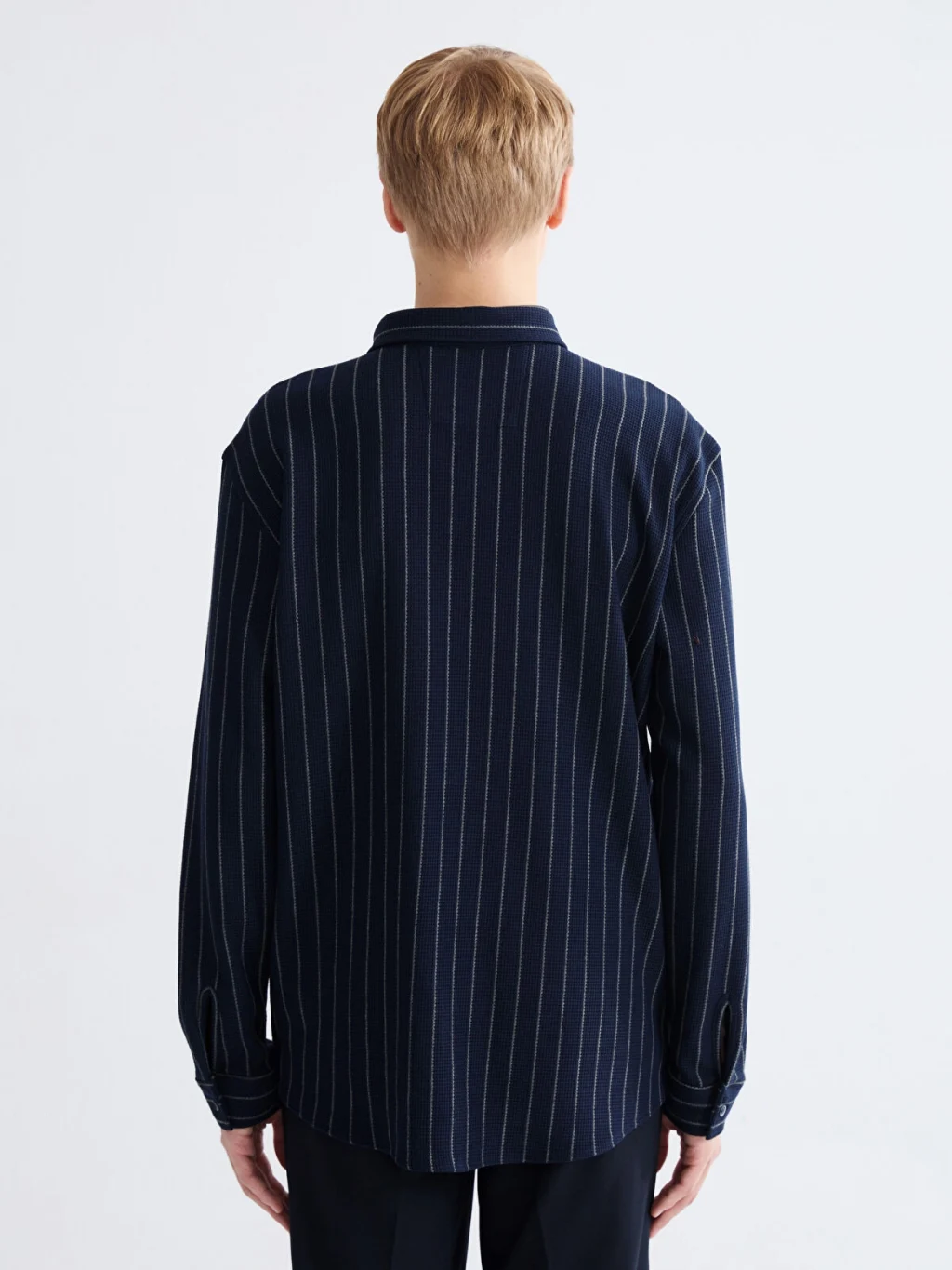 Dikey çizgili, uzun kollu erkek gömlek. Yaka uçları düğmeli önden düğme kapamalı tasarıma sahiptir.