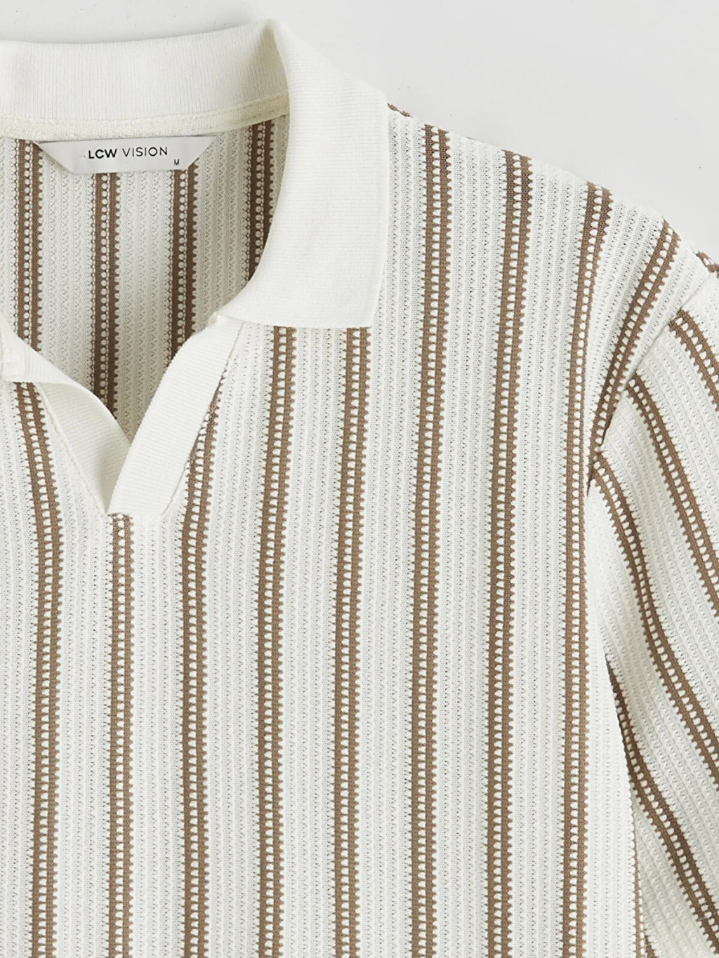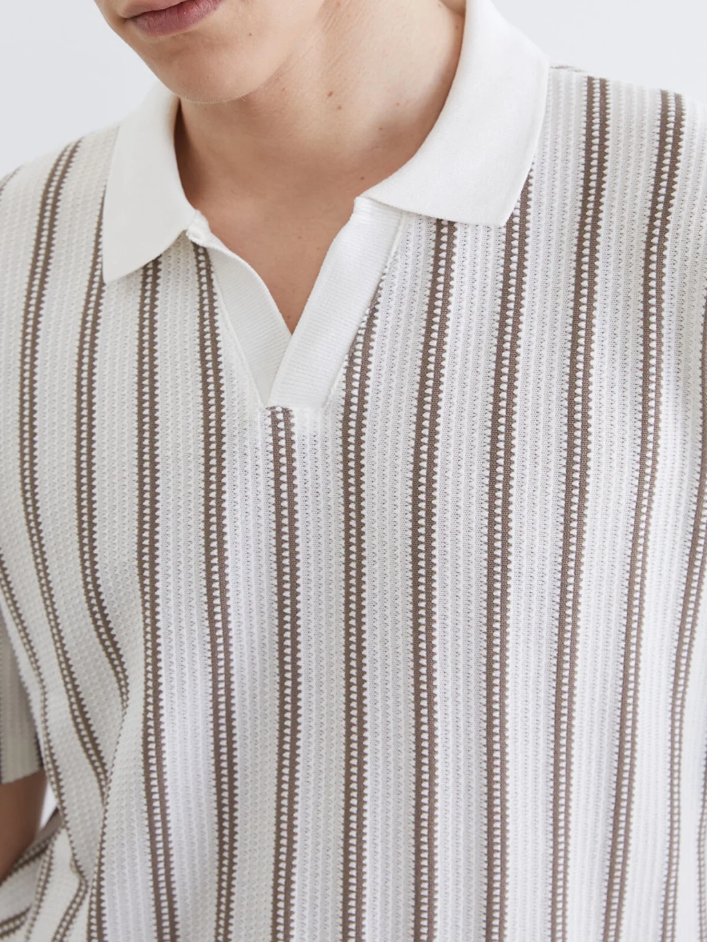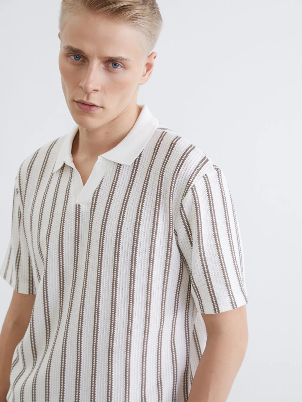 Polo yakalı ve kısa kollu erkek tişört, dokulu kumaştan üretilmiştir. Dikey çizgili desene sahiptir ve yaka kısmı düğmesizdir.