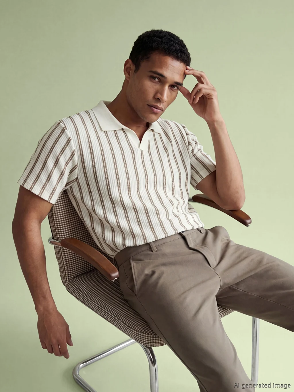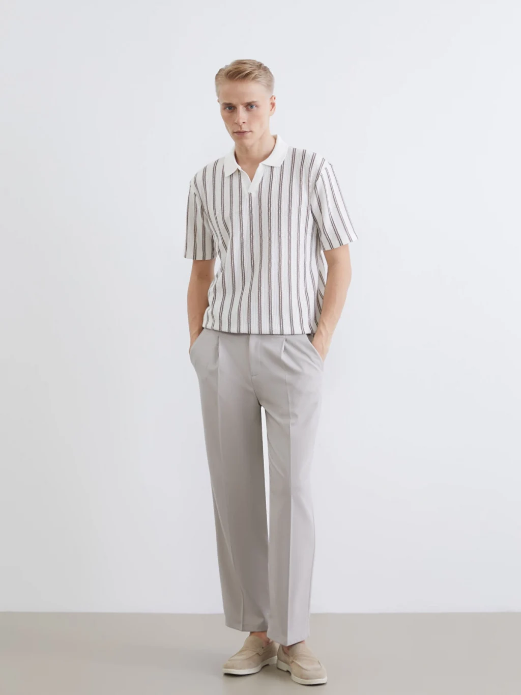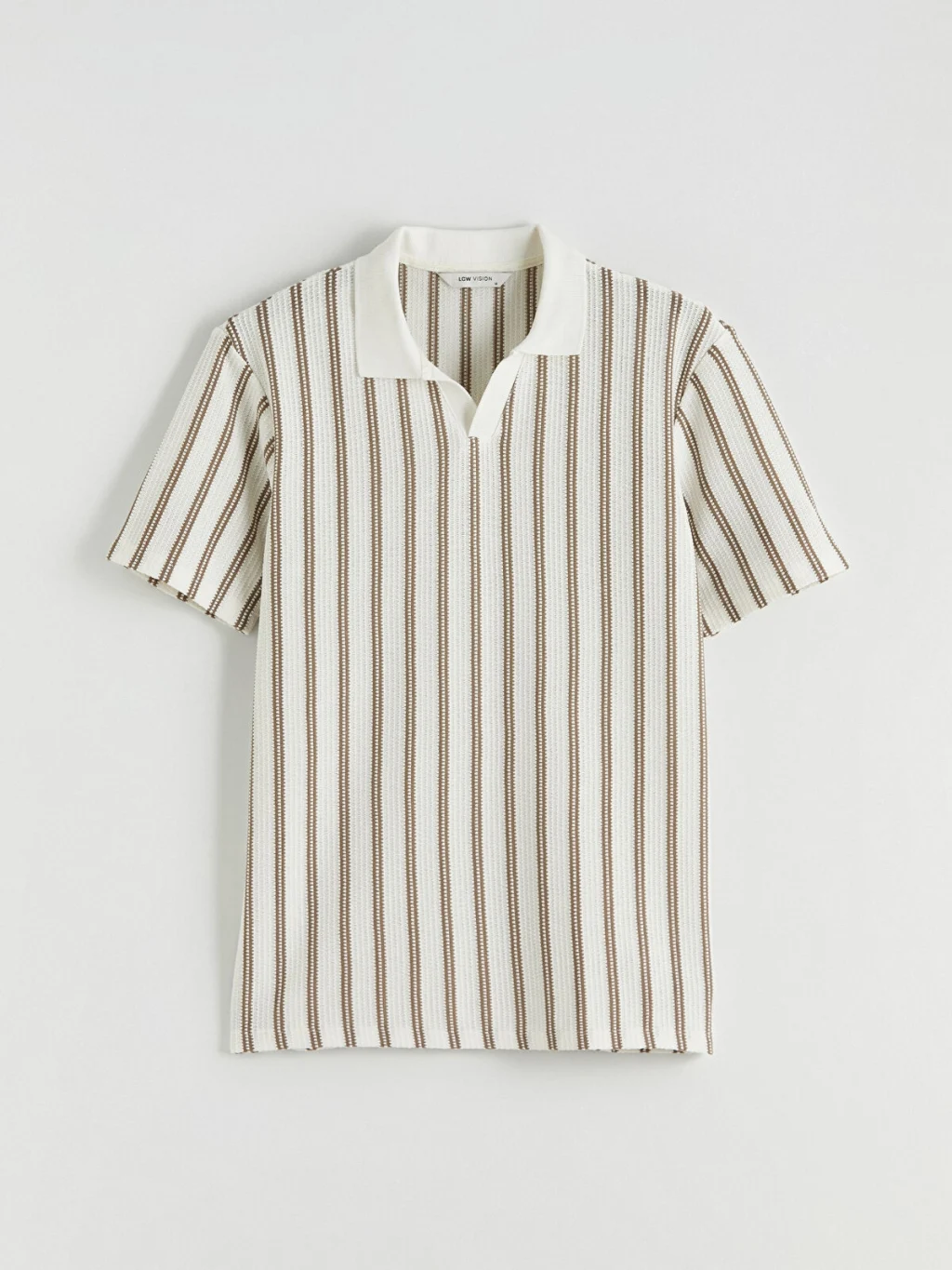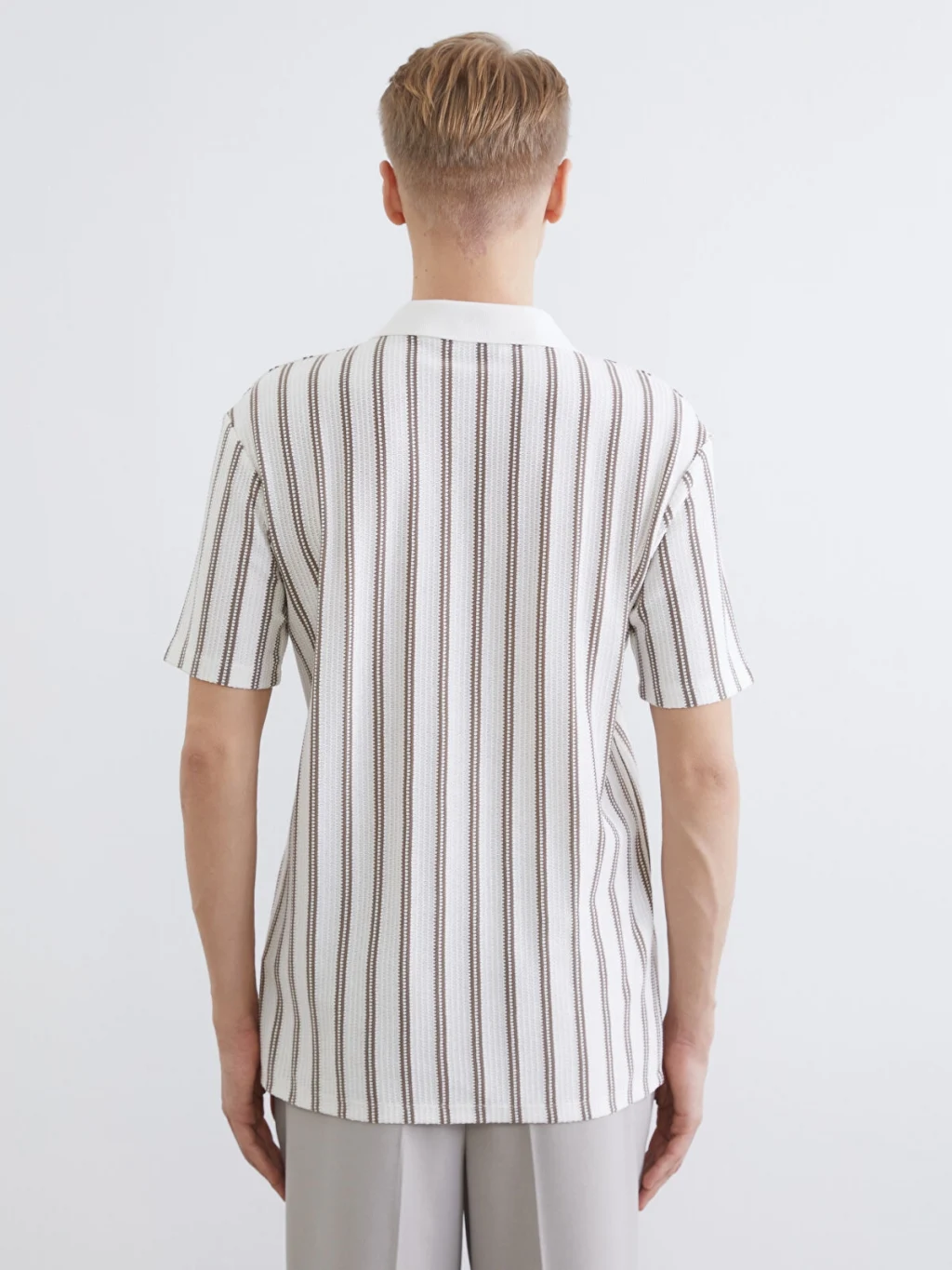 Polo yakalı ve kısa kollu erkek tişört, dokulu kumaştan üretilmiştir. Dikey çizgili desene sahiptir ve yaka kısmı düğmesizdir.