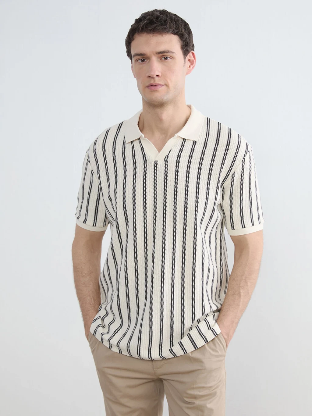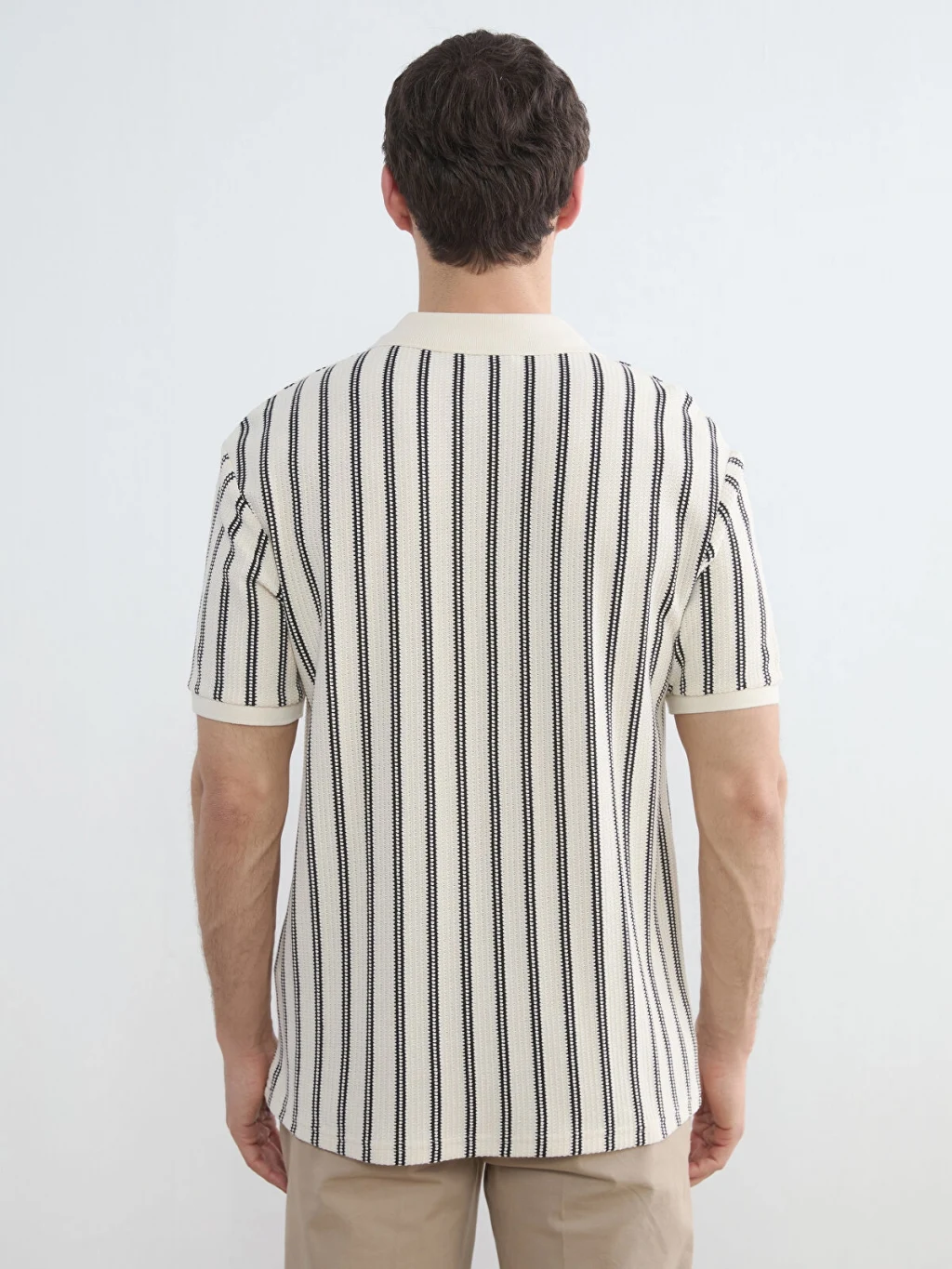 Polo yakalı ve kısa kollu erkek tişört, çizgili desene sahiptir. Yüksek pamuk içerikli kumaştan üretilmiştir.