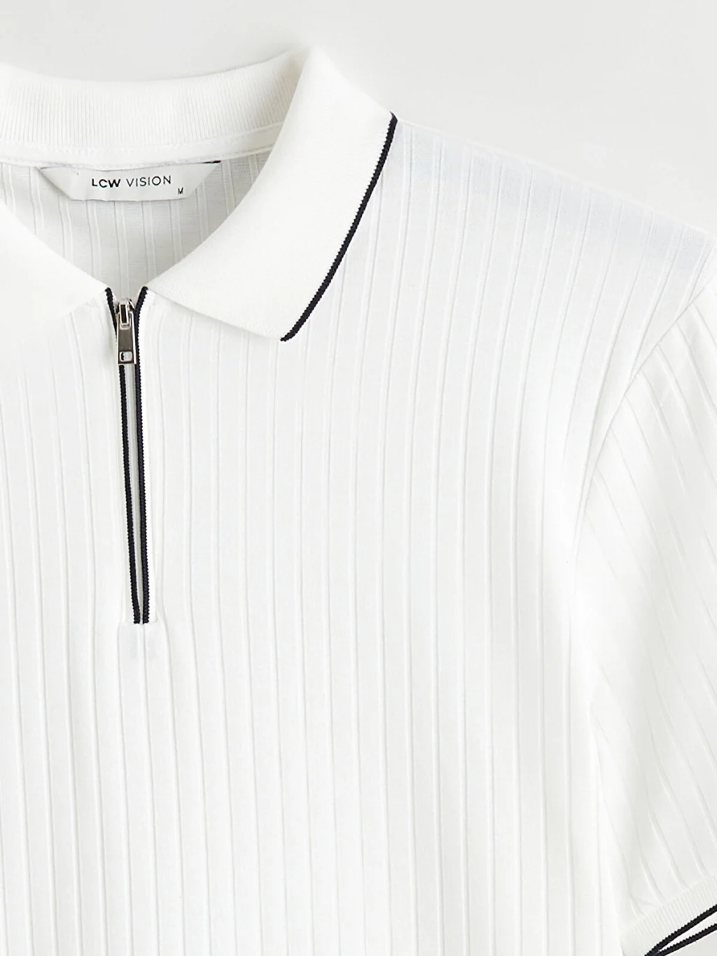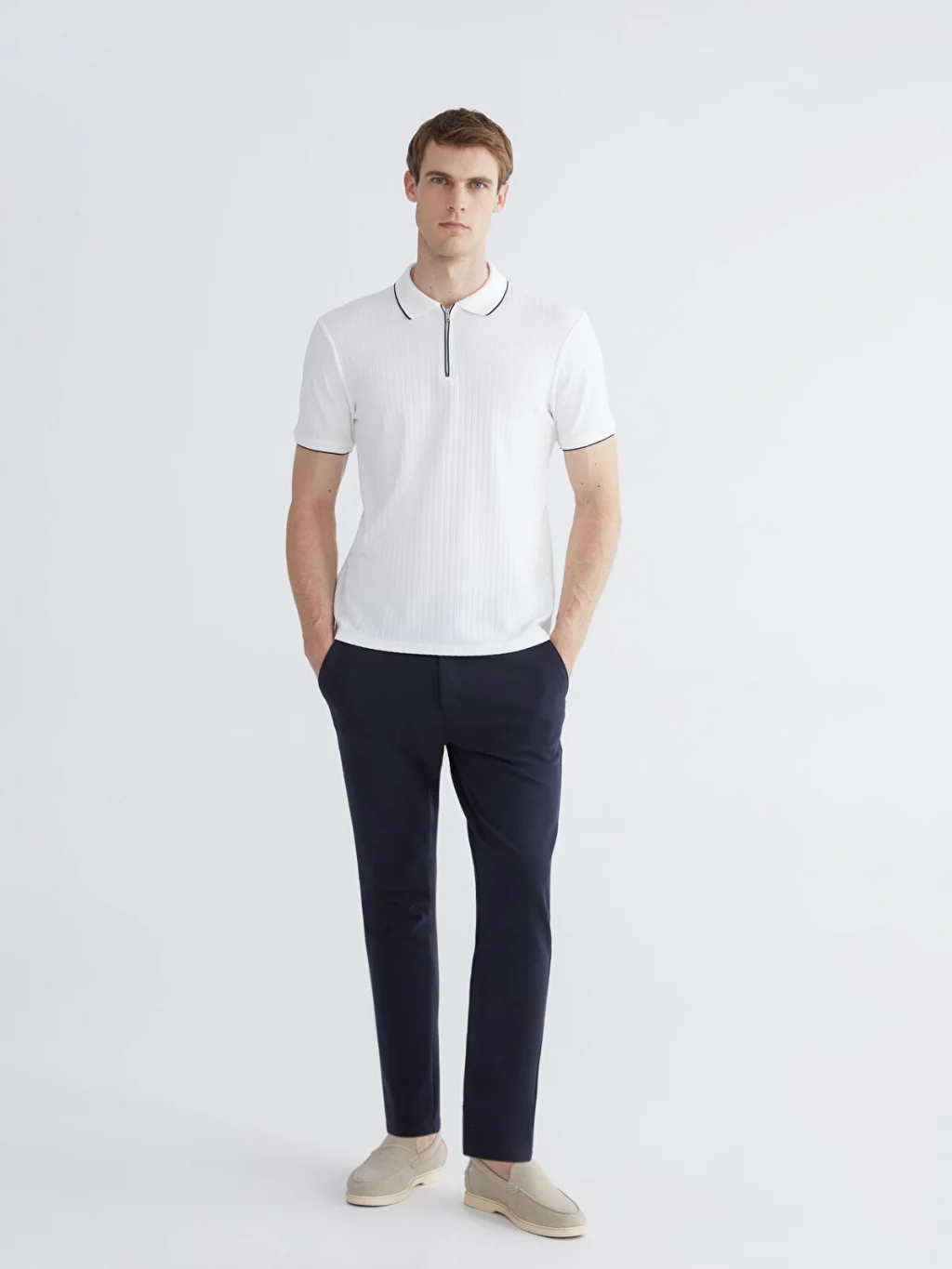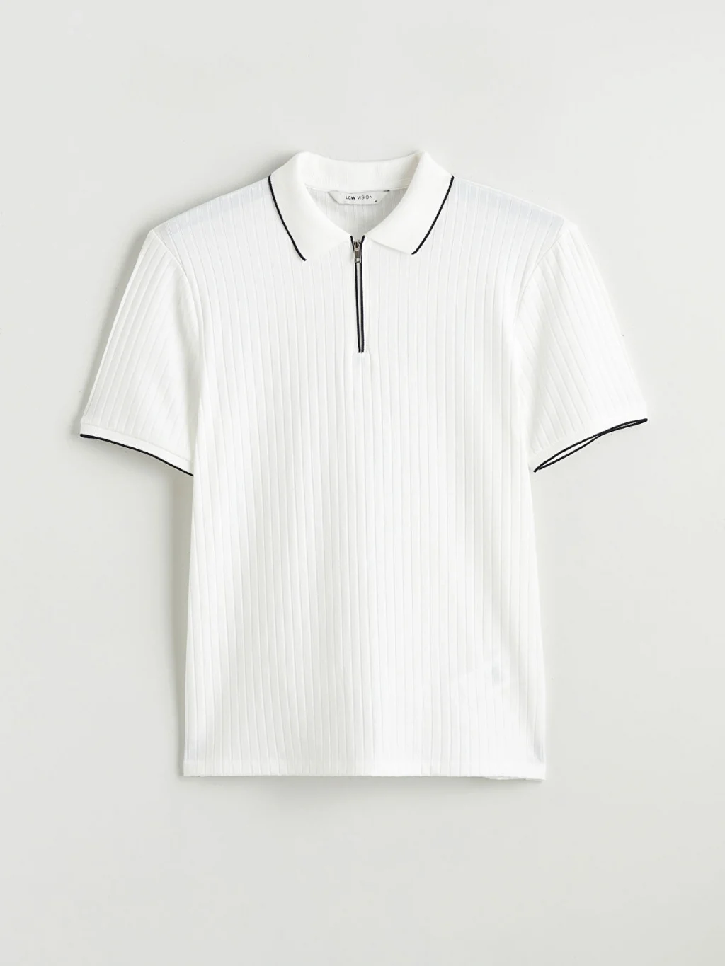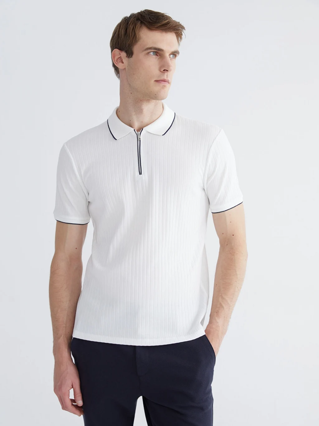 Standart kalıp, polo yakalı erkek tişört, fitilli kumaştan üretilmiştir. Kısa kollu ve yarım fermuar kapamalıdır, yaka ve kol ucu biyelidir.