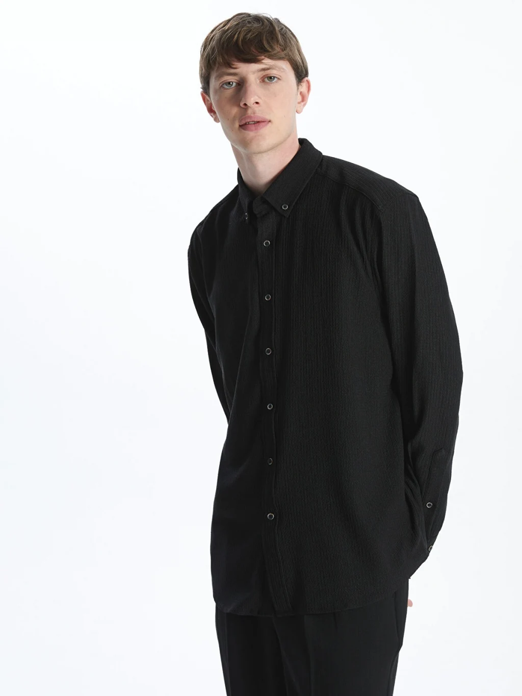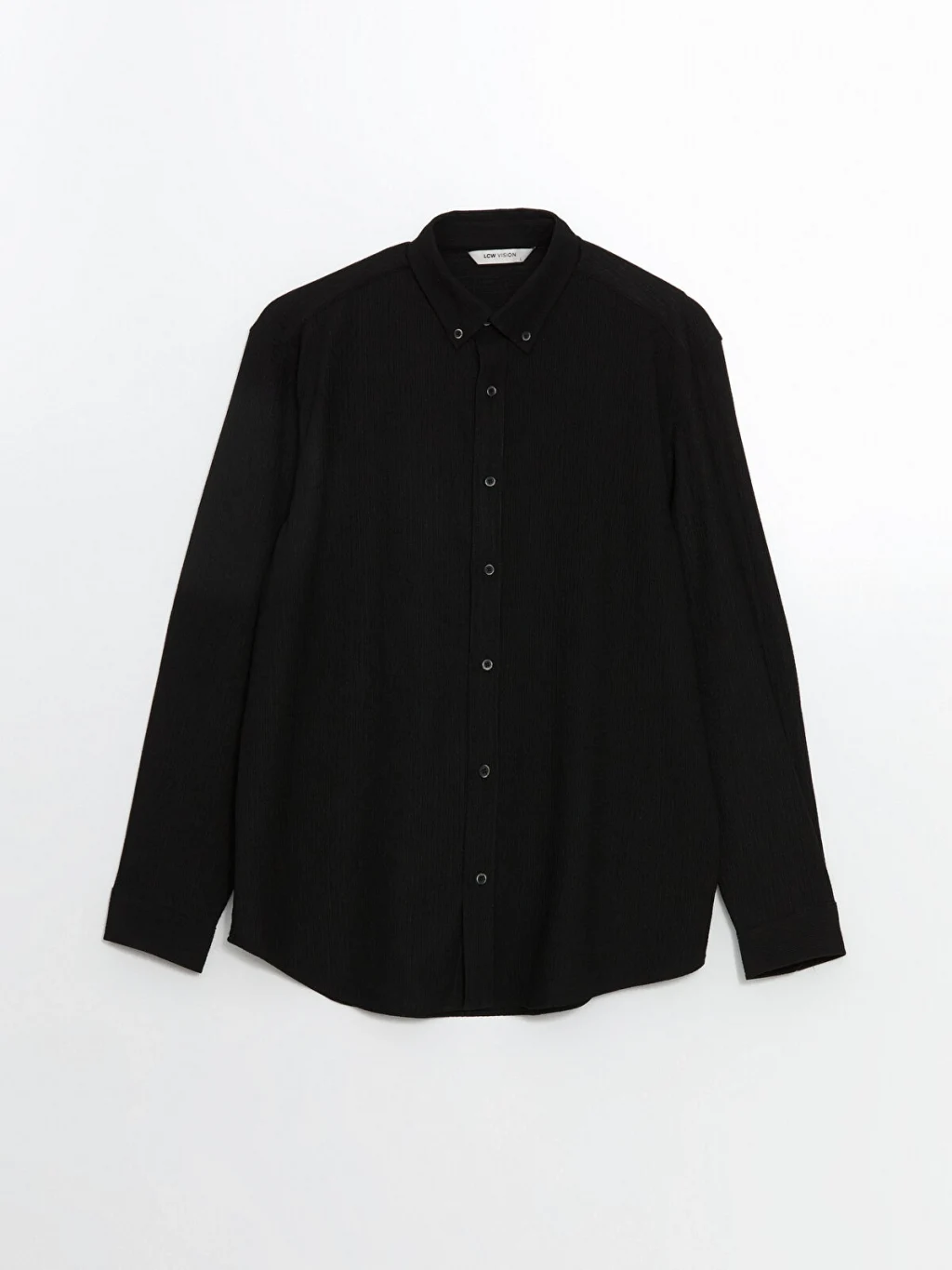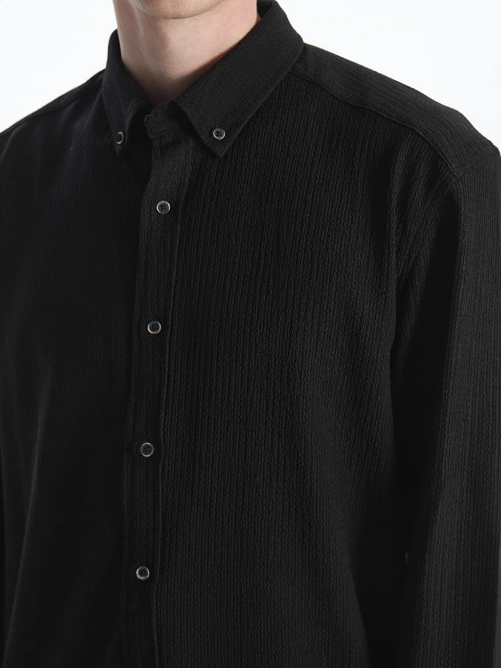 Gofre kumaştan üretilmiş, düğmeli gömlek yakalı ve uzun kollu erkek gömlek, önden düğme kapamalıdır.