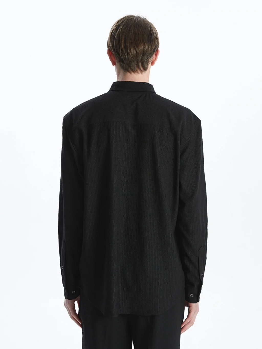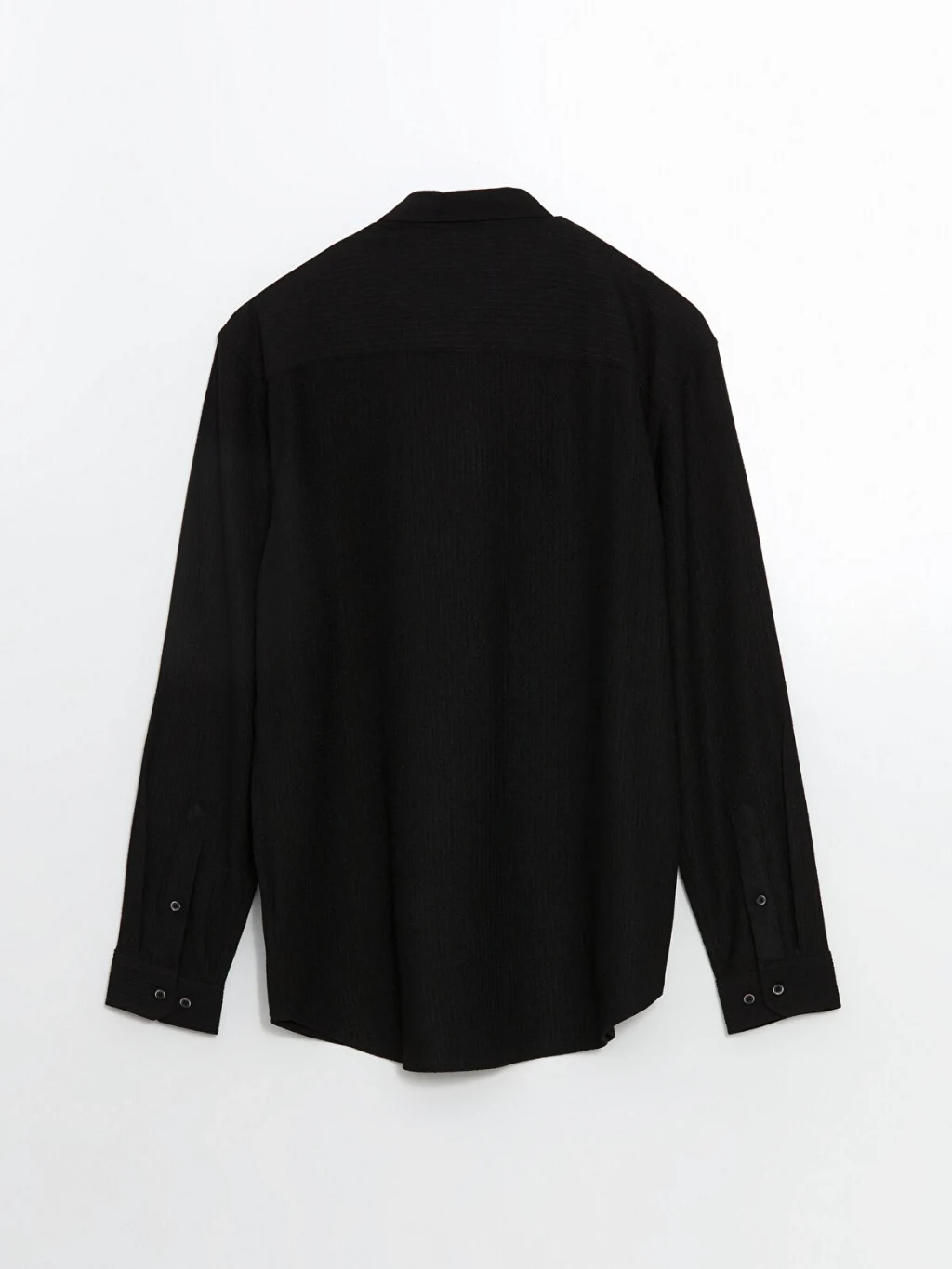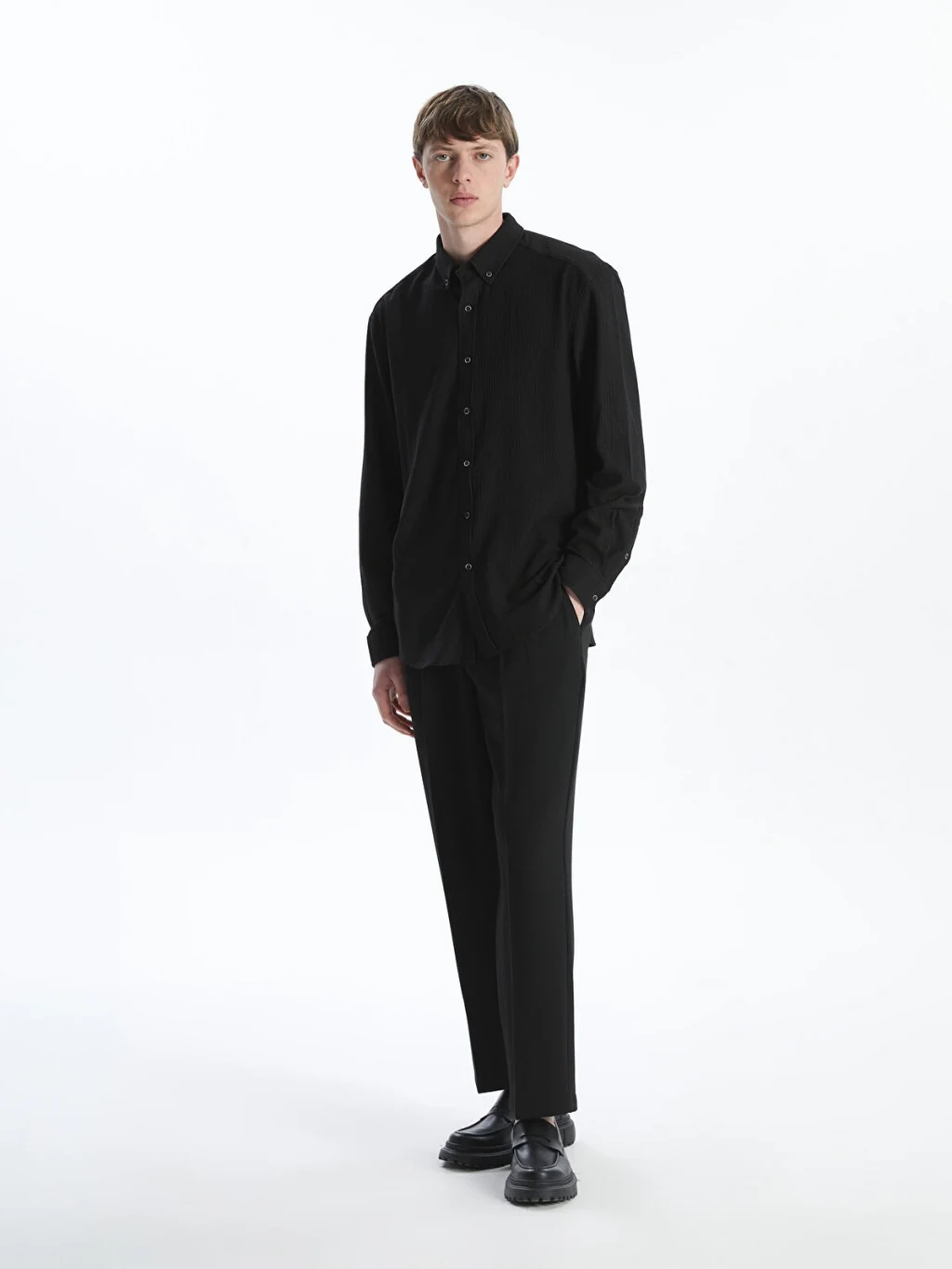 Gofre kumaştan üretilmiş, düğmeli gömlek yakalı ve uzun kollu erkek gömlek, önden düğme kapamalıdır.