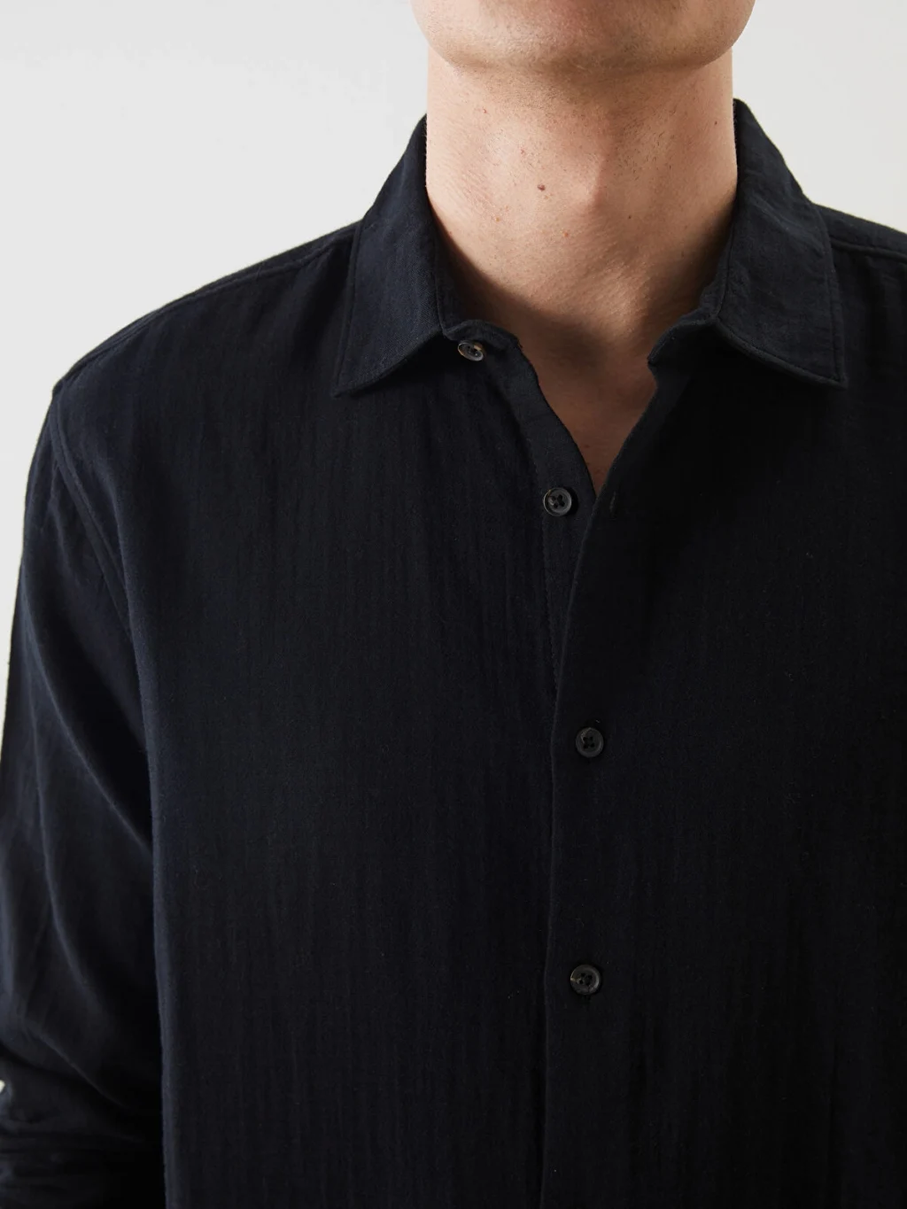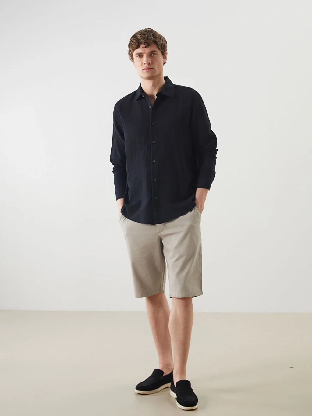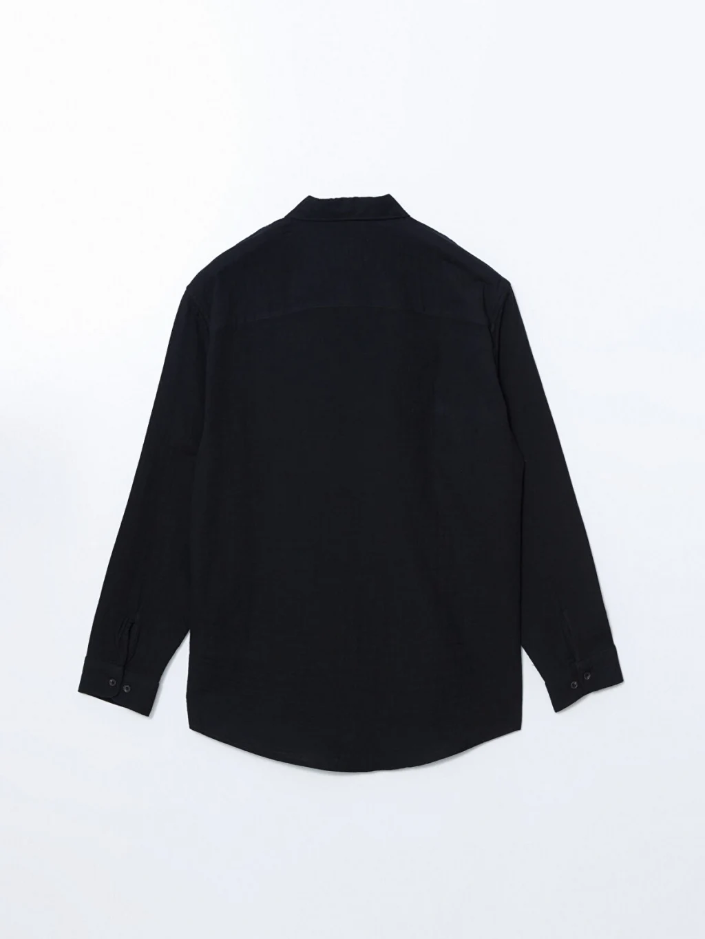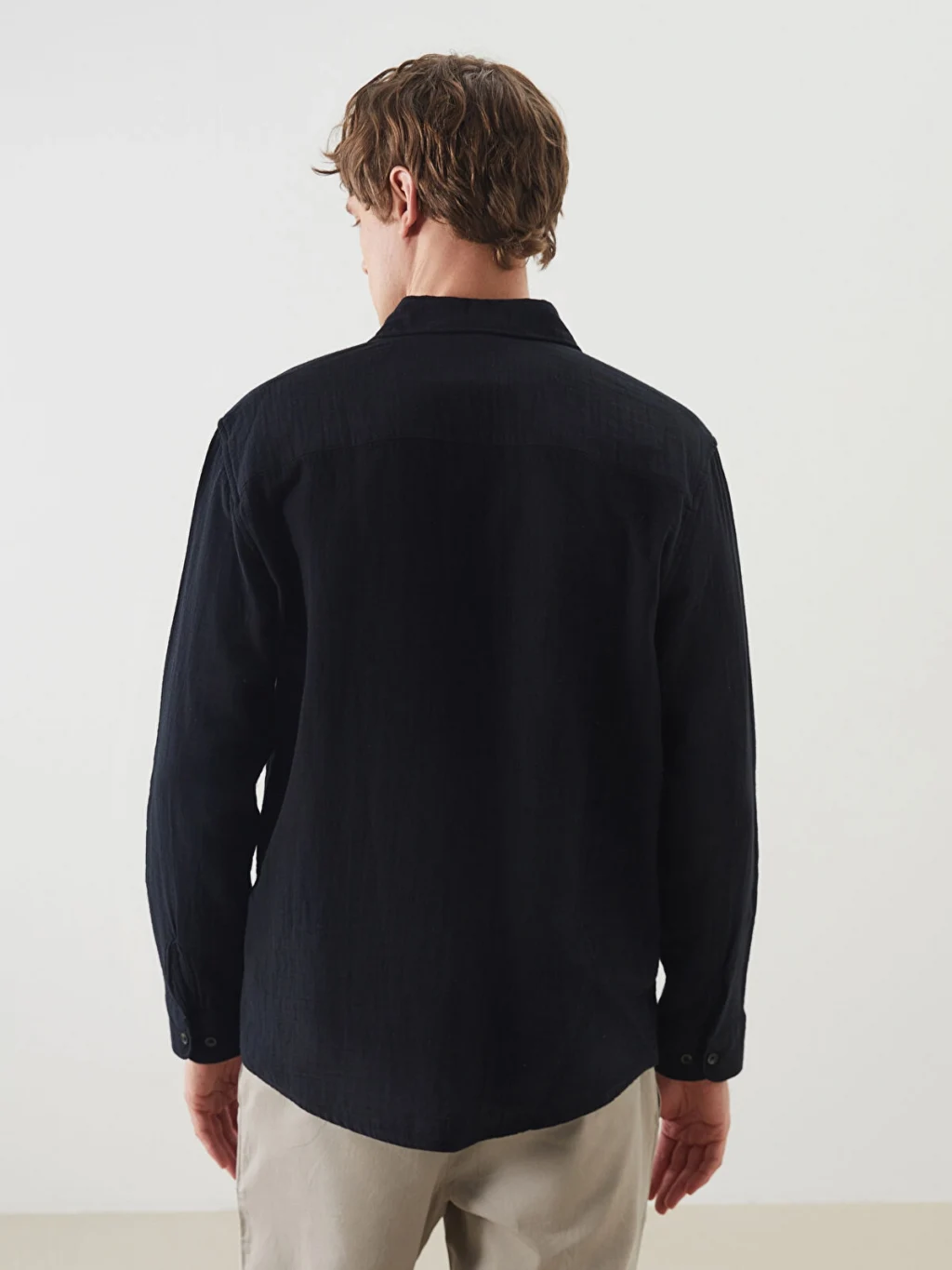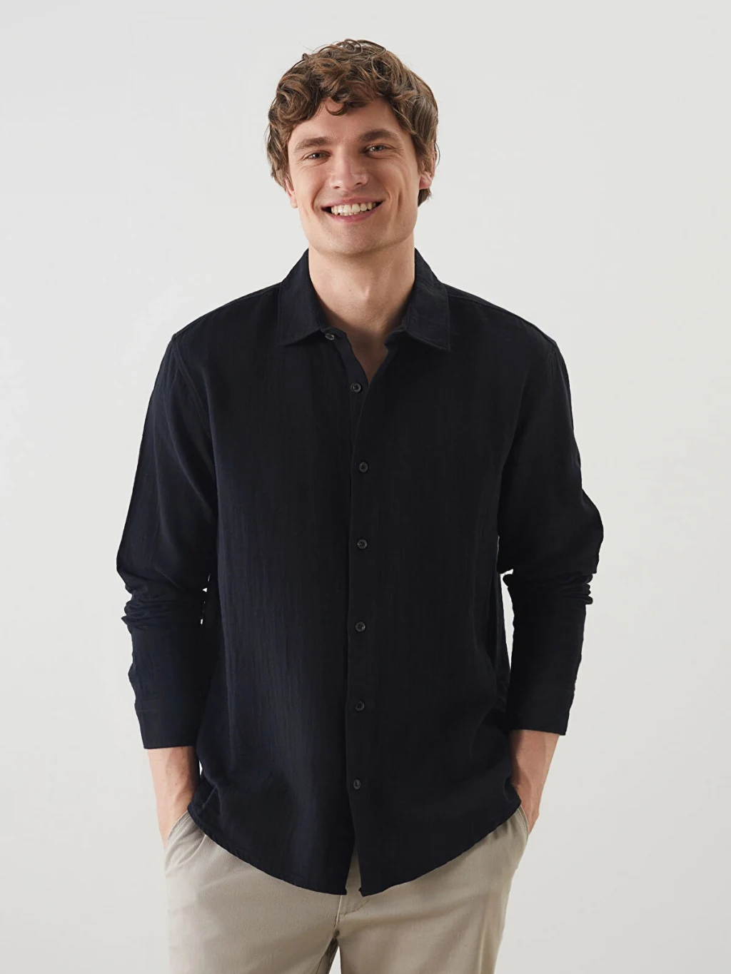 Gömlek yakalı ve uzun kollu erkek gömlek, %100 pamuklu müslin kumaştan üretilmiştir. Önden düğme kapamalıdır.