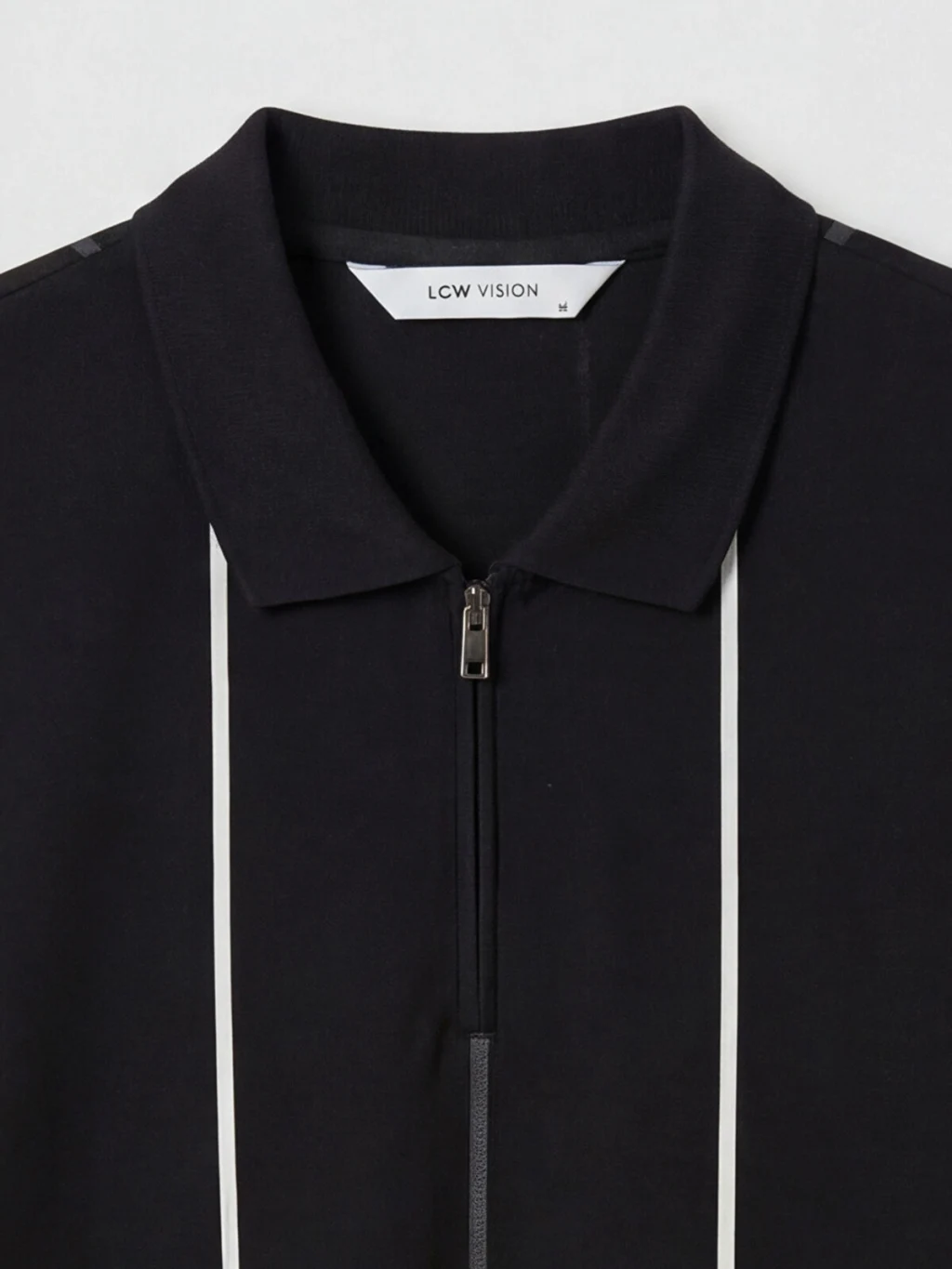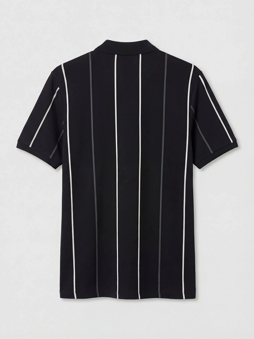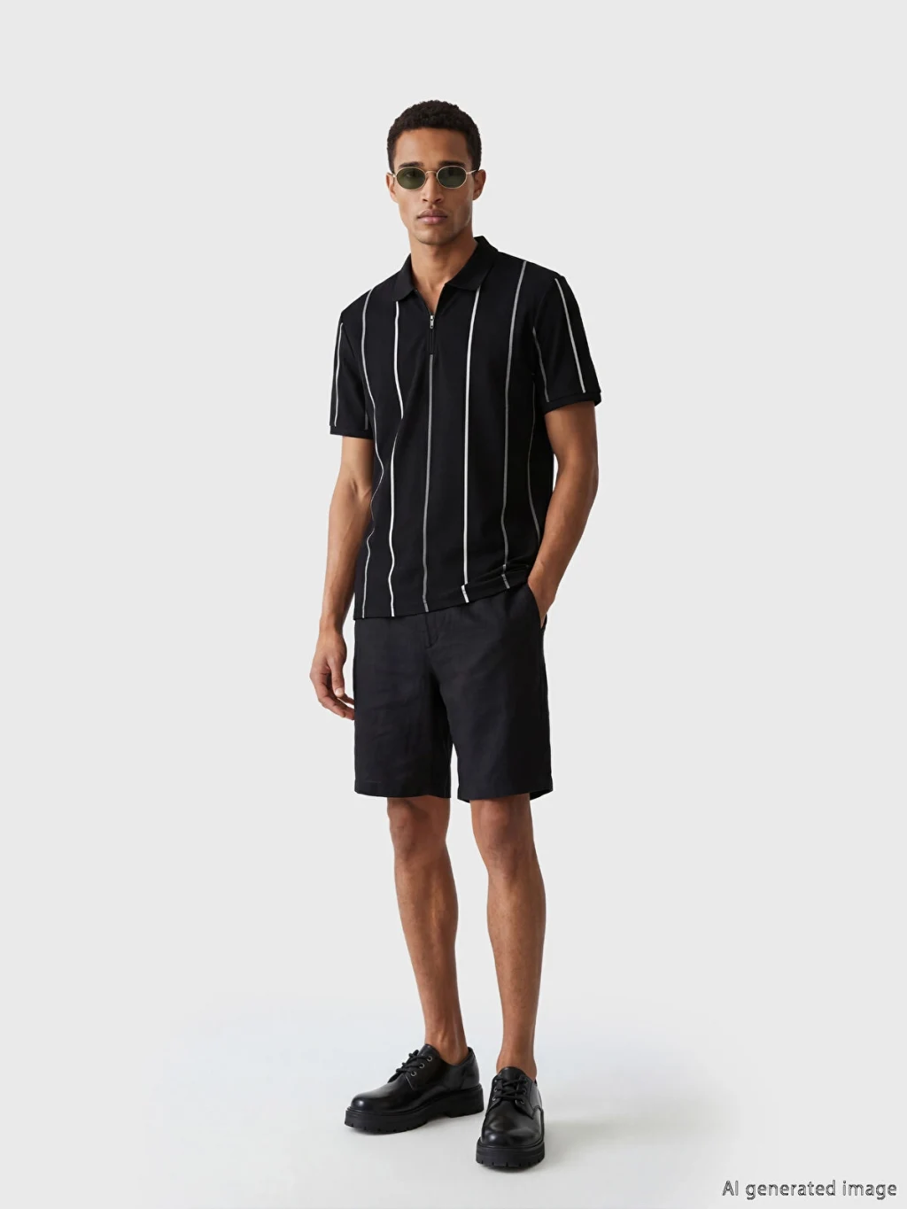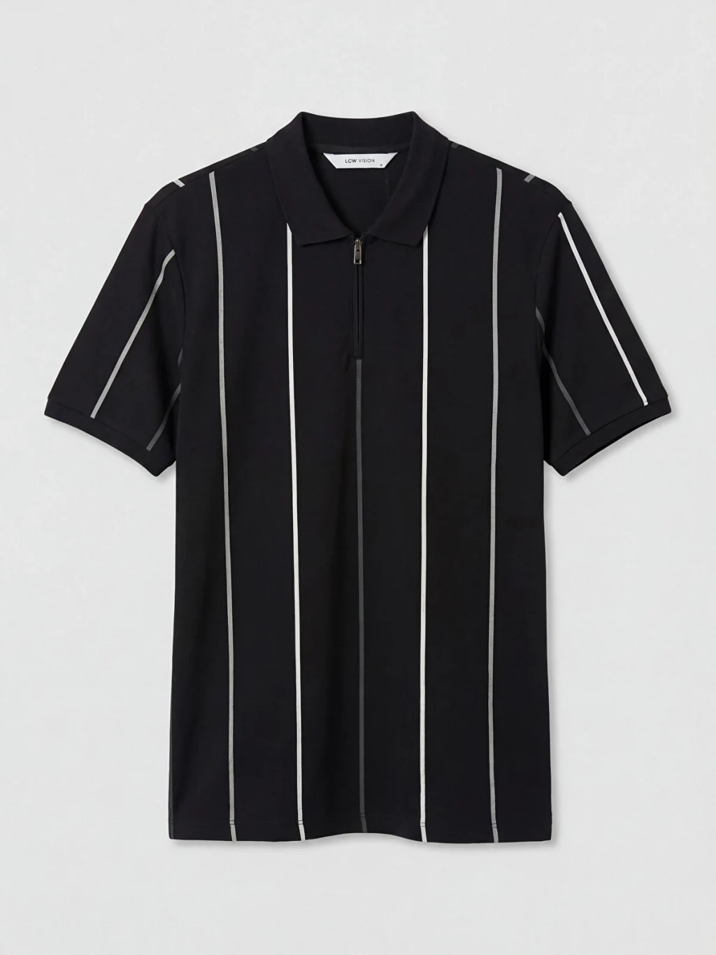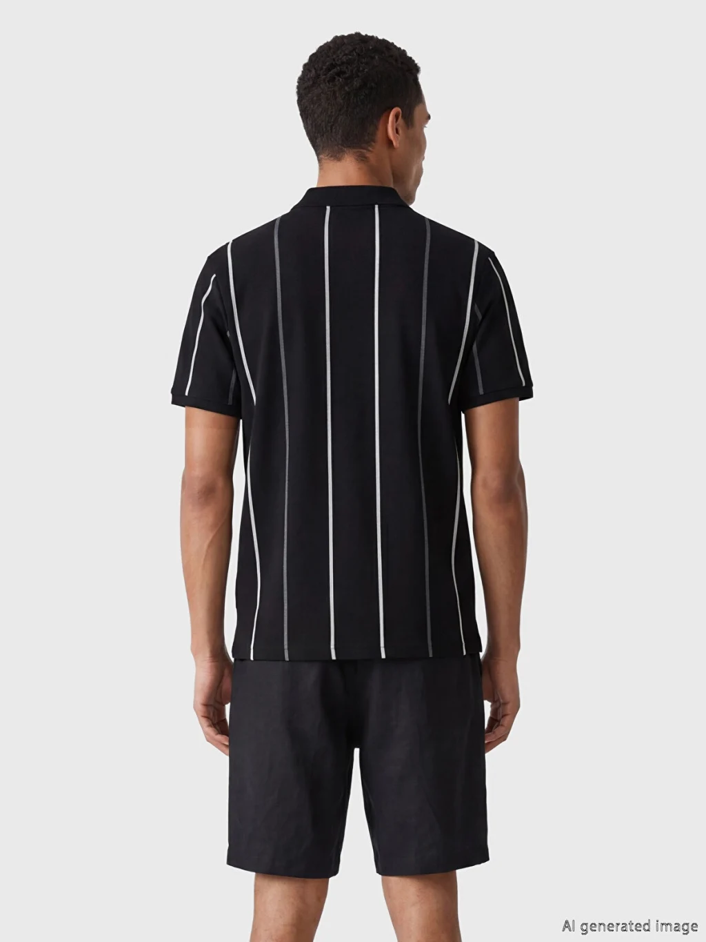 Polo yakalı ve kısa kollu erkek tişört, %100 pamuk içerikli pike kumaştan üretilmiştir. Çizgili desenli olup önü yarım fermuar kapamalıdır.