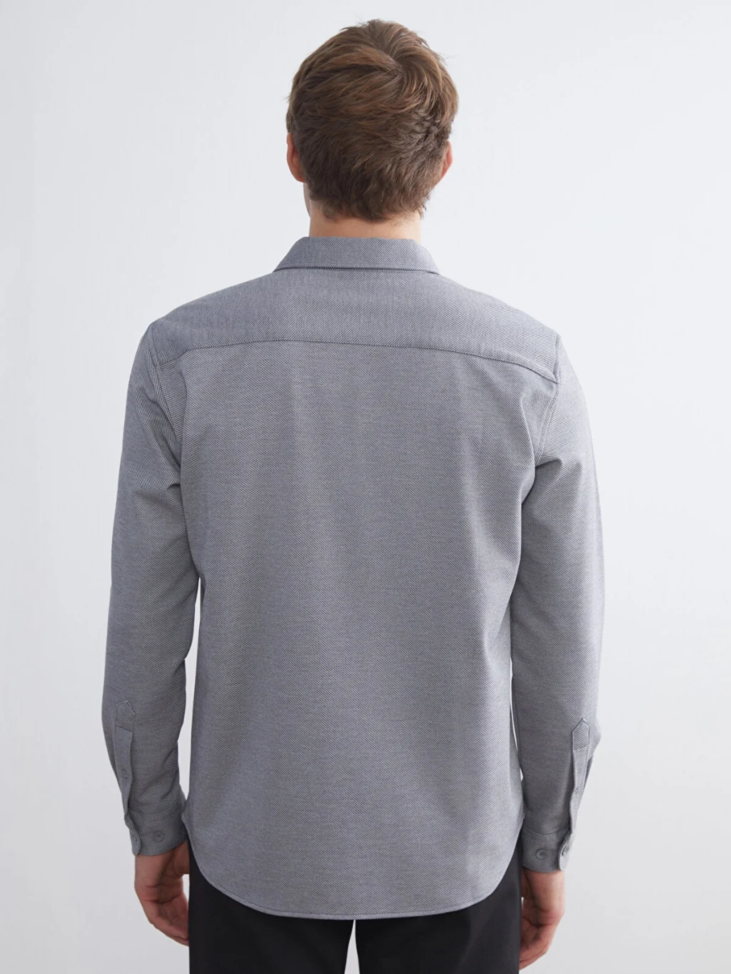 Gömlek yakalı ve uzun kollu erkek gömlek, önden düğme kapamalıdır ve manşetli tasarıma sahiptir.