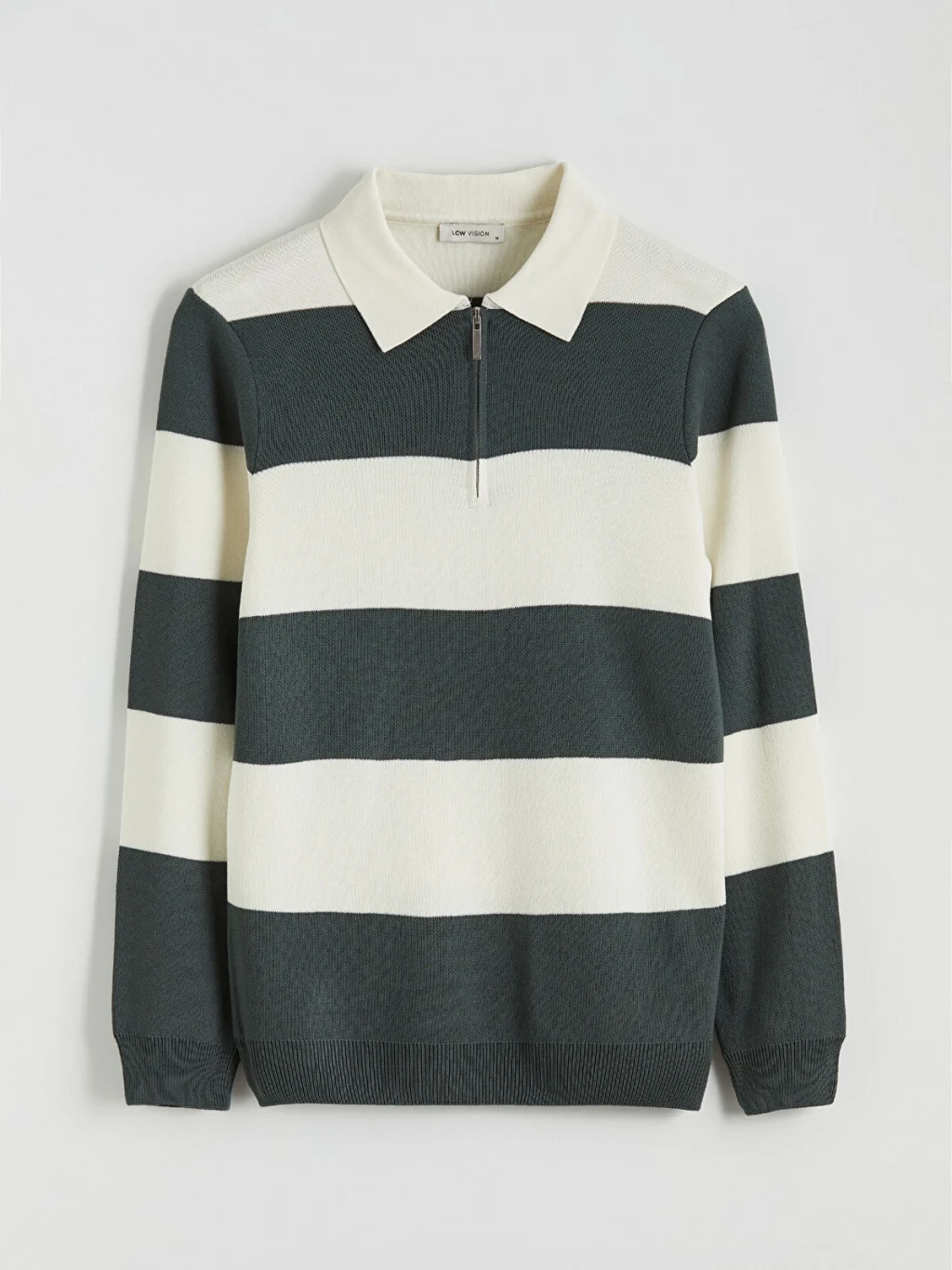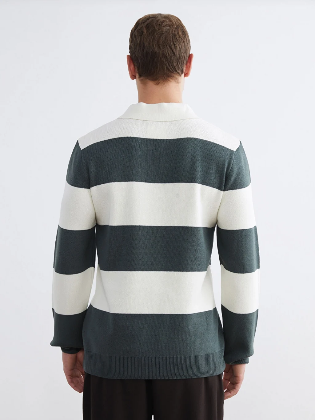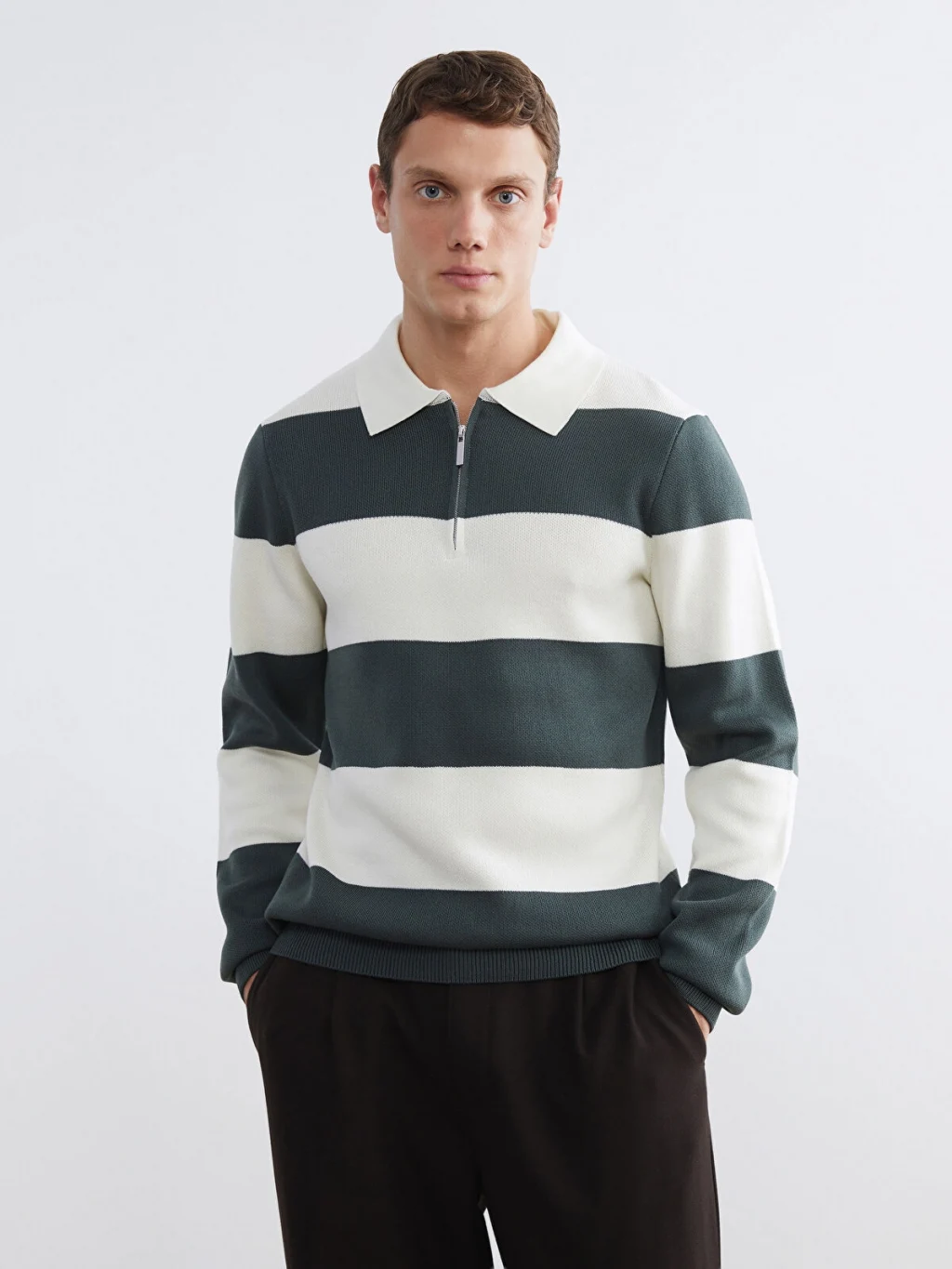 Yarım fermuar kapamalı polo yaka erkek kazak, uzun kollu ve çizgili desene sahiptir. Manşetleri ve etek ucu ribanalıdır.