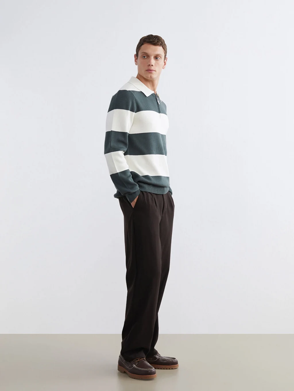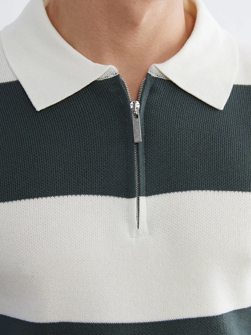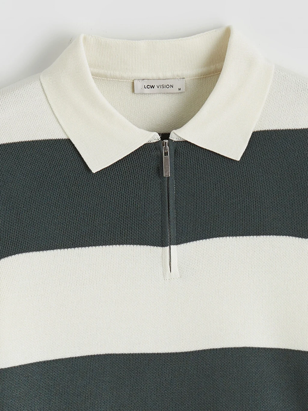Yarım fermuar kapamalı polo yaka erkek kazak, uzun kollu ve çizgili desene sahiptir. Manşetleri ve etek ucu ribanalıdır.