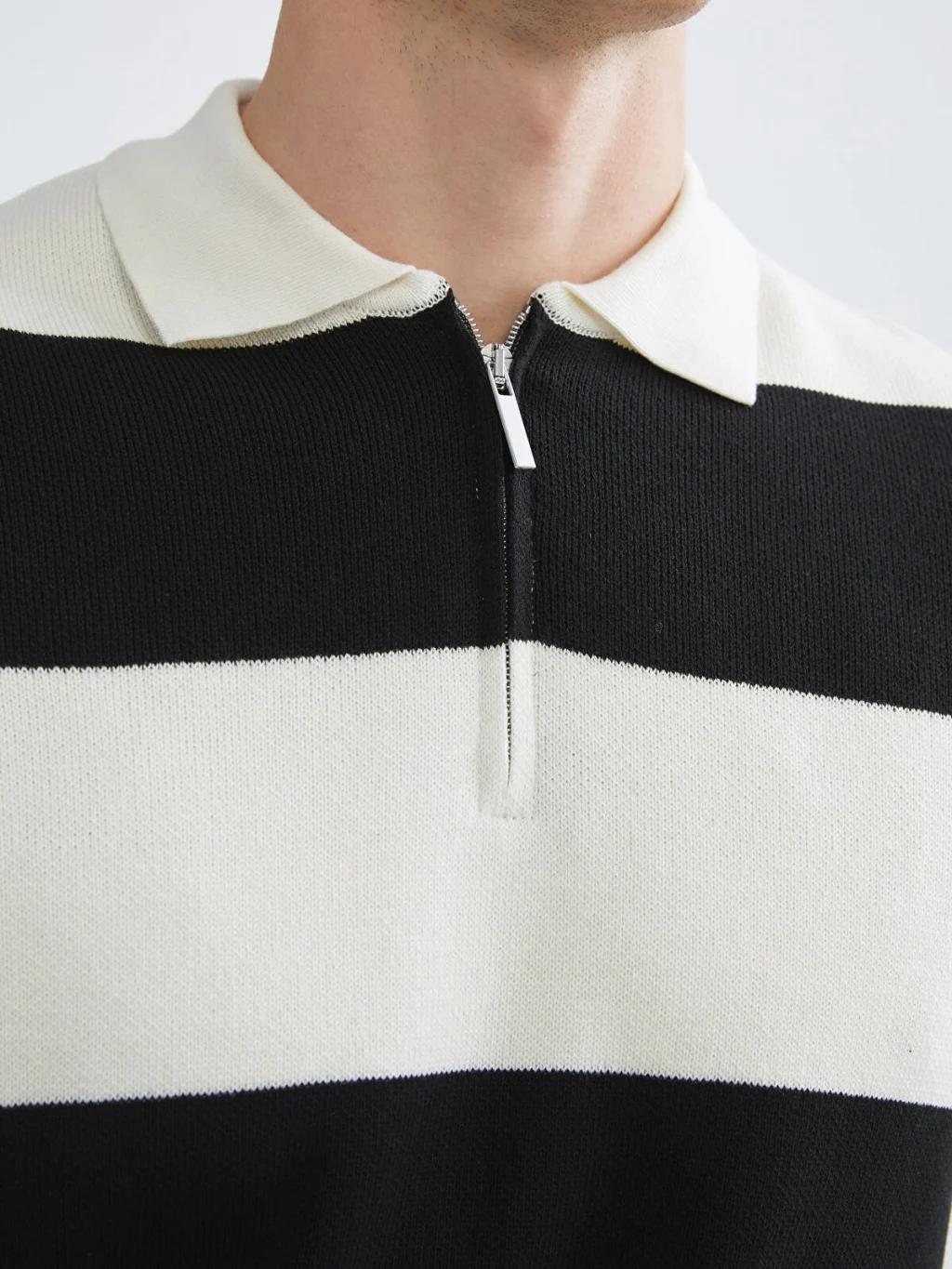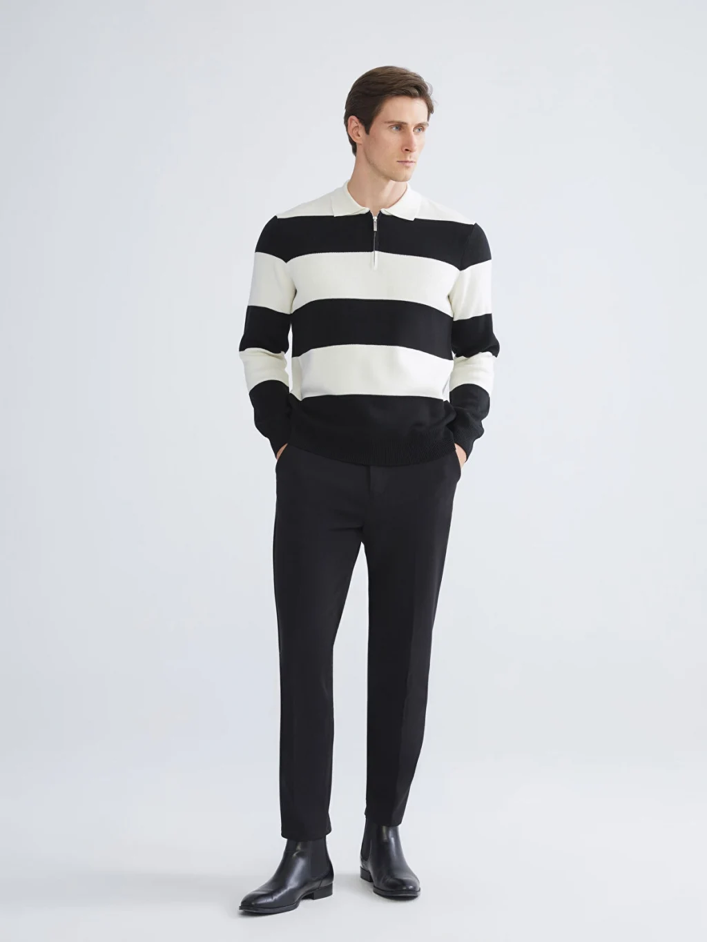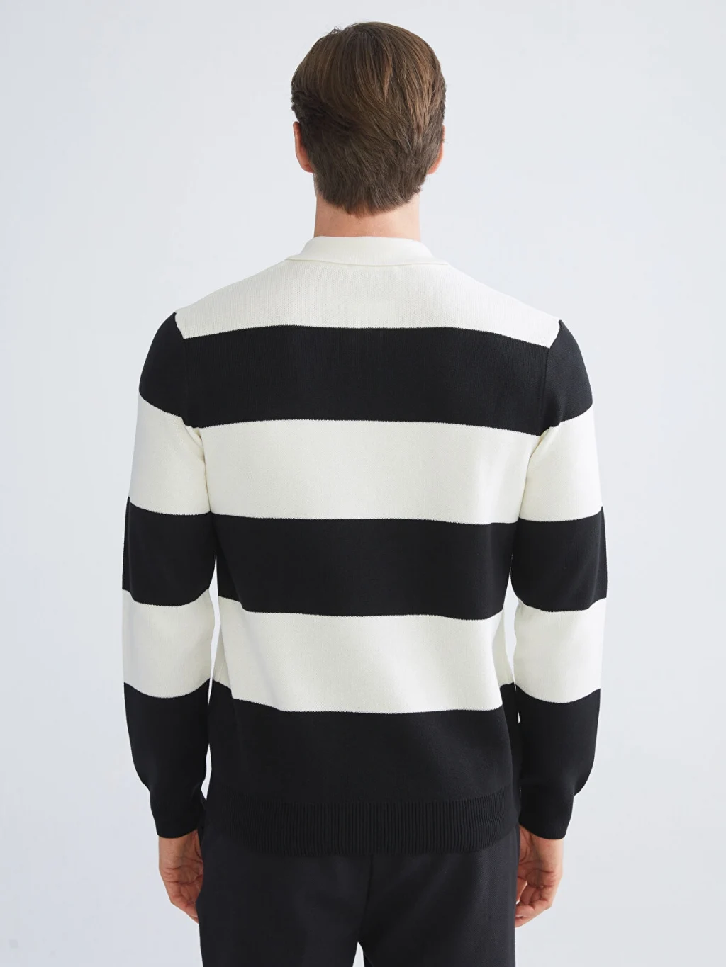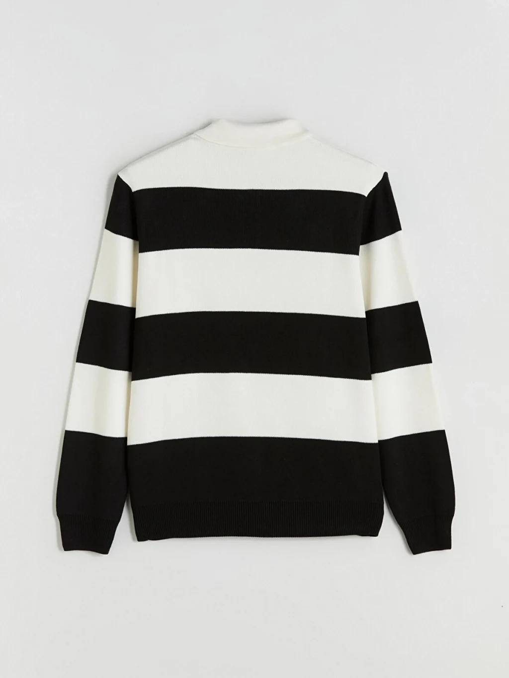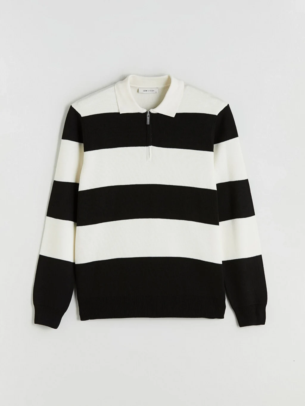 Yarım fermuar kapamalı polo yaka erkek kazak, uzun kollu ve çizgili desene sahiptir. Manşetleri ve etek ucu ribanalıdır.