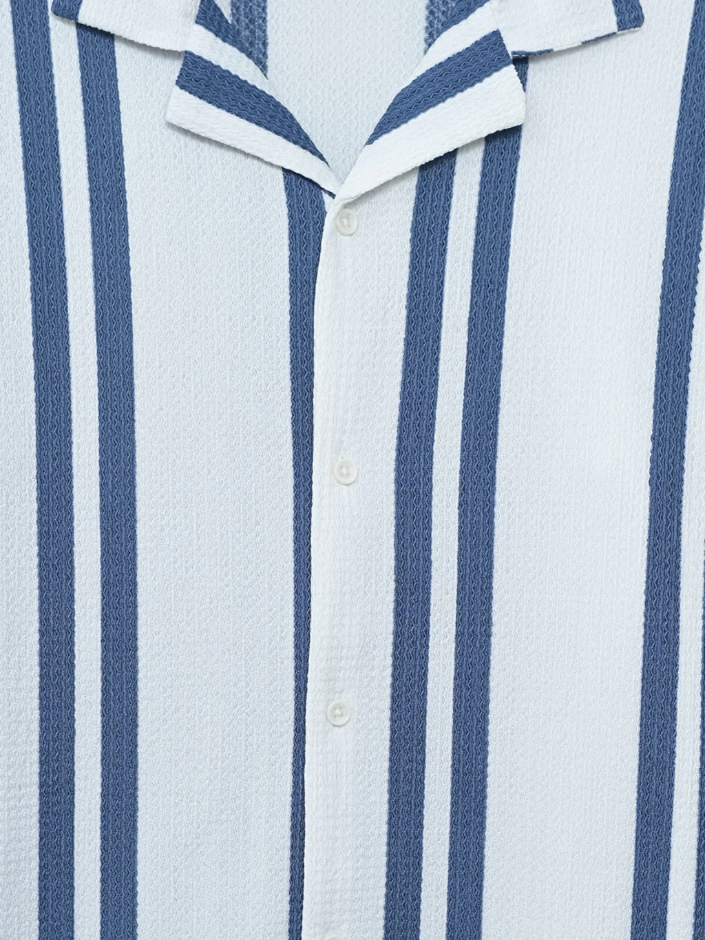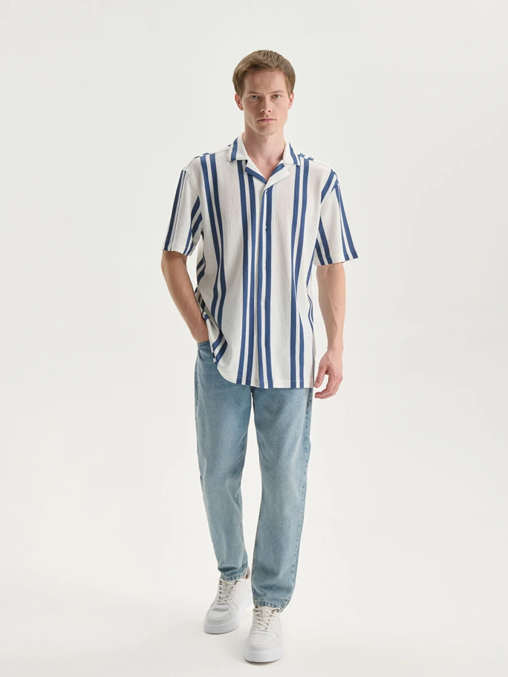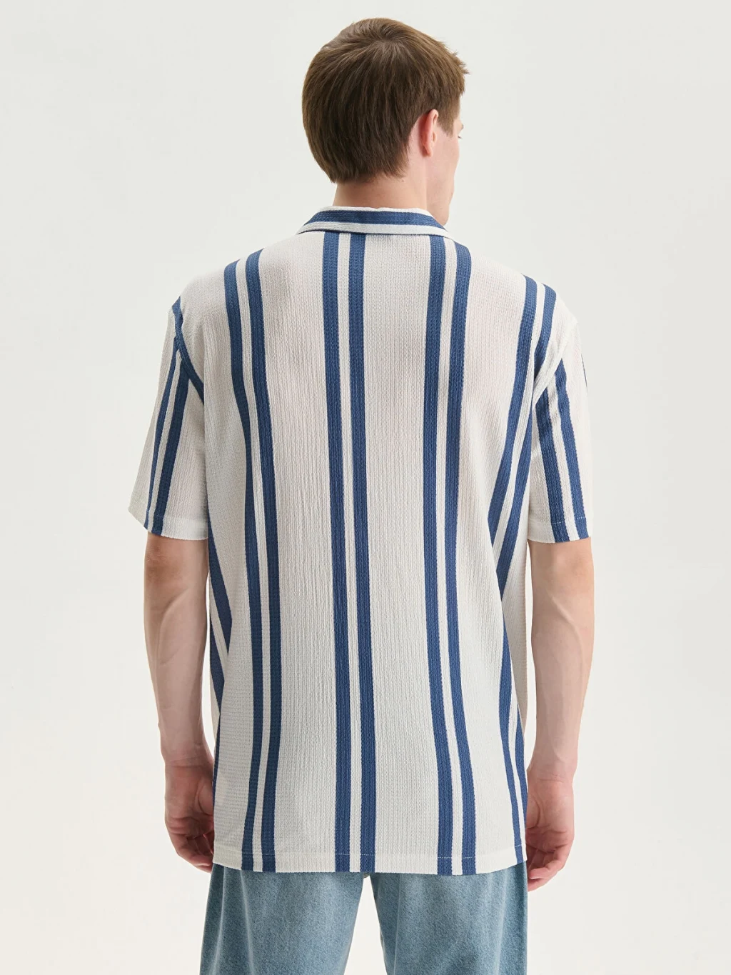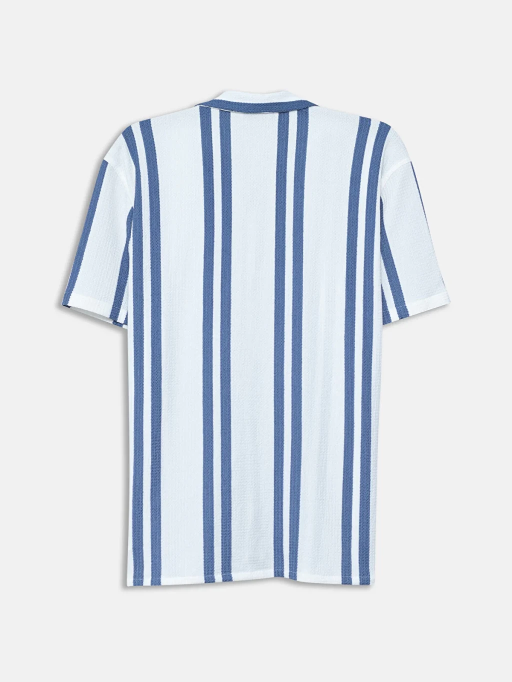 Regular fit, resort yaka, armürlü kumaş, kısa kollu ve çizgili tasarım.