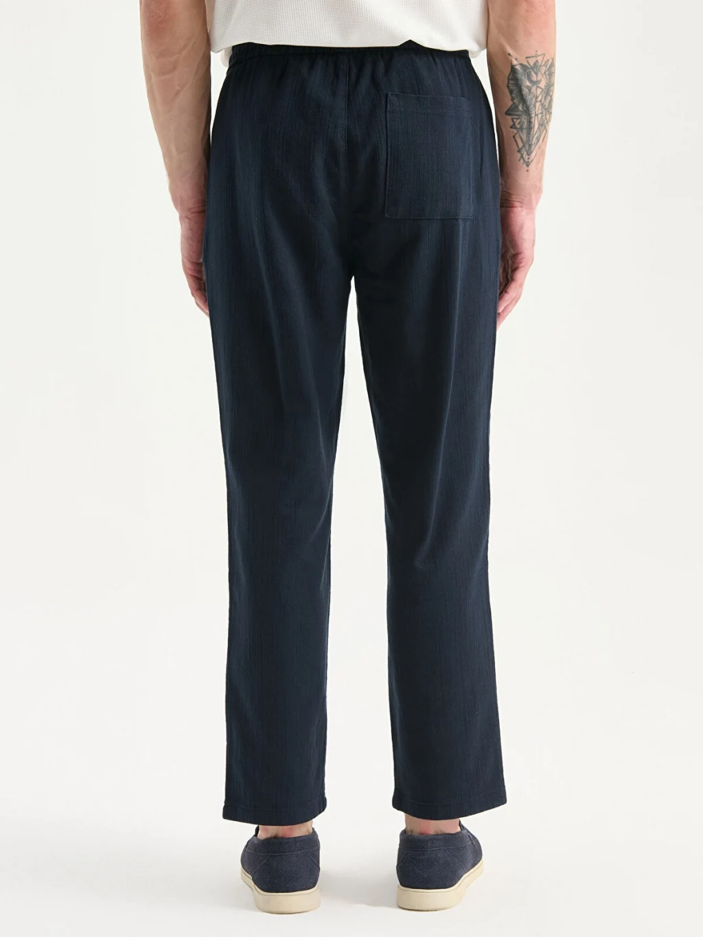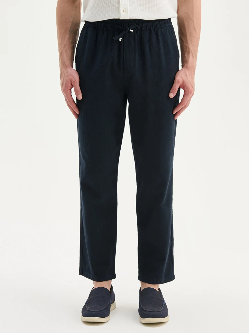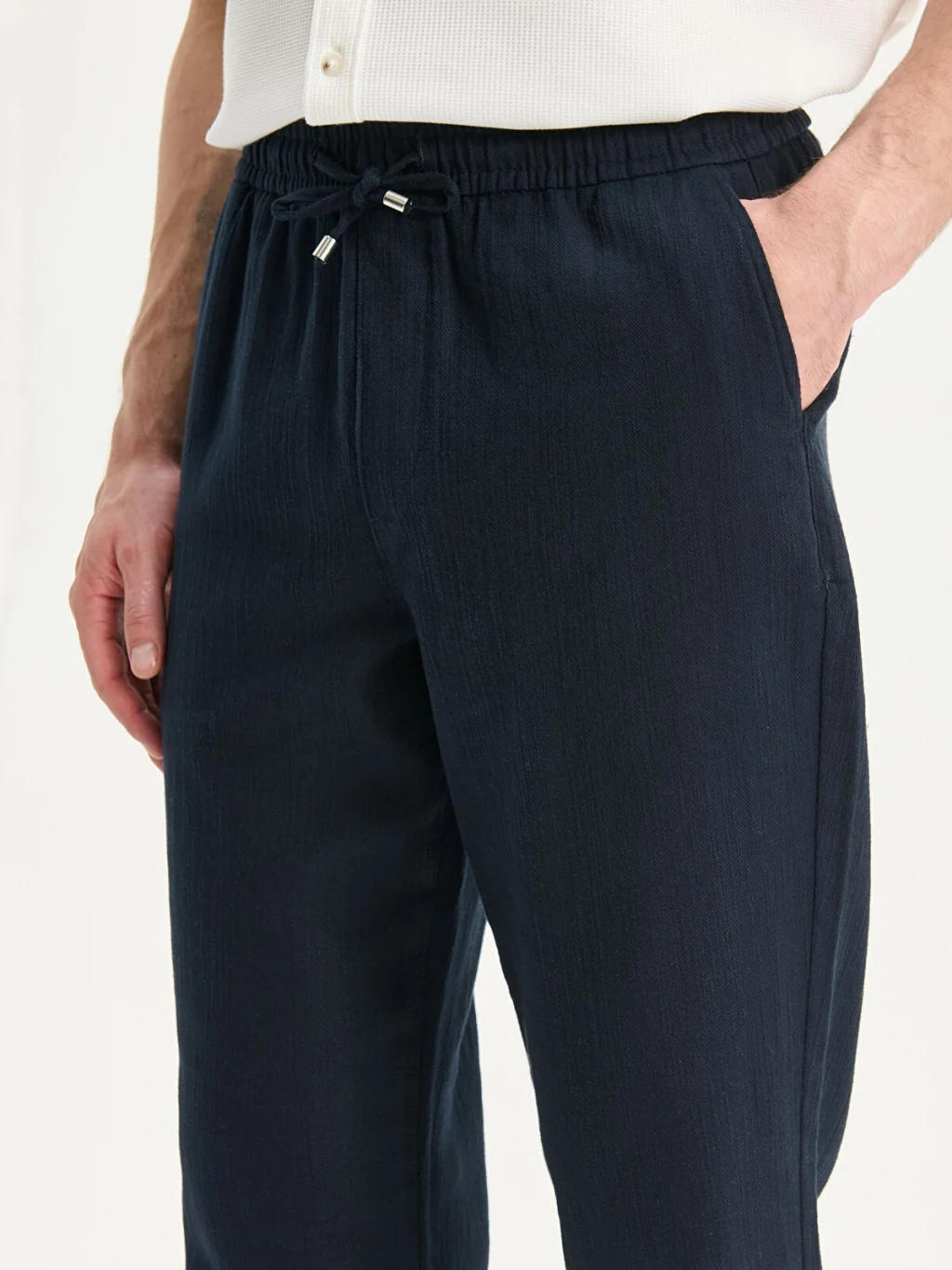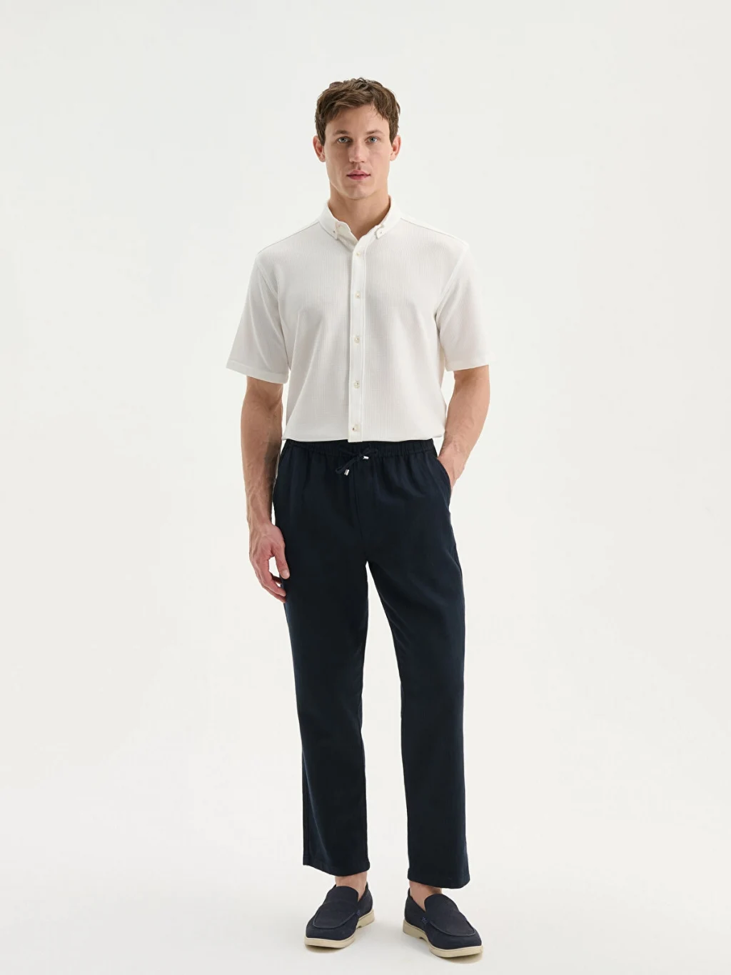 Standart kalıp tasarıma sahip erkek pantolon, keten görünümlü kumaştan üretilmiştir.
