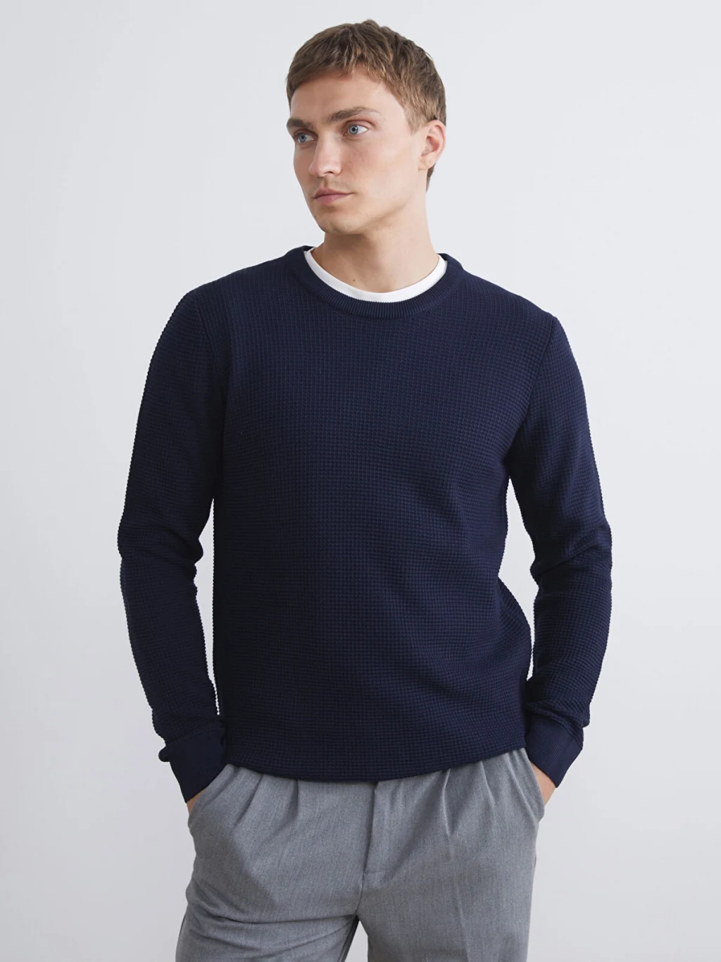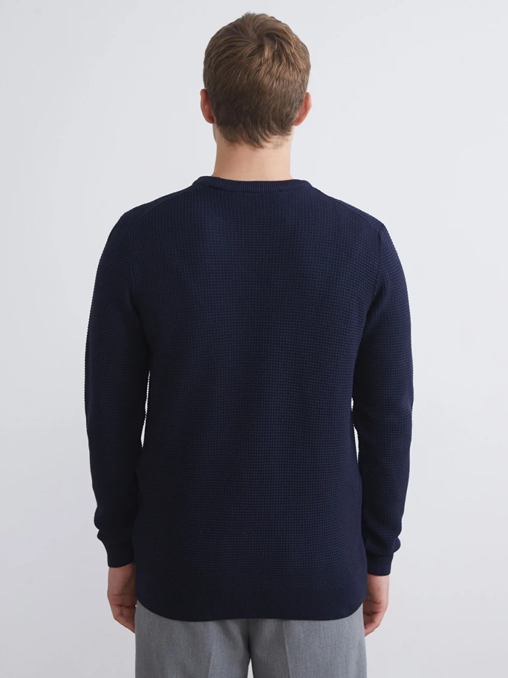 Bisiklet yaka tasarıma sahip bu erkek triko kazak, yumuşak dokulu kumaştan üretilmiştir.