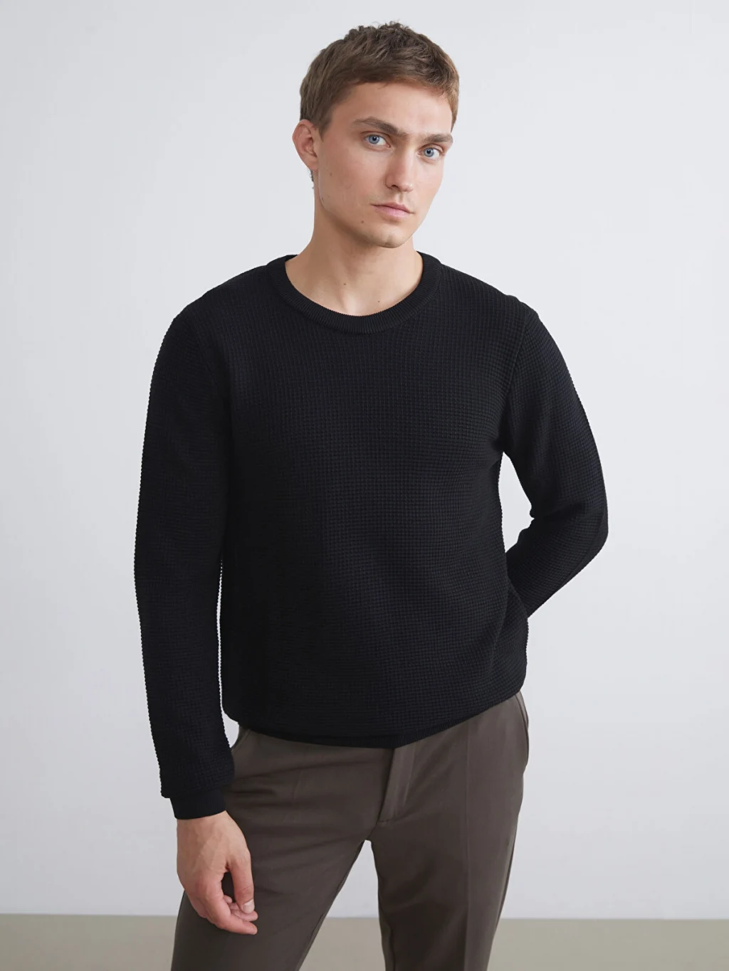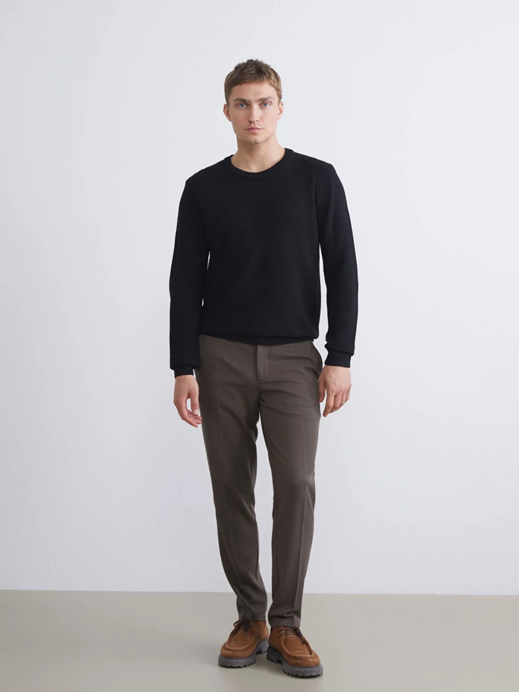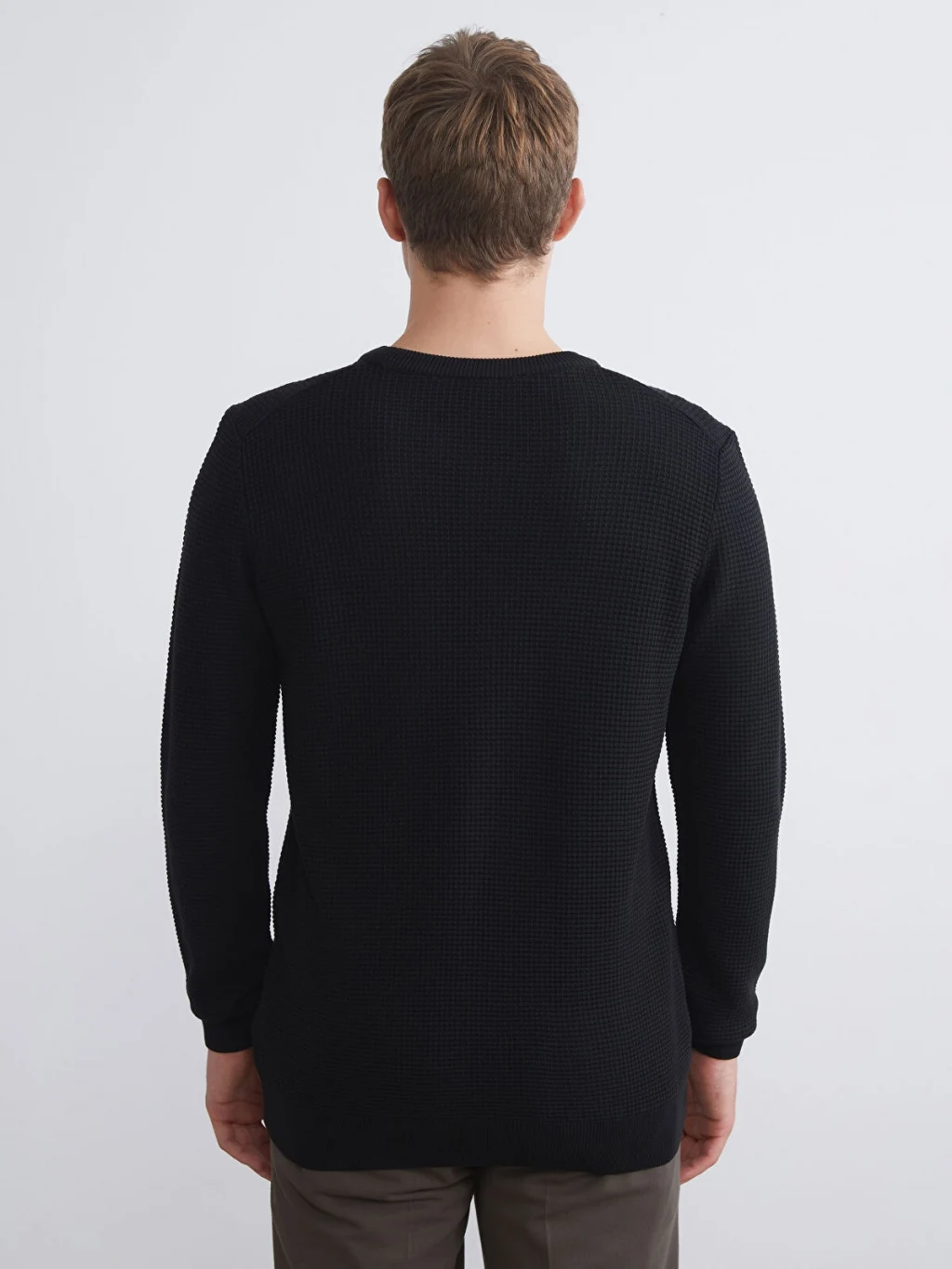 Bisiklet yaka tasarıma sahip bu erkek triko kazak, yumuşak dokulu kumaştan üretilmiştir.