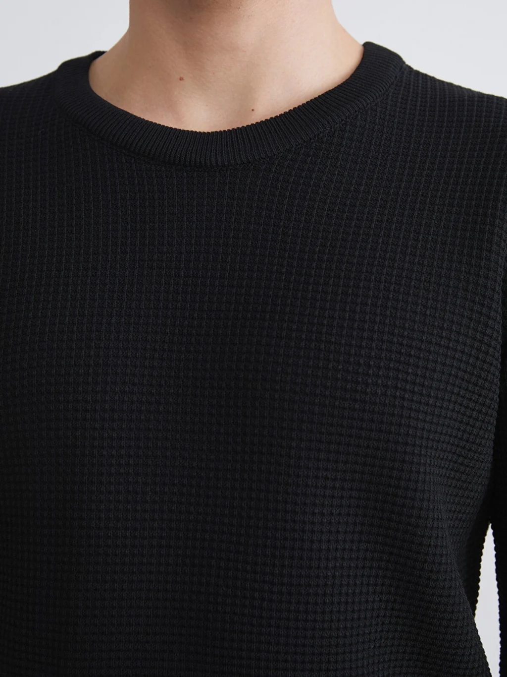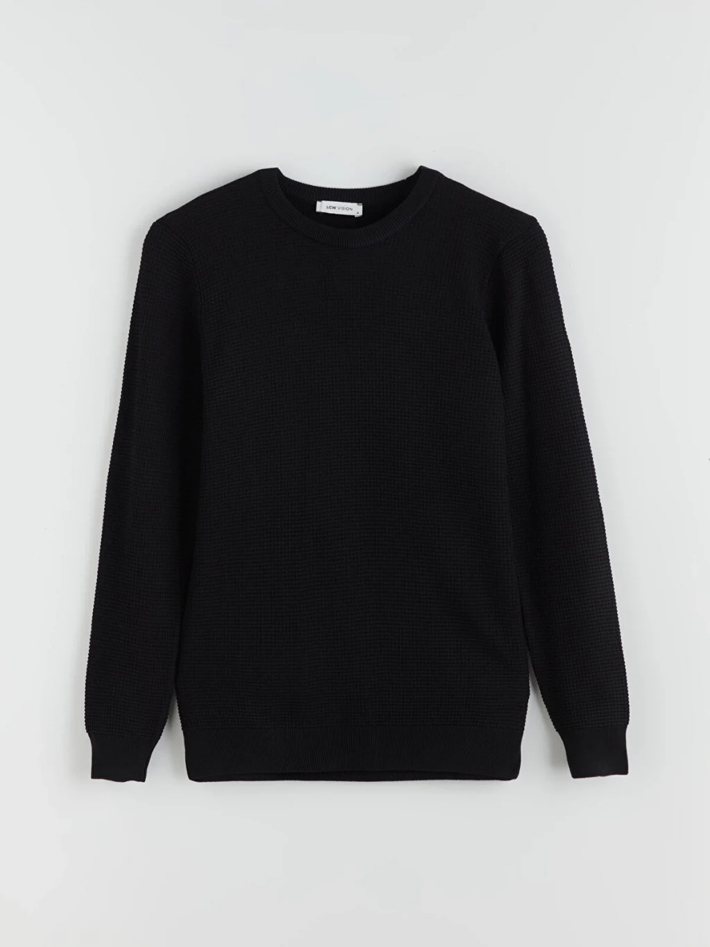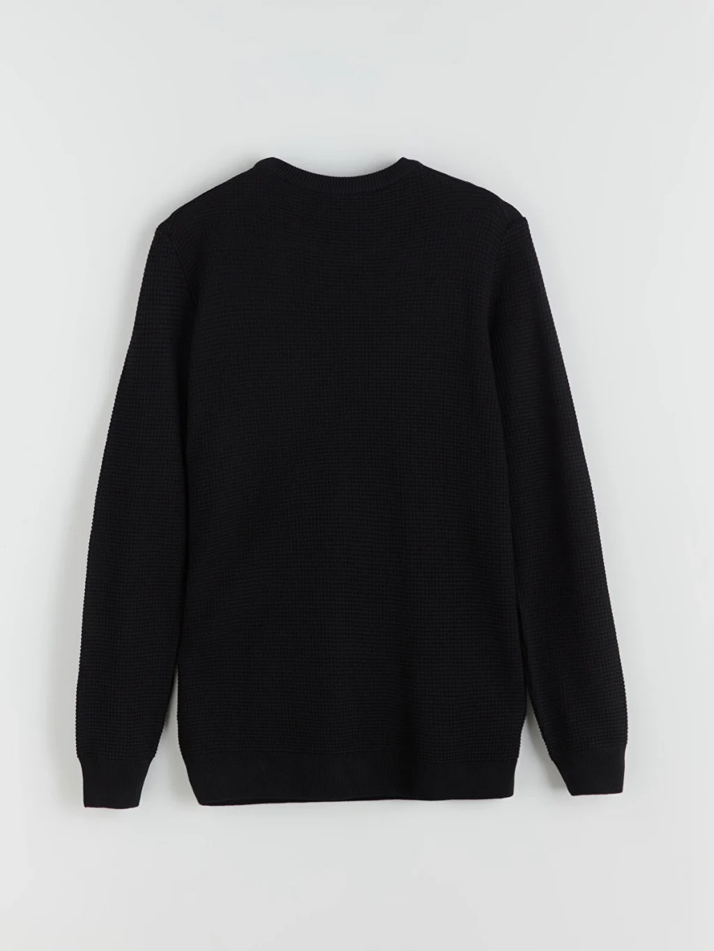 Bisiklet yaka tasarıma sahip bu erkek triko kazak, yumuşak dokulu kumaştan üretilmiştir.