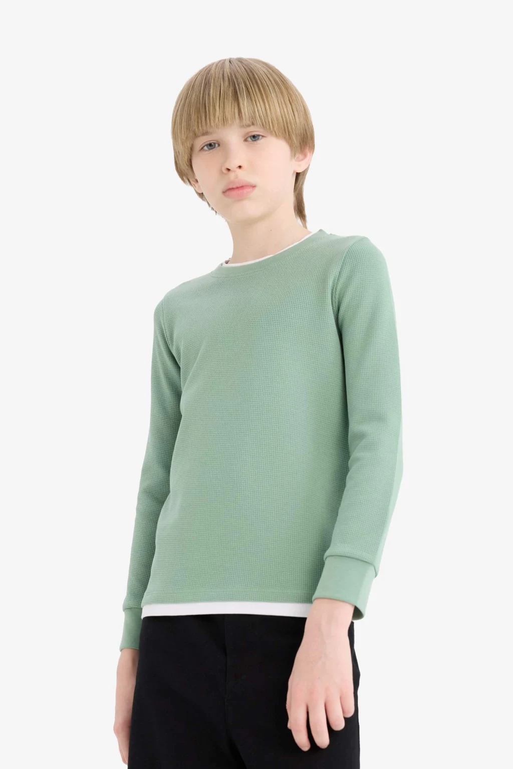 Defacto V1186 Yeşil Erkek Çocuk Bisiklet Yaka Basic Düz Waffle Uzun Kollu Okul Tişörtü