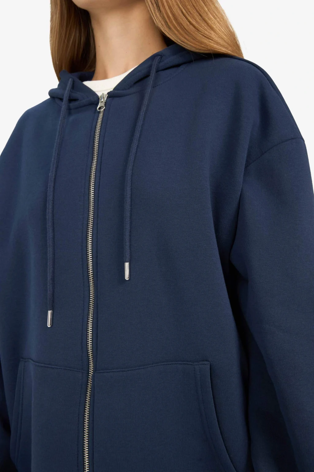 Oversize geniş kalıbıyla rahatlık ve şıklığı bir arada sunan kapüşonlu fermuarlı sweatshirt, günlük kombinlere modern bir dokunuş katıyor. Yumuşak kumaşıyla konforlu bir kullanım sağlar.