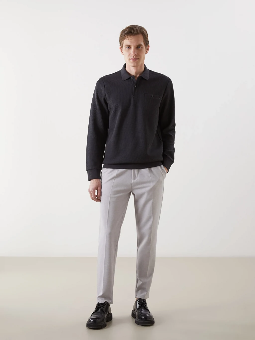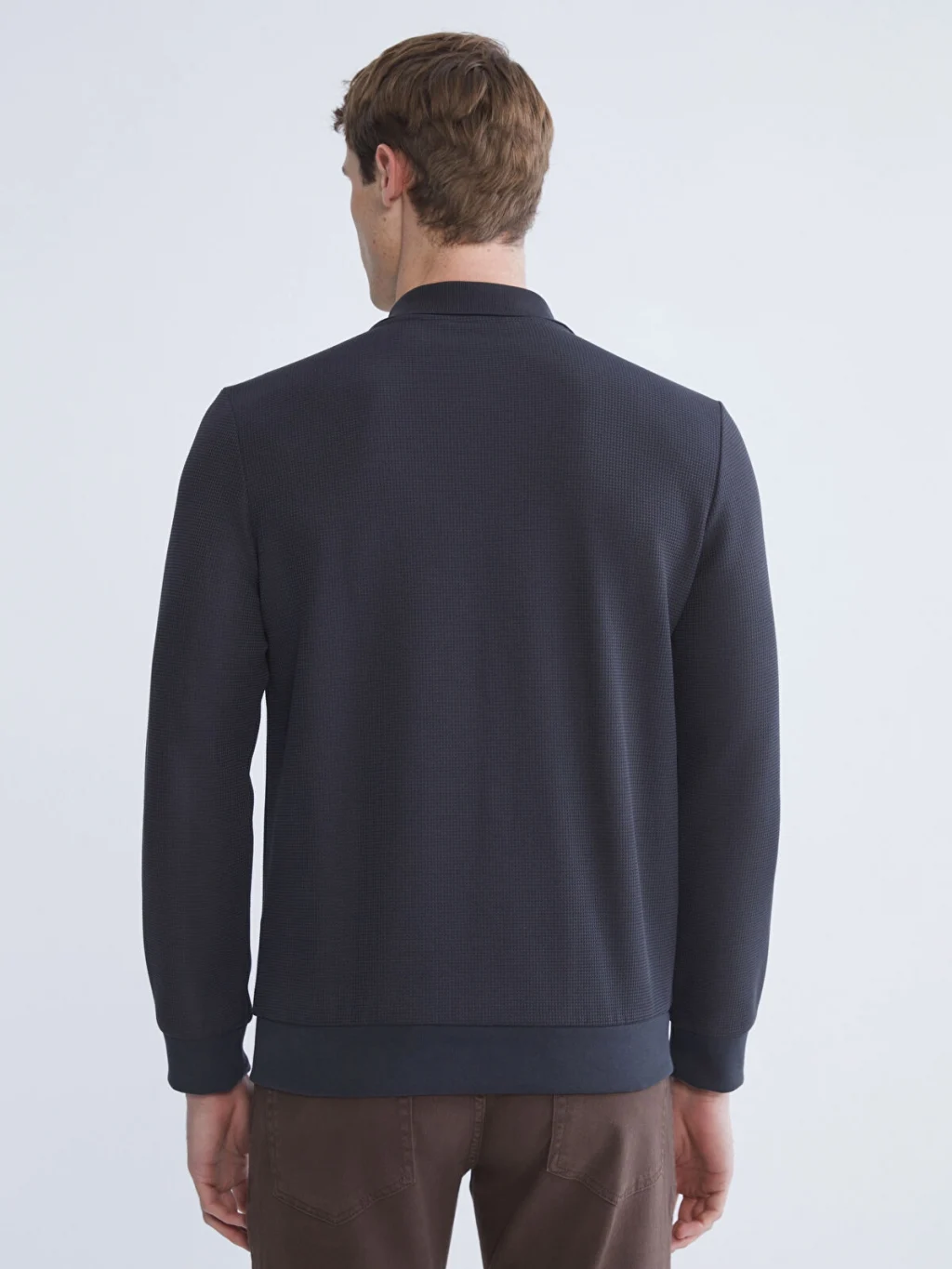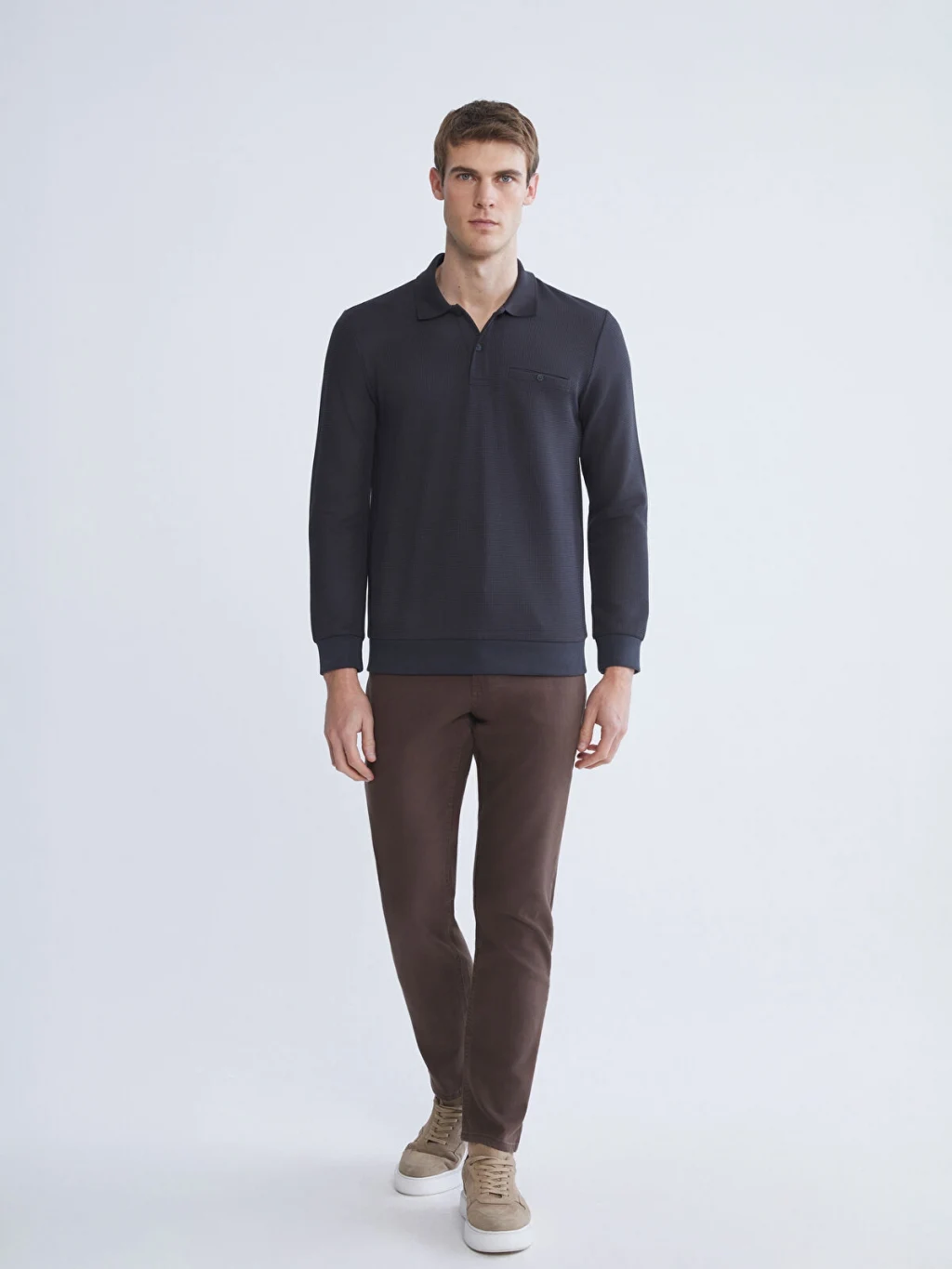 Polo yaka, uzun kollu erkek sweatshirt, strüktürlü kumaştan üretilmiştir. Düğme kapamalıdır ve göğüs cebi bulunur. Kol ve etek ucu ribanalıdır.