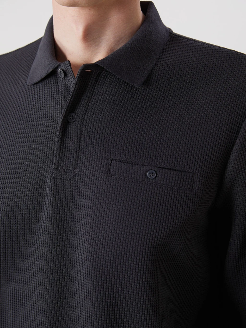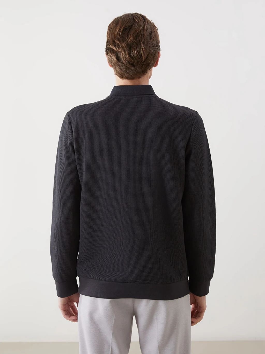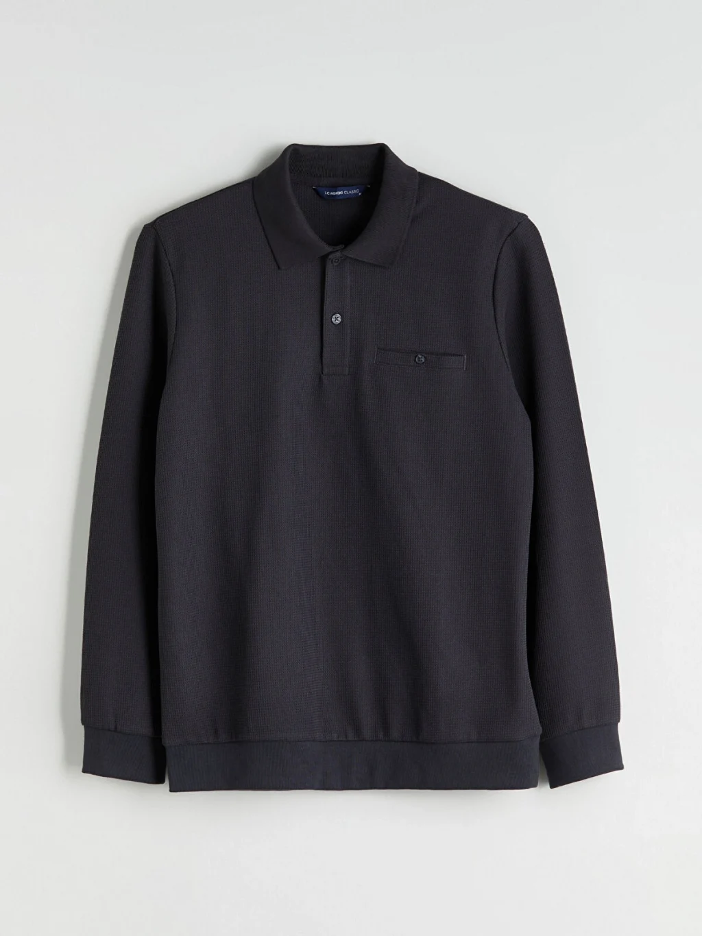 Polo yaka, uzun kollu erkek sweatshirt, strüktürlü kumaştan üretilmiştir. Düğme kapamalıdır ve göğüs cebi bulunur. Kol ve etek ucu ribanalıdır.