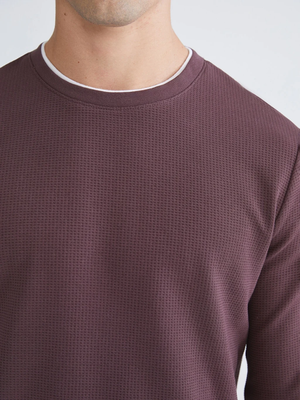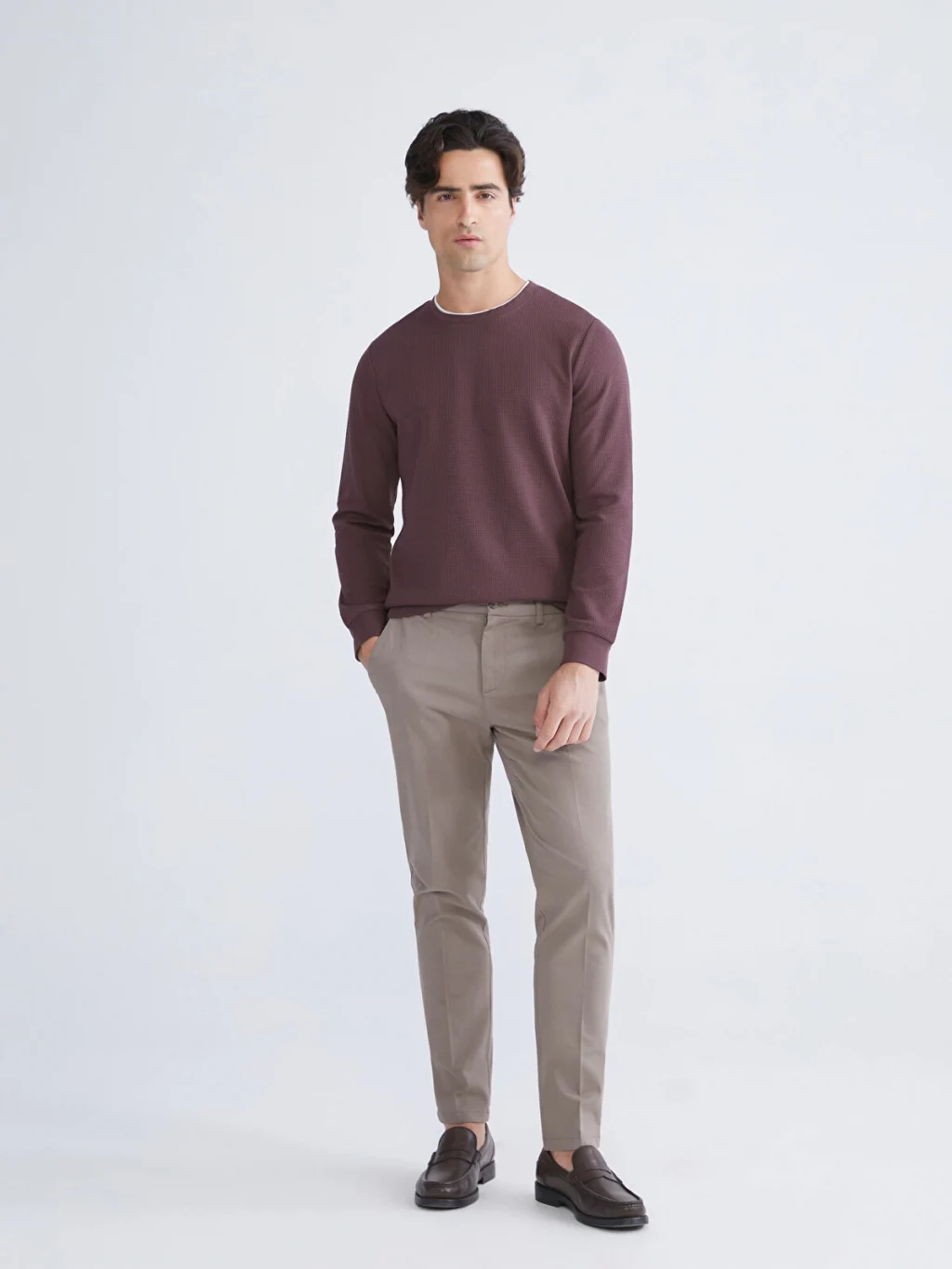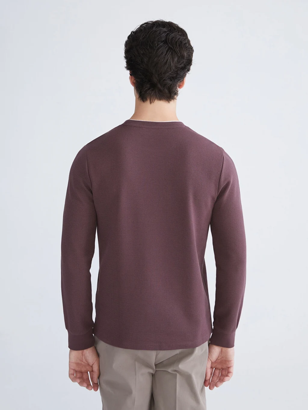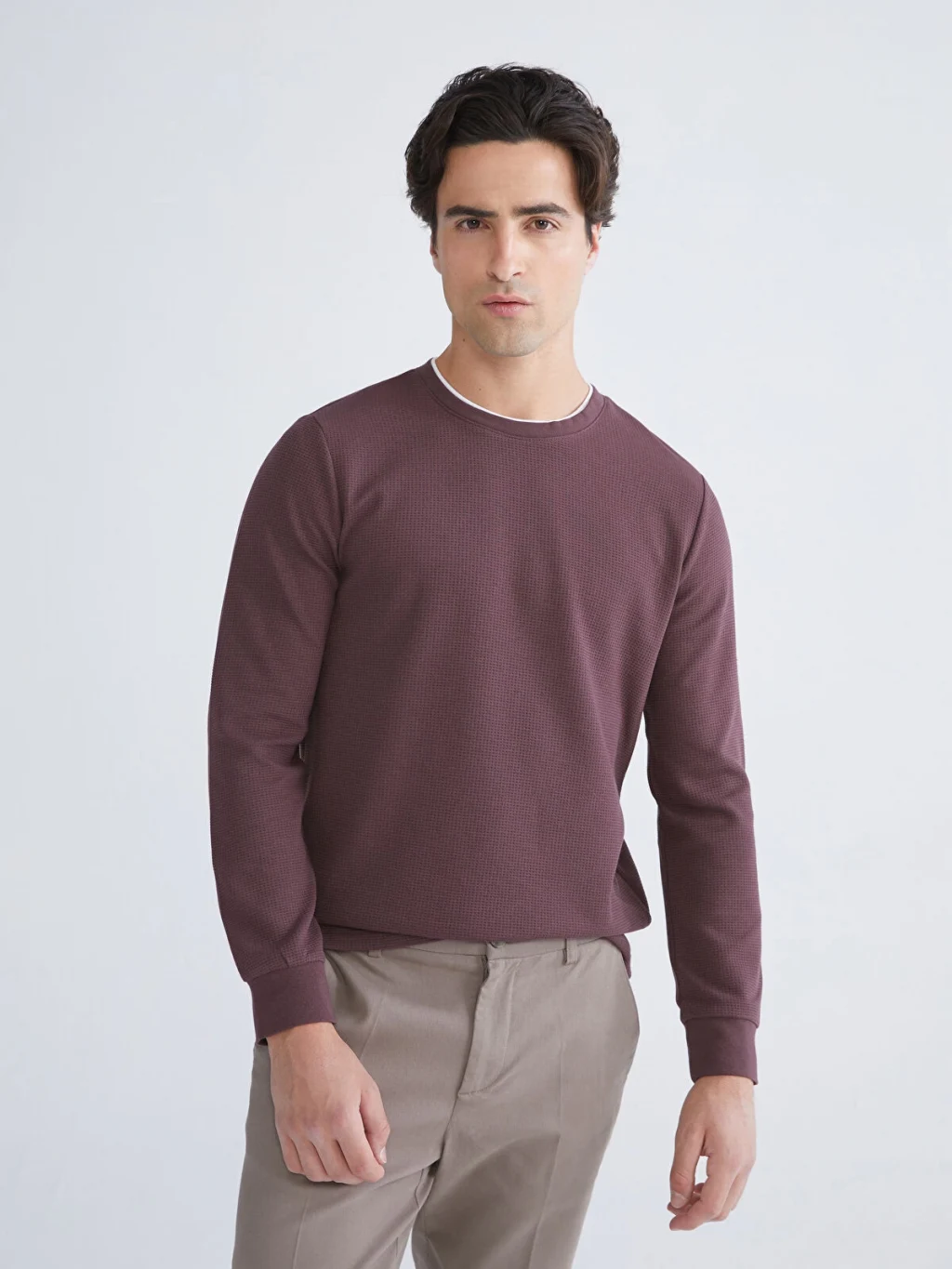Bisiklet yakalı ve uzun kollu erkek sweatshirt, strüktürlü kumaştan üretilmiştir. Yaka kenarı biyelidir, kol ve etek ucu ribanalıdır.