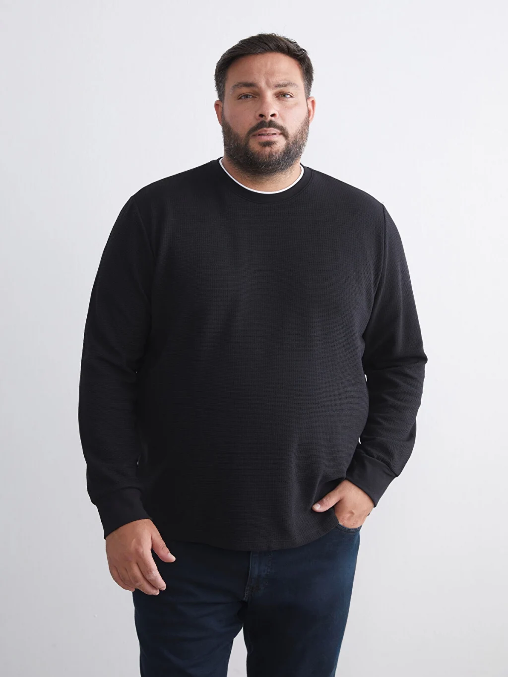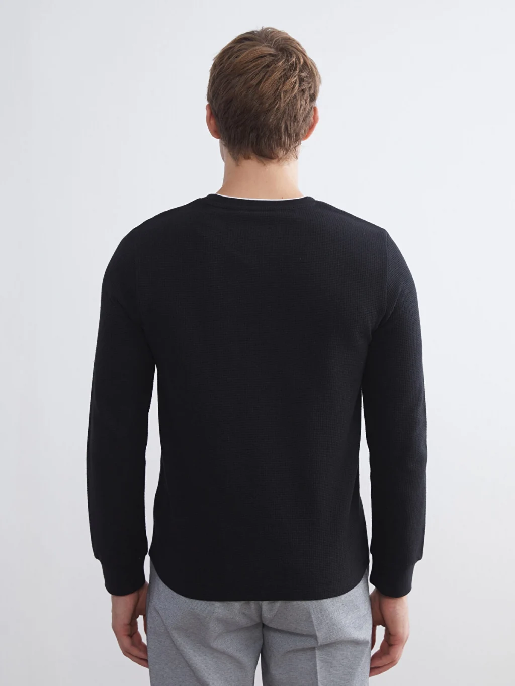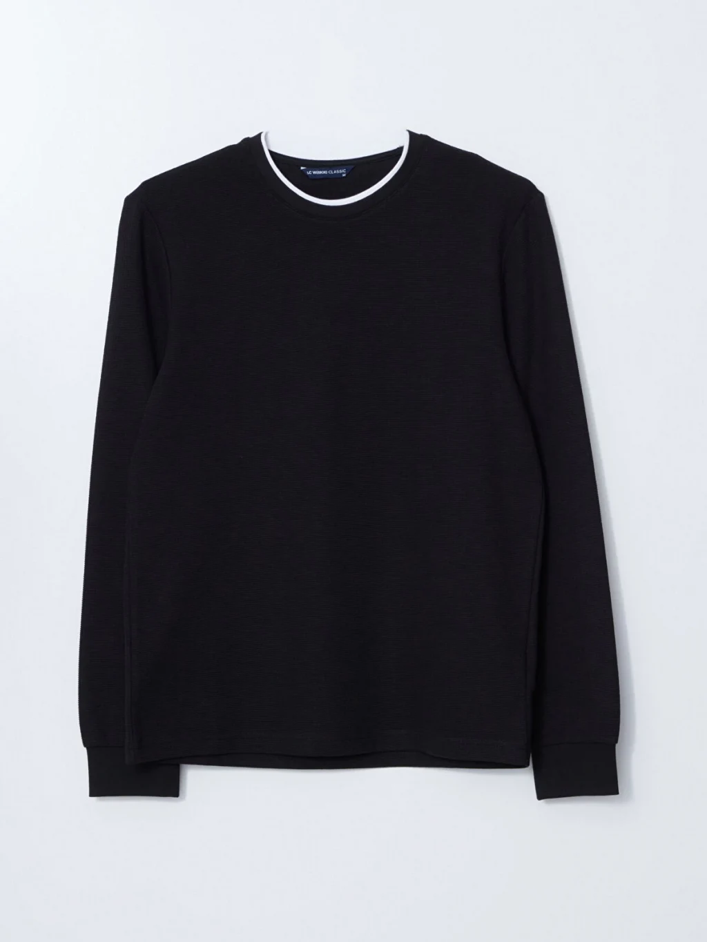 Bisiklet yakalı ve uzun kollu erkek sweatshirt, strüktürlü kumaştan üretilmiştir. Yaka kenarı biyelidir, kol ve etek ucu ribanalıdır.