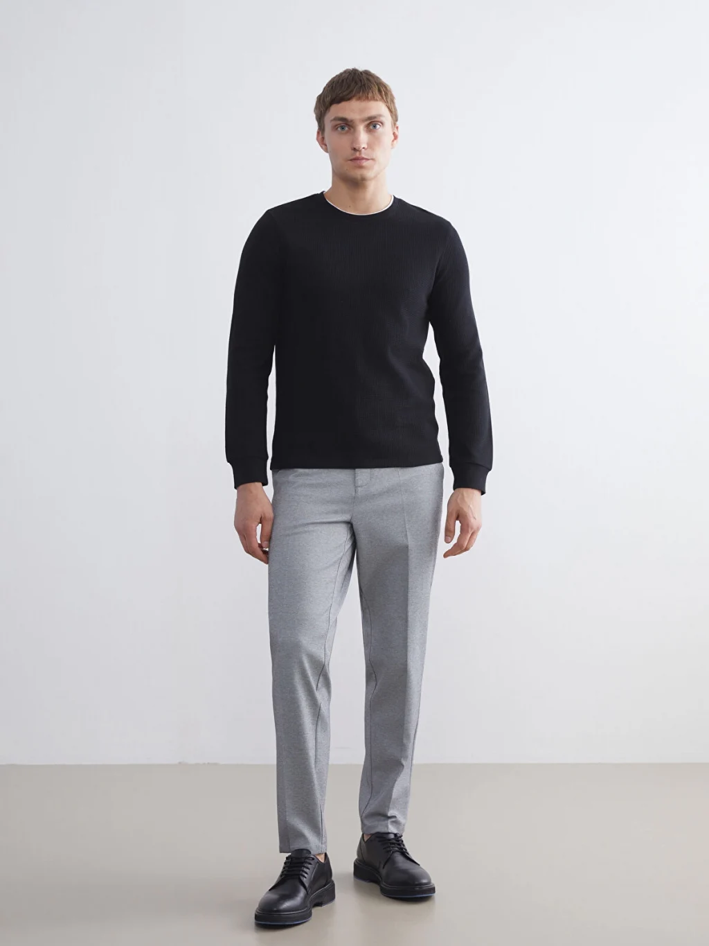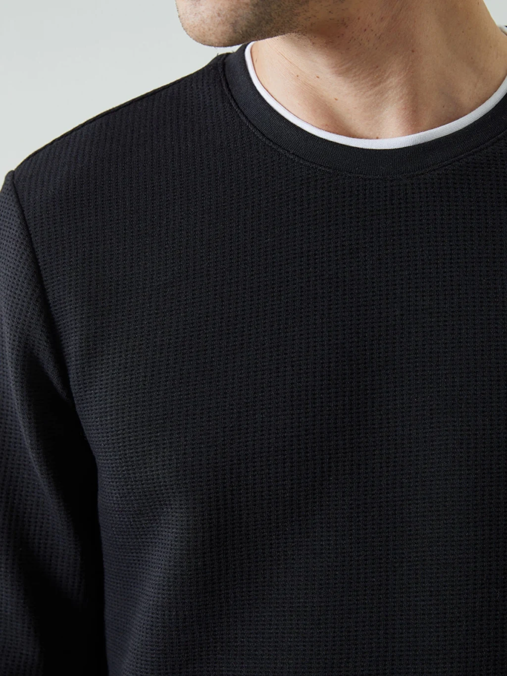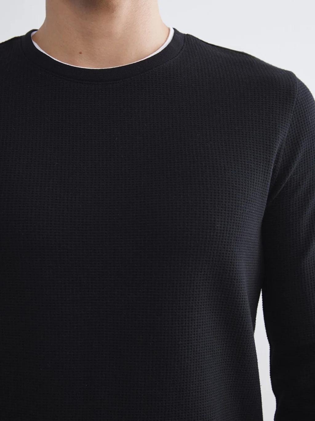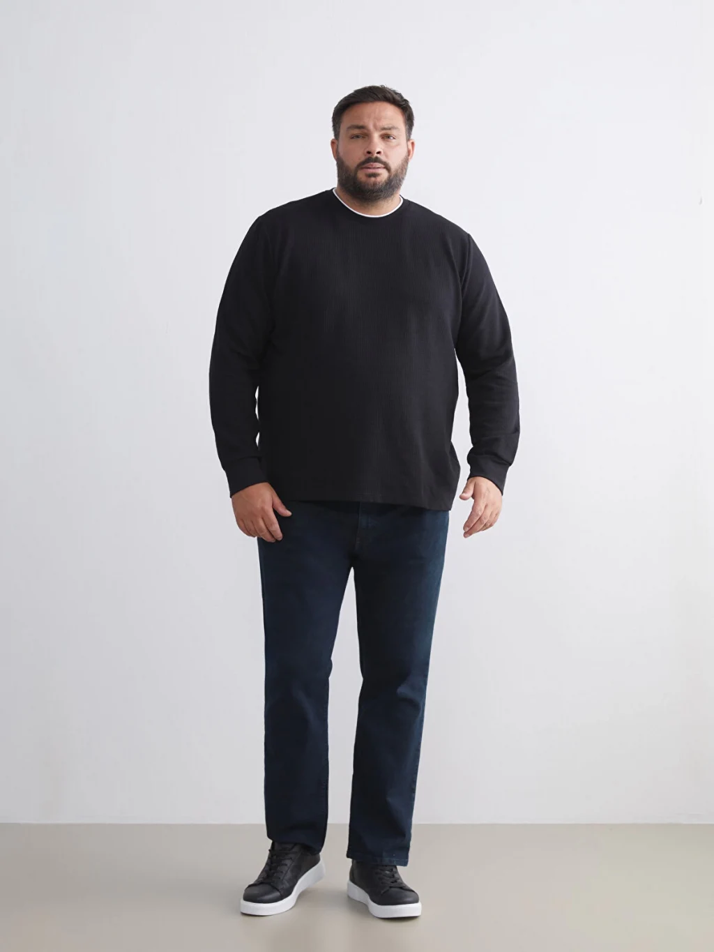 Bisiklet yakalı ve uzun kollu erkek sweatshirt, strüktürlü kumaştan üretilmiştir. Yaka kenarı biyelidir, kol ve etek ucu ribanalıdır.