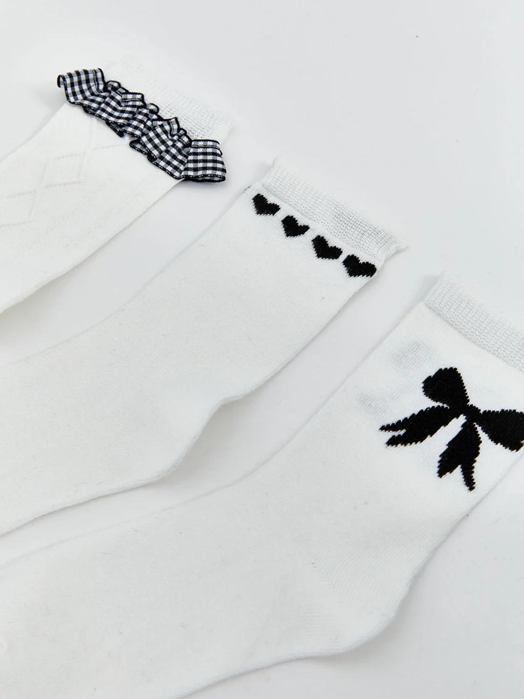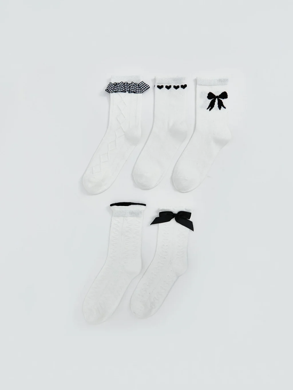Pamuk karışımlı esnek kumaştan üretilen kız çocuk 5'li soket çorap, desenli ve fiyonk detaylı tasarıma sahiptir.