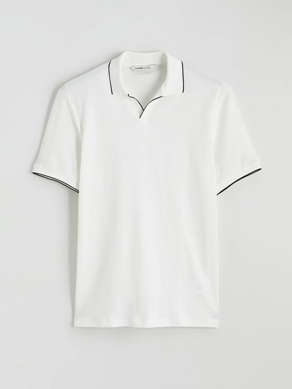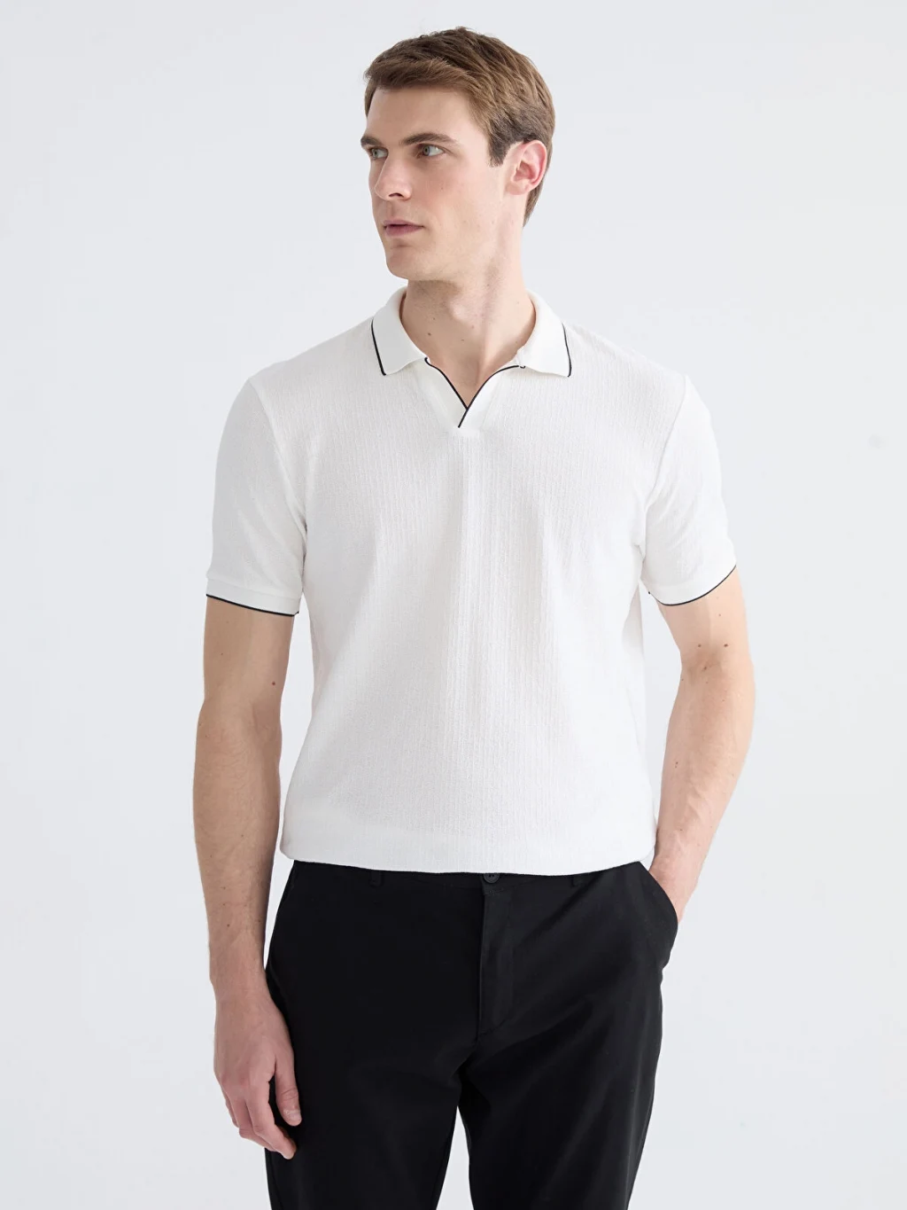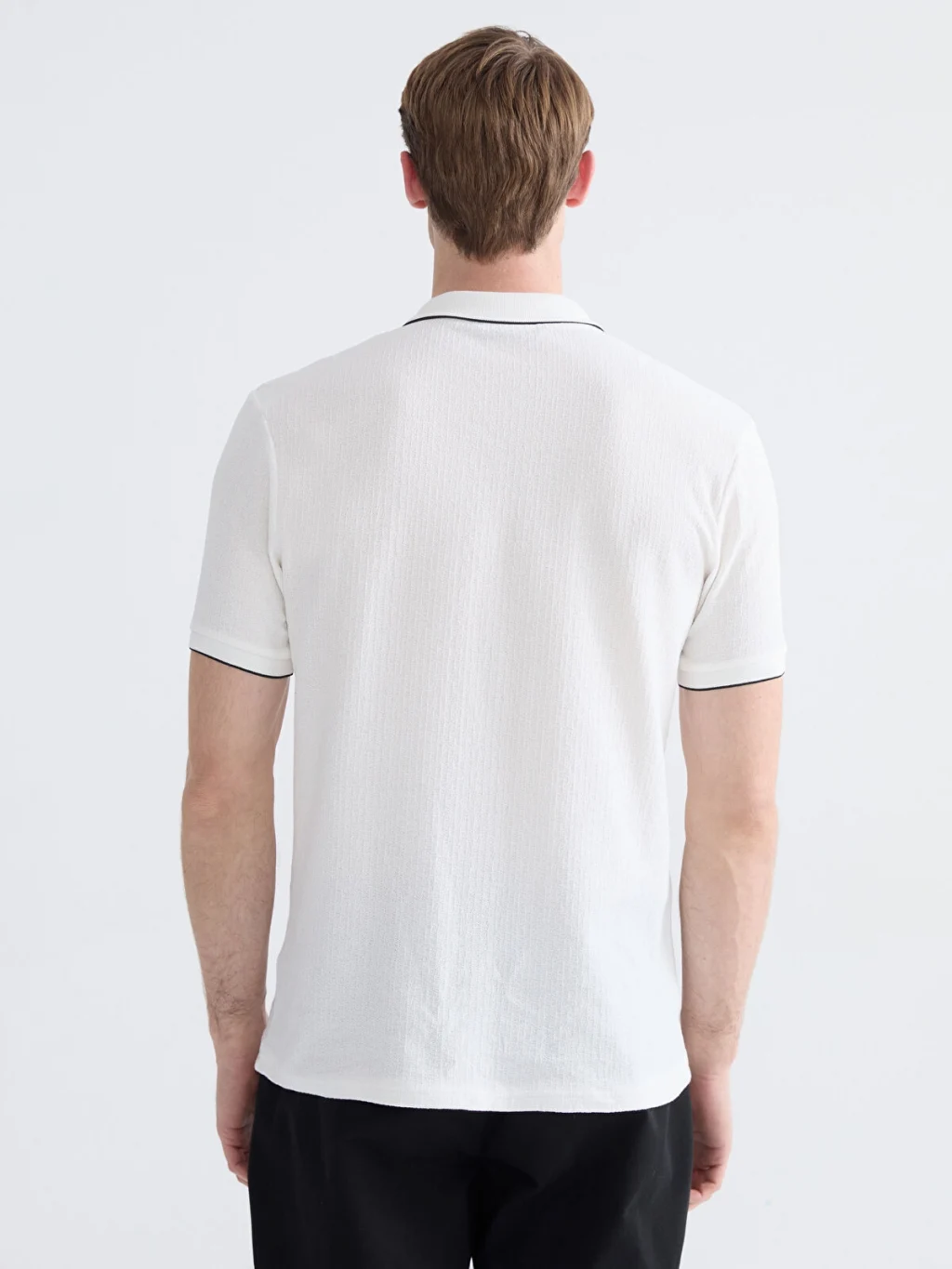 Standart kalıp, polo yakalı erkek tişört, %100 pamuklu strüktürlü kumaştan üretilmiştir. Kısa kollu olup, yaka ve kol ucu kenarları biyelidir.